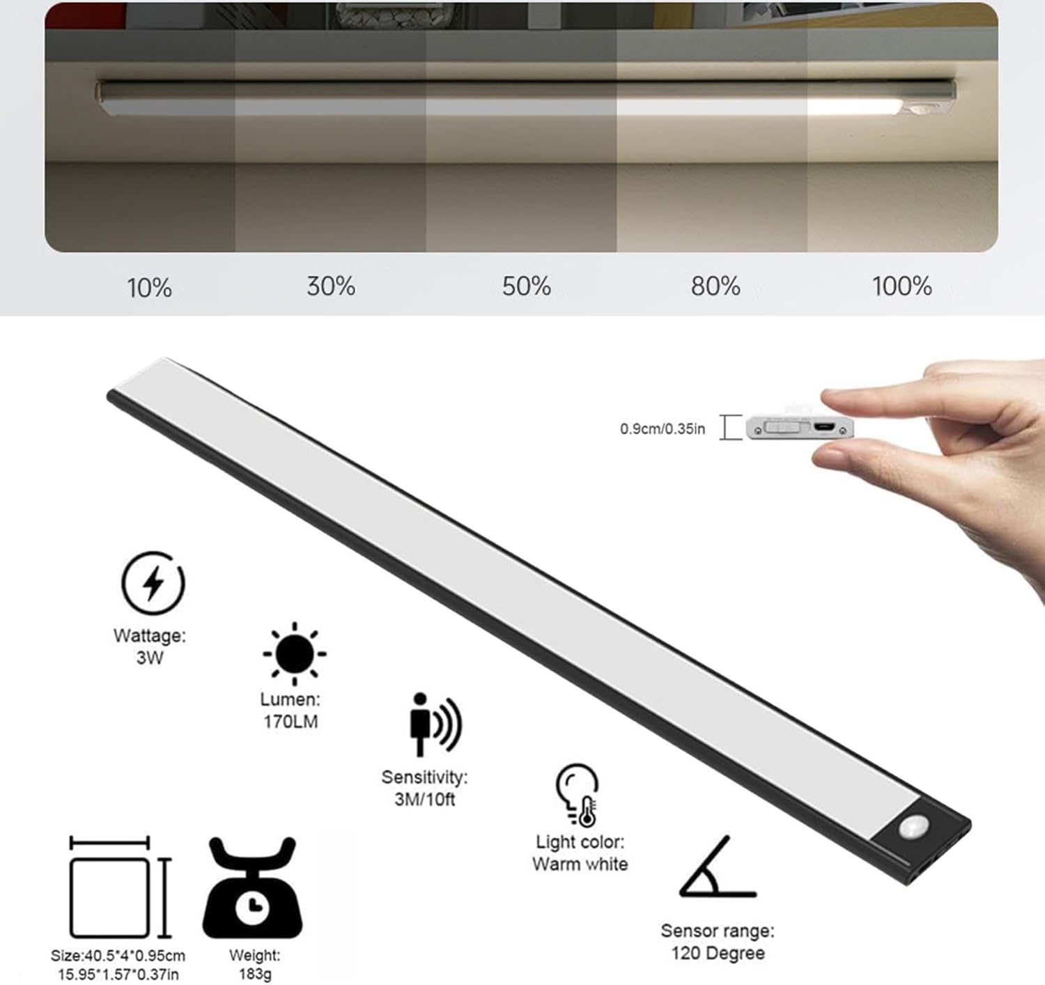 Auto On/Off with Energy-Saving Mode – Equipped with smart motion activation, the light automatically turns on in the dark when movement is detected and turns off after 20 seconds of inactivity, maximizing battery life Easy to Install: These indoor motion lights have built-in powerful magnets that are easy to install without the need for an electrician. It can be attached directly to iron surfaces. Or use the included adhesive metal plate to stick it anywhere you want 3 adjustable colour modes: Choose between warm white, cool white, and natural light to create the perfect ambiance for your closet, kitchen, hallway, or cabinet Reechargeable And Long Lasting Battery: Easily charge it with a Type-C cable and enjoy hours of illumination without worrying about replacing the battery. In automatic mode, it lasts 50-70 days and illuminates 20 times a day for 25 seconds. It can be used even during power outages to ensure continuity of lighting