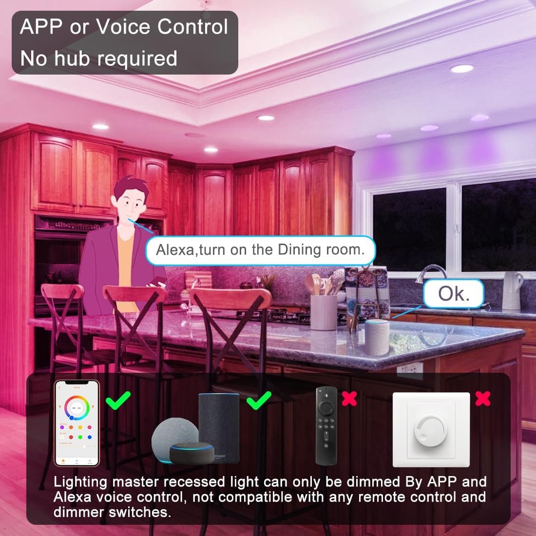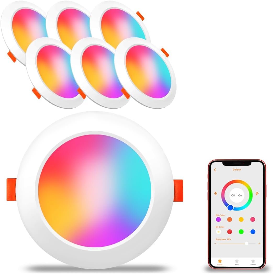 [Smart voice control] Smart RGBCW Recessed Lighting is compatible with Alexa voice control light. Support one-step connection. Just say "find the device" to the speaker, and then you turn on the ceiling light. A simple conversation can let you turn on and off the lights, set the color of each light, and dim the lights to match your favorite scenes (such as home theater, bathroom, yoga, game room, etc.). The operation is simple. 【 LED tube light RGB+CT 】 Non invasive embedded lighting has 16 million static RGB colors in RGBCW, with adjustable color temperature ranging from 2700K to 6000K (warm white, sunny, and cool white), and multiple dynamic modes to choose from. In addition, all colors can be changed from 1% to 100% as needed. There is no registration or wireless network connection, no additional accessories such as hubs or gateways, and no remote control. [APP Control & No Internet Required]Download the "BRmesh" APP,turn on the Bluetooth of the mobile phone,click on the home page to add an,and it will automatically connect.No registration required, no internet required.Then you could easily control multiple smart downlights via your phone,enjoying lights color change,dimming and group control ets.(Note: No remote control is required.) [BT Mesh Technology] Smart downlight is equipped with Bluetooth 5.0 chip to realize mesh function. Does not occupy the router broadband, and is stable and does not drop the line. A simple application gives you the freedom to control any number of lights (up to 125 lights). BT Mesh is an excellent solution for multi-lamp control, which solves the shortcomings of short control distance of IR remote control lamp, few lamps and disconnection of WIFI lamp due to network speed. [DIY Scene & Music Synchronization] You can set the color or mode of each lamp to match your favorite scenes (such as home theater, bathroom, yoga, etc. ), only need a button to start after saving; 23 different dynamic modes are provided. When multiple lights are activated at the same time, the rhythm of color change can be kept consistent. [Easy to install] The outer diameter of the LED downlight is Ø6.25in,Ceiling cutout: 5.7-6.2in,the suitable installation depth: 1.57in, the installation is convenient and safe. It is suitable for installation and use in different places , such as home,hotel,coffee shop, restaurant,Bar,game room,etc.