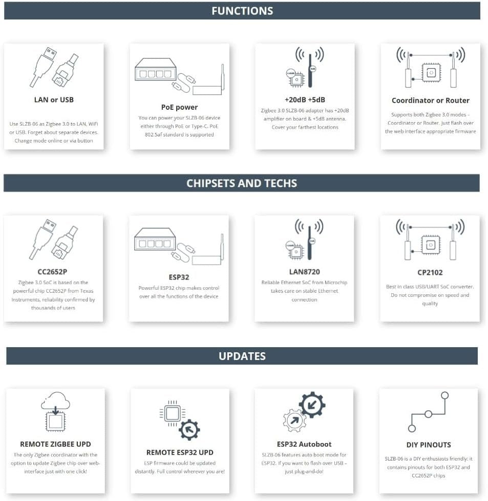 1.SLZB-06 NoPOE is a Zigbee to Ethernet/USB/WiFi adapter, comes pre-flashed and ready to use. Can be used as a Zigbee 3.0 gateway in the open source automation platforms – Zigbee2MQTT, Home Assistant, ZHA.