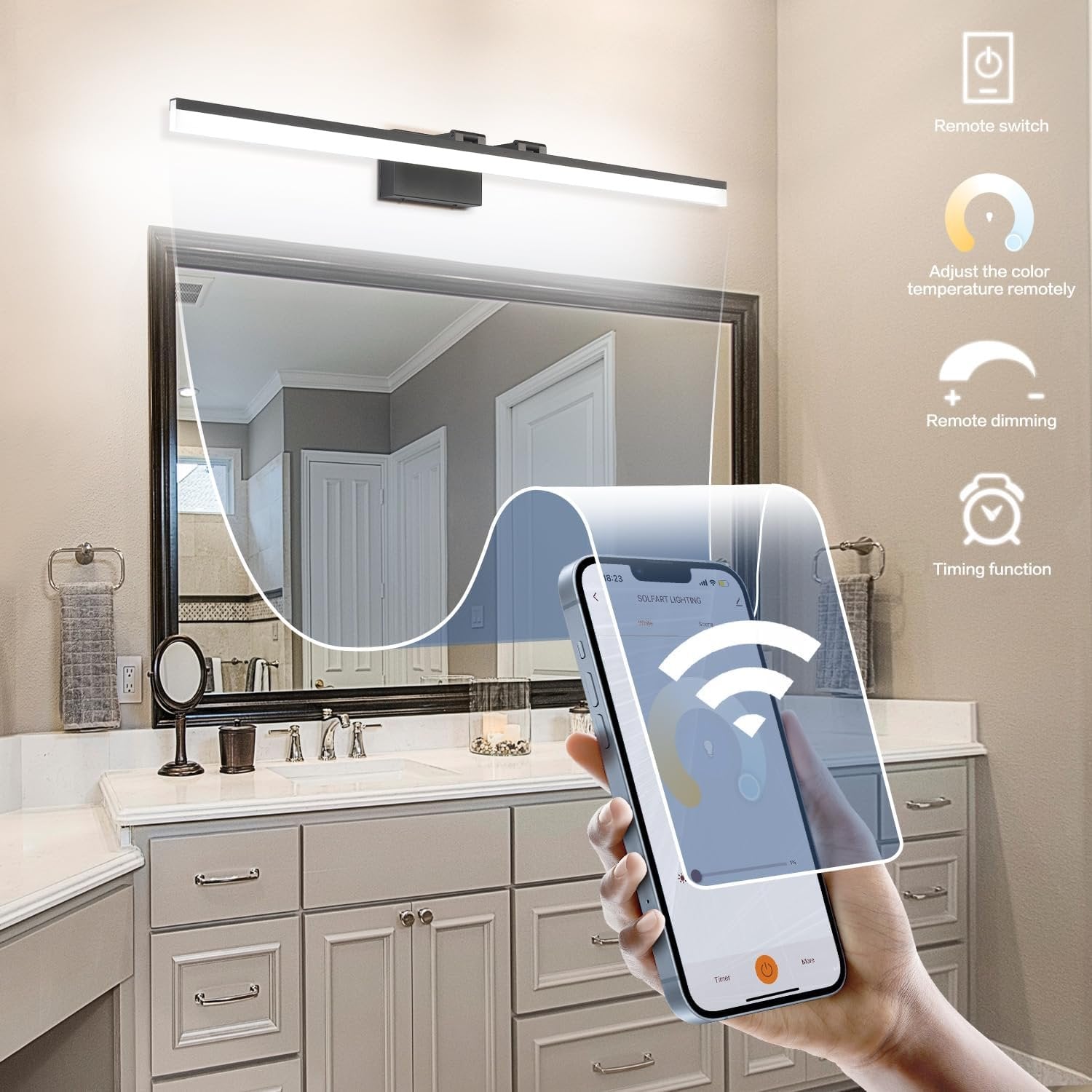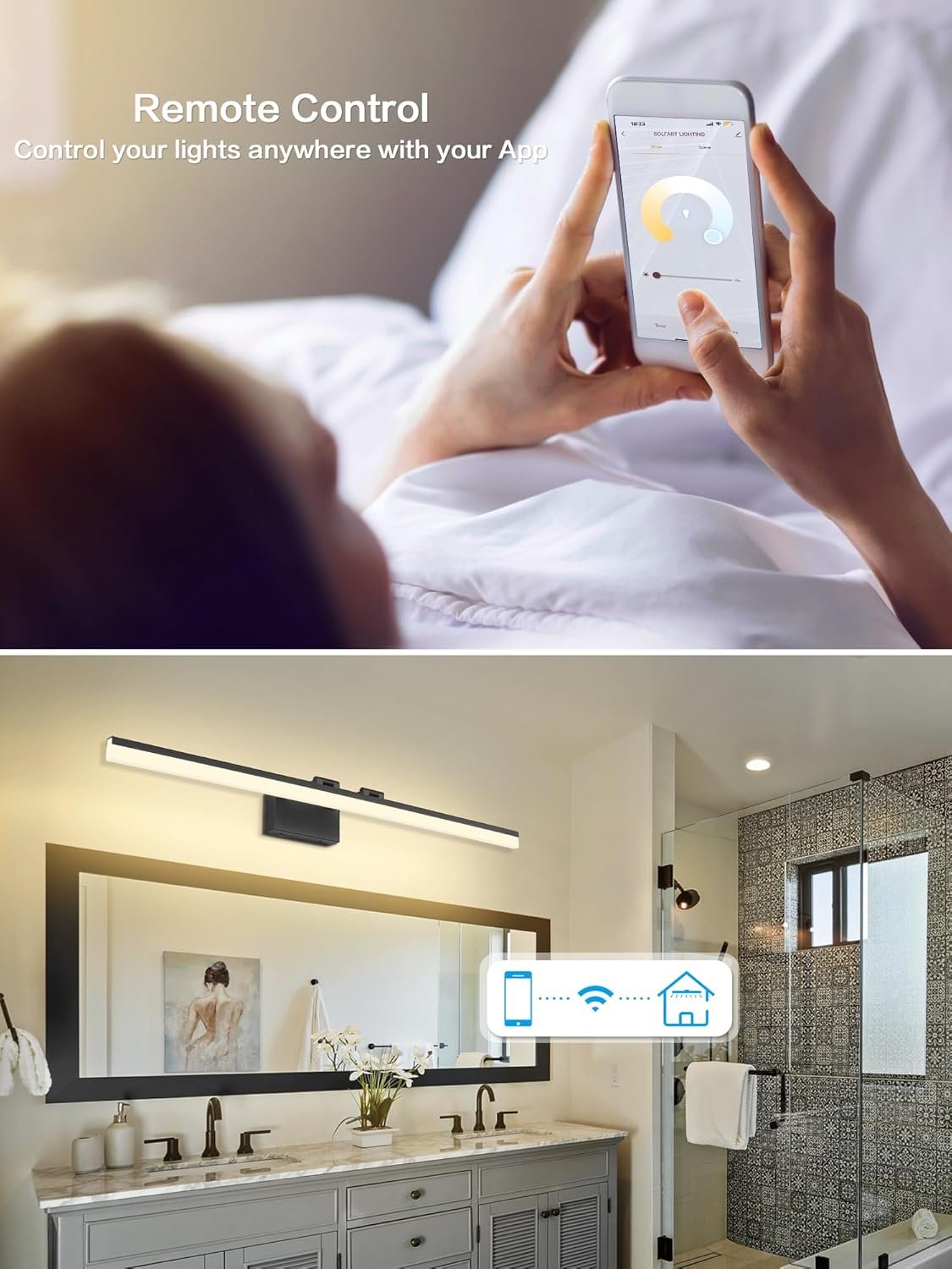 1.【EASY TO INSTALL】15-Minutes Easy Installation, LED 28 watts, hardwired, no assembly required, USA standard back plate. This modern black bathroom light fixtures directly connects to the reserved wire, and then mount to the wall. 2.【APP Remote Control】Smart Life App Remote Control Adjustable Led Vanity Light. Simple and quick setup at the app on the phone, convenient and precise usage in your life scene. APP controls multiple lights at the same time, and customizes the time to turn the light on or off. 4.【ENERGY SAVING】High color rendering 90, LED light technology saves up to 80% electricity. Lifespan up to 50,000hours.Efficient, minimalist, modern, contemporary black vanity lights for bathroom. Integrally formed, edge lines clear and smoothly contoured. App adjust light color 3000k to 6000k & brightness 0%-100%. 5.【AFTER-SALE SERVICE】Our bathroom light fixtures warranty is 2 years. Contact us at any time, and we will reply within 24 hours. Please log in to your account, check the order ID, and click "Contact Seller" to contact us. Customer satisfaction is always our pursuit.