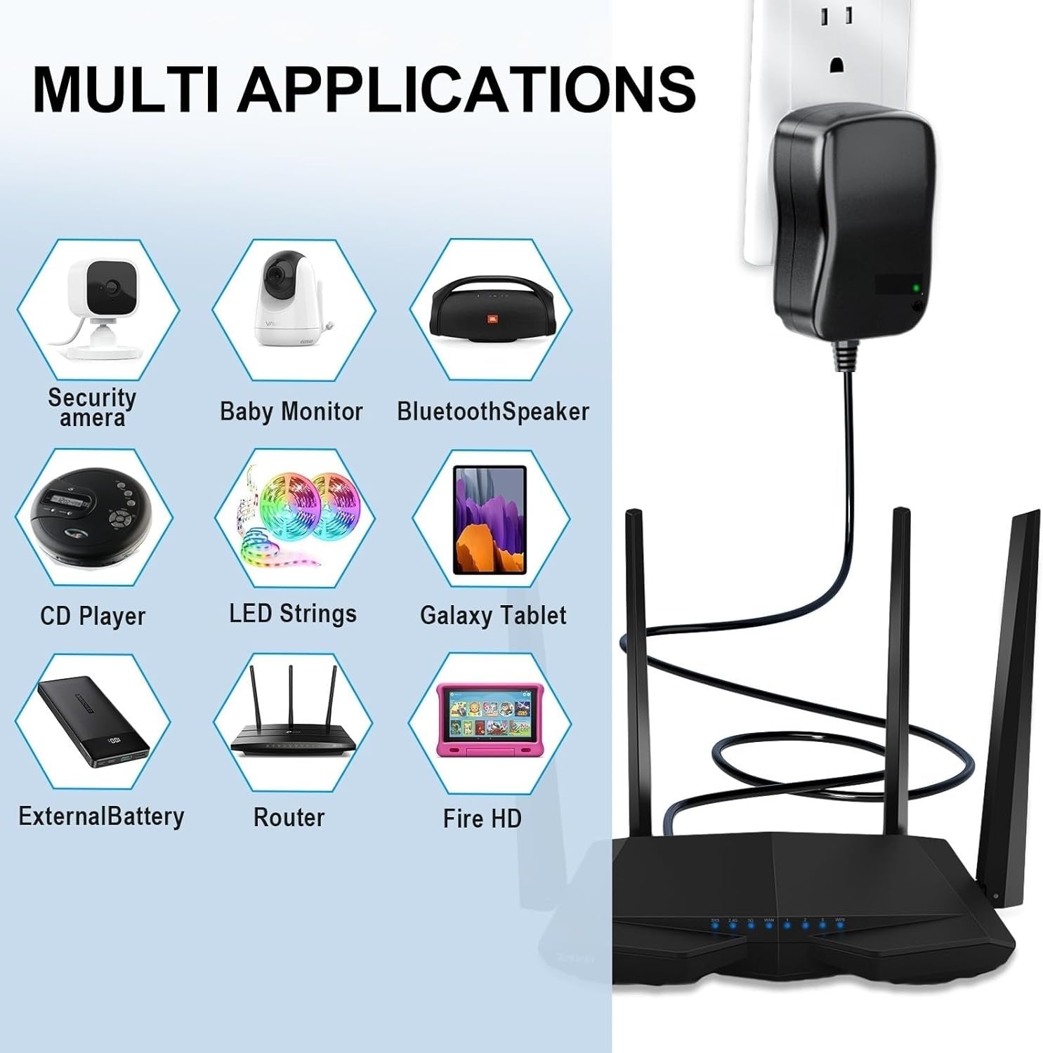 SAFE AC/DC ADAPTER: Input: AC100-240V 50/60Hz, Output: DC 3V/ 4.5V/ 5V/ 6V/ 7.5V/ 9V/ 12V 0-2A, USB Port: 5V 1.2A, Cord: 5 FT/150cm; Smart chip with built-in advanced safety technology, with comprehensive protection against overvoltage/overcurrent/short circuit/overtemperature POWER SUPPLY WITH MULTI VOLTAGE: Lost or damaged power supplies can be easily replaced, Great design having the volt selector on the wall side & a thoughtful touch to include a key for selecting the desired voltage, which includes 12 Volt 9 Volt 5 Volt 7.5 Volt 6 Volt 4.5 Volt 3 Volt voltage output 8 VERSATILE ADAPTER PLUGS: power supply optional size tips: 5.5*2.1 mm, 4.8*1.7 mm, 4.0*1.7 mm, 3.5*1.35 mm, 3.0*1.1 mm, 2.5*0.7 mm, Micro-USB, LED terminal connector; Versatility and space saving convenience of having one base and all shapes of charge plugs in one place, you are able to choose different adapter tips and use them for various household electronics MULTI PURPOSE COMPATIBILITY: This 3V-12V AC/DC Adapter replacement comes with 8 interchangeable Tips and 7 adjustable Voltages, which makes it fits 95% of AC/DC home appliances, Such as Tablet PC, LED Strip Lights, Keyboard, Scales, Routers, Speakers, CCTV camera system, USB Charging Camera, DVD Player, CD player, USB hub, recorder, exercise bike, clock, trail camera, weather station and more 3V to 12V Household Electronics SUPPORT 12V 2A POWER: This SoulBay 30W Universal ac/dc adapter supplies 2000mA max output current at each voltage output, that's to say you can use this item for devices within 0 to 2A current range; Power adaptor is easy to select the output voltage and convert to different volt with ease using the provided key, simple plug and use.[NOTE: (1).DC Plug Polarity: inner Positive(+), outer Negative(-); (2). Any issue for the product, please keep free to Contact us before returning, WE ALWAYS STAND BEHIND