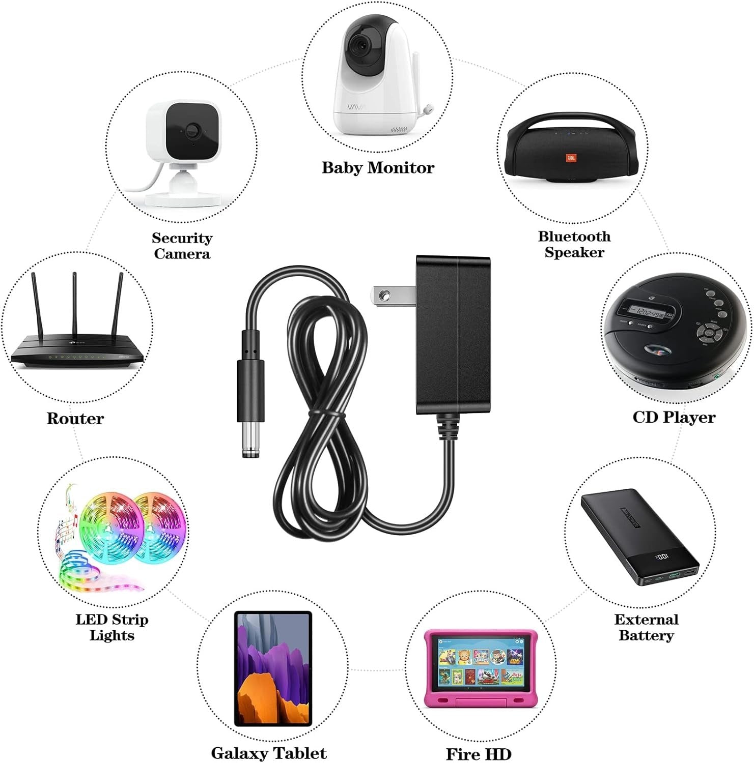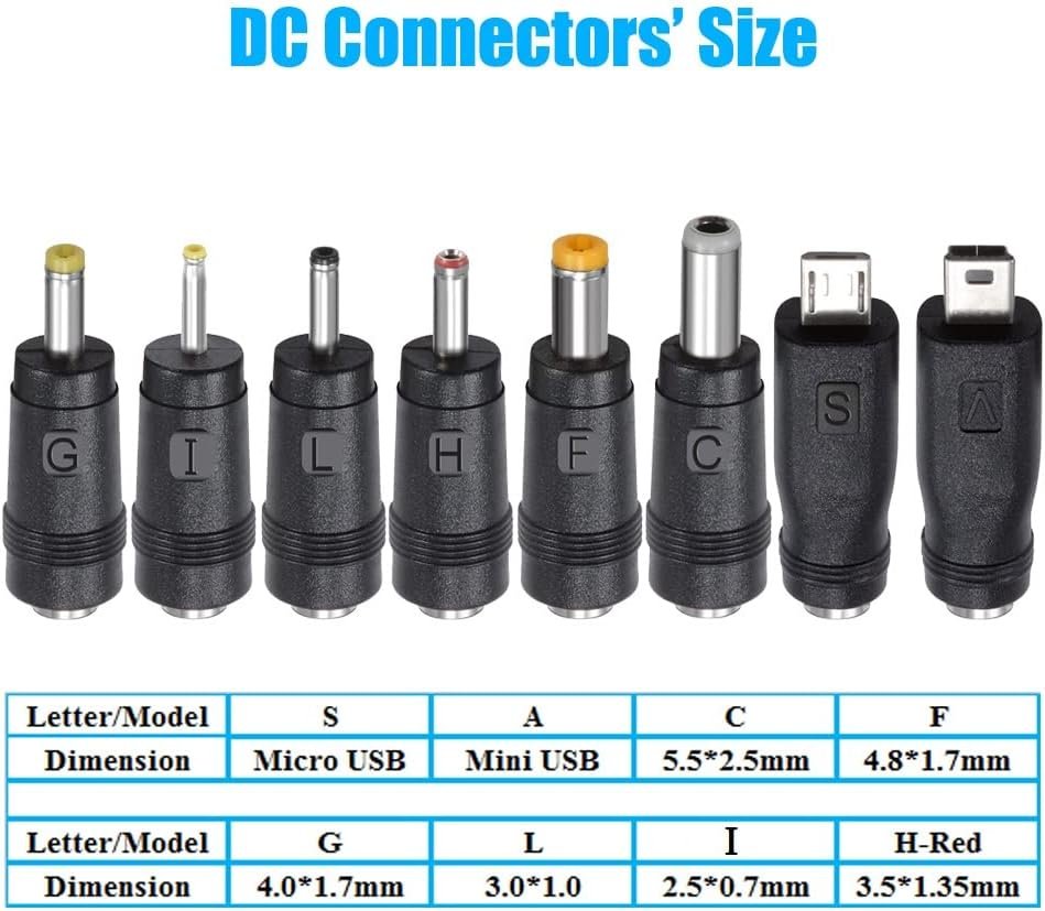 5V POWER SUPPLY: Input AC 100-240V AC 50/60Hz, Output DC 5V 2A(2000mA), 5V 1V 1.5A Compatible, Power: 10Watt. US plug, Polarity: Center Positive (+), Cord Length: 5 Feet/ 150cm MULTIPLE ADAPTER TIPS: This 5 volt power supply comes with 8pcs tips, they are Micro-USB, Mini-USB, 2.5*0.7mm, 3.0*1.0mm, 3.5*1.35mm, 4.0*1.7mm, 4.8*1.7mm, 5.5*2.5mm, you can easily change the different adapters for various 5vdc powered devices WIDE APPLICATIONS: Works with USB Hub, CD player, hubs, switches, electrical toys, WS2812B WS2811 LED strip lights, CCTV security camera, Wireless Router, ADSL Cat, laptop cooler, mini fan, Galaxy Tablet, External battery, outdoor sport action camera, Android phone, LELO lyla mona massager, Foreo LUNA series facial cleanser, Raspberry Pi A/A+/B/B+ Raspberry Pi Zero, MP3/MP4, Router, Baby monitor, GPS, Keyboard, Victrola record player. (Please check the image to confirm the tips are suitable!) SAFE 2A OUTPUT CURRENT: This 5V 2A power adapter Compatible with DC 5v 1.8A 1.5A 1A 1.2A, 100mA, 200mA, 300mA, 400mA, 500mA, 600mA, 700mA, 800mA, 900mA, 1000mA, 1500mA, 2000mA, 1 1.5 2 Amp devices; this 5V POWER CORD Passes RoHS & ETL certifications, which is an ideal 5V power supply ac adapter wall charger replacement for your broken or missing adapter COMPATIBLE: with Original back-and-white display Kindle 1st Gen, Kindle Fire Kindle HD Fire HD 6 8 10 HDX 7 8.9 9.7 Paperwhite Voyaged, Graco Glider LX / Glider Elite / Glider Premier swing, Bose SoundLink Color-Mini 2 II Power-Cord: 627840, 725192 Bluetooth Portable Speaker / Bose SoundLink Color Bluetooth Portable Speaker 627840-1110, 627840-1210, 627840-1410, 627840-1510, 627840-1610; TI-Nspire CX, TI-Nspire CX CAS, TI-84 Plus CE Graphing Calculator, TI 84 Plus C Silver Edition Calculator, woehraed shock collar, Brookstone Aluratek 8" 12" 14" photo frame, Bose SoundLink Mini II 725192-1110, 725192-1310, most wireless charger(micro-USB powered) and 5V household electronic gizmos!