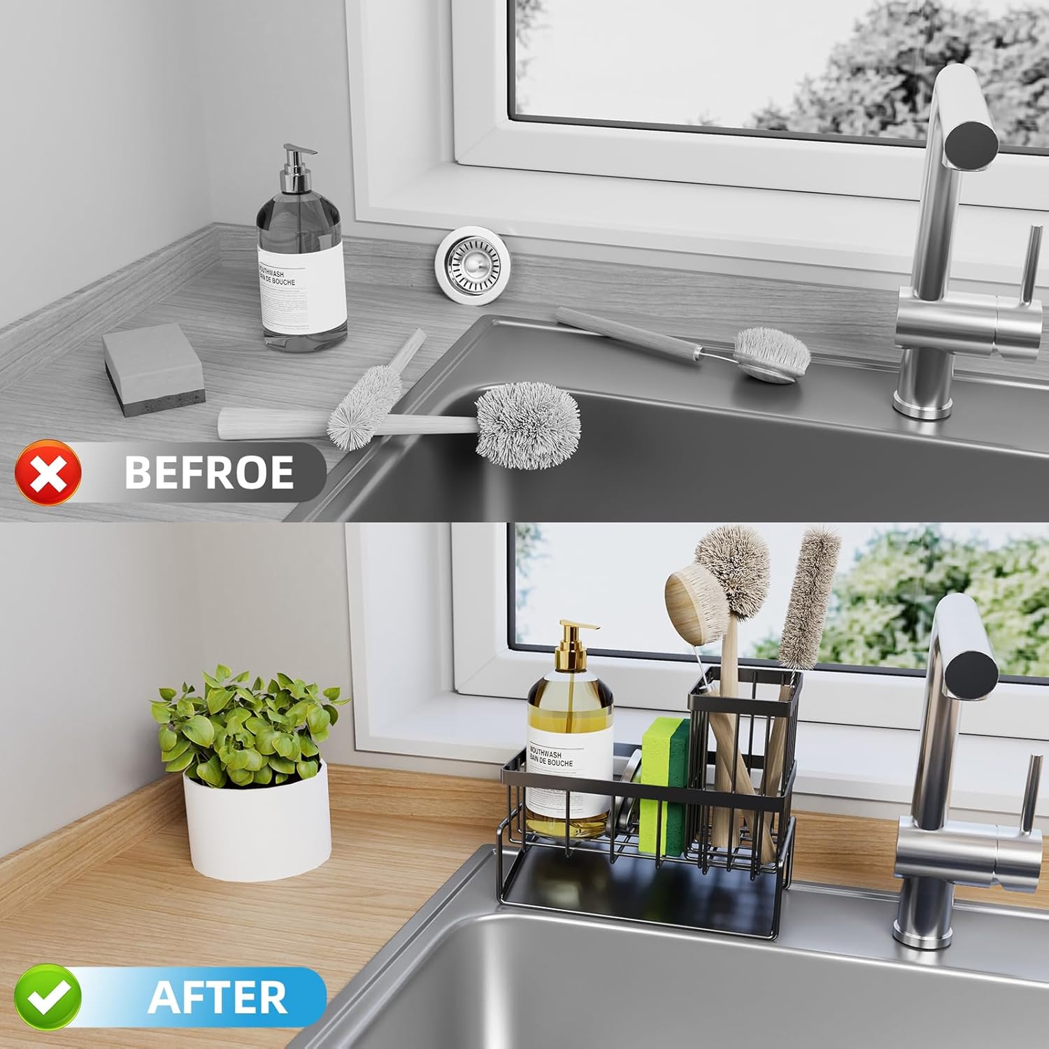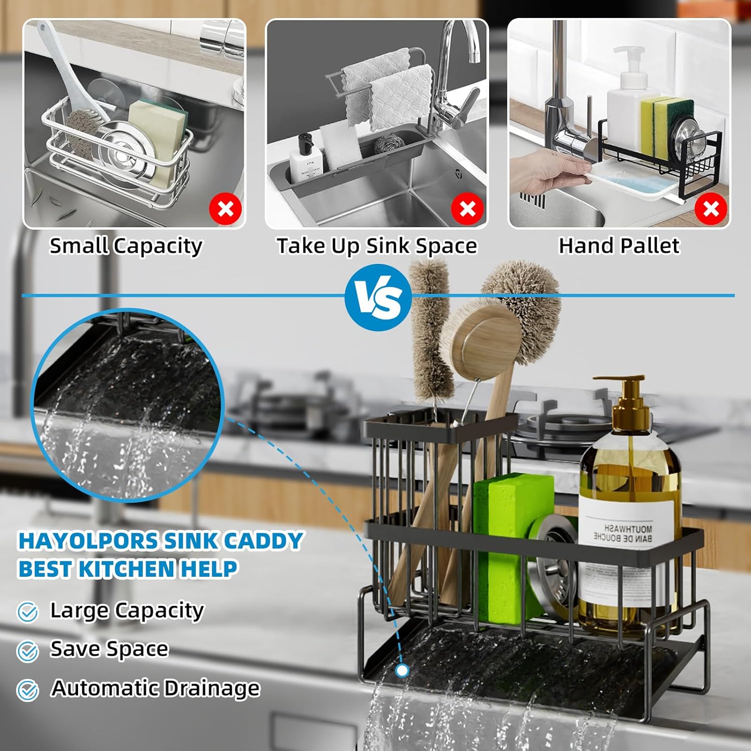 【SELF-DRAIN SYSTEM】 Equiped with a 30° sloped water tray, the Sponge Holder are able to drain water automaticly into the sink to help save time on repeated sponge washes, make sure that kitchen countertops keep dry and tidy. 【SMALL VOLUME】This Kitchen Organizers and Storage is perfect match with limited space kitchen. It measures only 7.7"*6.5"*3.54" and can hold a detergent bottle, 2 sponge balls or sink stopper, 1 dish brush. It fits neatly on your countertop near the sink but won't taking up too much space and make your kitchen look cleaner. 【RUSTPROOF】Making of premium quality stainless steel, the surface of this Sink Caddy is coated with black powder paint for secondary protection which effectively preventing rust and deformation. Durable and Long-lasting. 【PRACTICAL KITCHEN ACCESSORIES】 HAYOLPORS Kitchen Sink Organizer is more practical and can store a variety of cleaning tools, such as detergent bottles, dish brushes, sponges, hand sanitizer, sink stopper, etc so that allows you to organize kitchen cleaning supplies in order. 【NO NEED TO INSTALL】 Our Sponge Holder for Kitchen Sink is ready to use upon receipt, no installation required and is widely used on counters or bathrooms, making it a satisfying gift. If you have any questions during use, please feel free to contact us. We aim to provide you with a pleasant shopping experience.