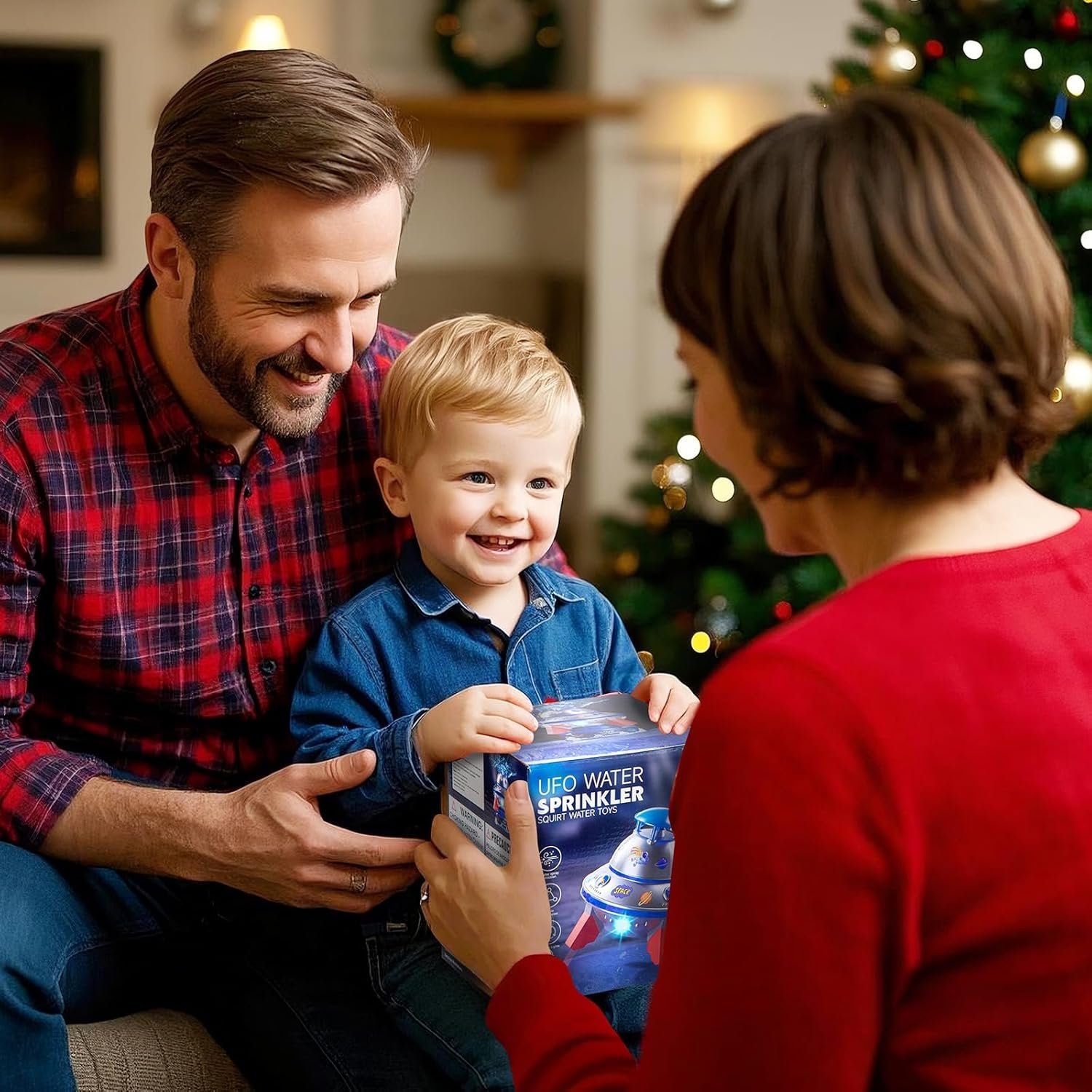 [UFO Water Rocket Sprinkler for Kids] Meet our alien spacecraft-inspired water sprinkler toy! Shoots streams 9 feet high with 360° spins. Colorful LED lights make night play awesome. Our summer toy is perfect for kids 3-12 - great for pools, beaches or backyard fun with family & pets [Summer water toy for family fun] UFO water sprinkler is not only a summer fun toy, but also a key to improving parent-child relationship. Both parents and children get company and happiness in water play with this rocket sprinkler [Fantasy UFO Sprinkler] This alien-inspired flying saucer features 360° rotating sprays, turning backyard play into interstellar adventures! Integrated LED breathing lights blend with glowing water curtains for day-night dual play modes. Crafted with food-grade materials and anti-slip base, ensuring safe cosmic imagination every splash. [Safe & Durable] Rocket water sprinkler is made of lightweight ABS and foam material, which is safe, durable and stable. Kids can enjoy summer water play fun without worry about damage by dropping and crashing down [Ideal Gift Toy] Our water sprinkler is a great choice as birthday present for kids or water toy in summer water play activities. The water sprinkler is suitable for lawn, backyard, pool or playground where is near to tap