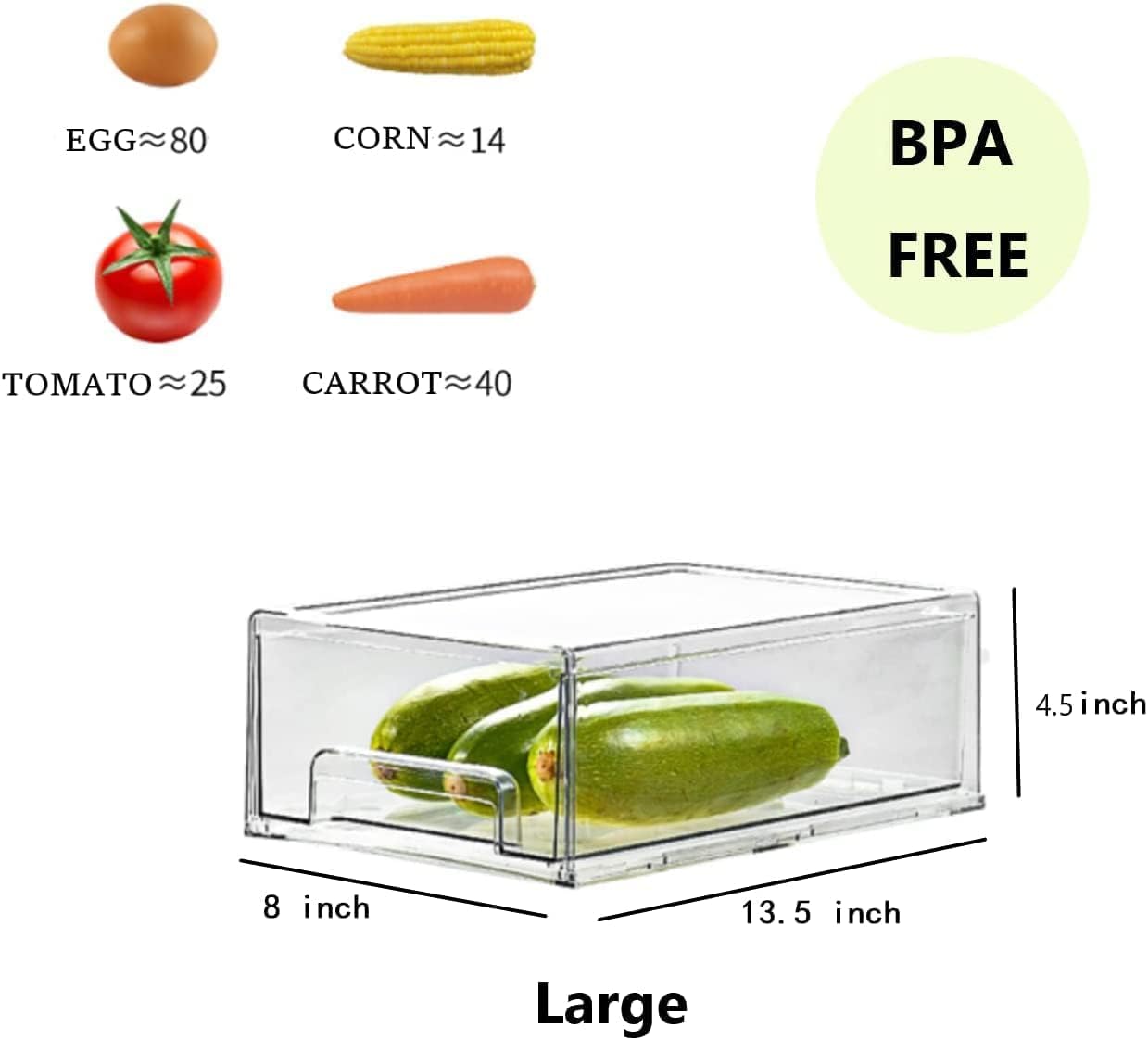 【Stackable Drawer Design】 easy to organize items in your pantry or any other space.that makes them for pantry, fridge, or any shelf,home and office essentials in style! 【PET MATERIAL】made of new material PET,High transparency can clearly see items stored inside, making it easier to take them out. safe storage of food. 【WIDE USE】Our storage bins can not only be placed in refrigerators, freezers, cabinets, for storing vegetables, fruits, eggs, cheese, milk, condiments, meat or canned drinks., etc. They are also very suitable for office, bedrooms, bathrooms, storing toys, cosmetics and any small items in life. 【CLEAR ORGANIZATION】Organization is easy with these plastic storage bin drawers.clear organization containers on their own, next to each other, or stack the drawers on your office desk or in closet, mudroom, or playroom. 【FUNCTIONAL & VERSATILE】These storage bins can be used in any room of home
