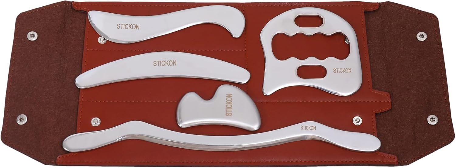 STICKON Medical Grade Stainless Steel Gua Sha Set 5pcs Scraping Massage Tool IASTM tools for Soft Tissue Therapy and Reduce Legs, Back, Arms,Neck,Shoulder Muscle Pain pitao08