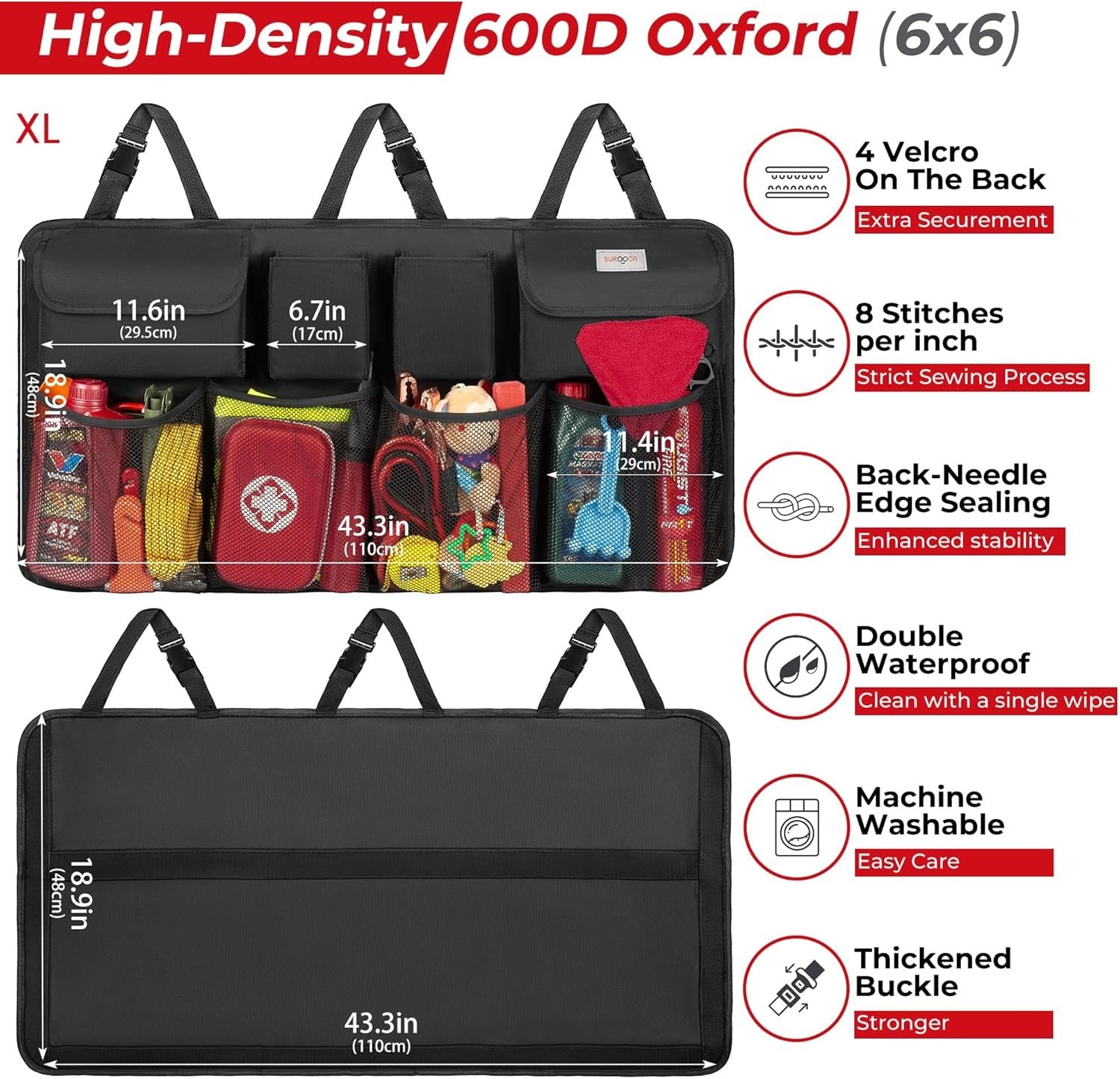 〠4th Generation Super Capacity】SURDOCA - UPGRADE A NEW GENERATION EVERY 6 MONTHS. That's why SURDOCA can be one of the leading brands on the organizers market in Europe. This 4rd Generation trunk organizer has a total of 8 pockets, double the capacity of the 3rd Gen. 4 Robust Net Pockets made of tough net keeps your car always clean. 4 Oxford Pockets well organize your small things, 2 Pockets of them work with caps can keep your privacy better. We know you're going to love it! 〠Strict Sewing Process & Special Edge Sealing Process】Our cooperated factory has more than 10 years of experience in organizer manufacture with perfect Quality Control processes. It requires Strict Sewing Process as 8 Pins Per inch and with 5.5g silk, which is more solid than general silk or cotton thread. We used BACK-NEEDLE Skill on Edge Sealing Process, which makes the edge stable enough. This will ensure that the item is strong enough to last for about 2 or 3 years. ã€Quick Installation & No-Swing Structure】With 3 adjustable buckle, easily install & uninstall in seconds. Fit for most vehicles, vans, SUVs, MPV and so on. Please measure your car seat back before buying. Tips: 4 long reinforcement strip on the bottom to help stick it to the back of seat. The Reinforcement strip suit for seat back for felt material, not for leather, glossy, or suede. Back buckle suit for the adjustable rear headrest. 〠High-Quality Waterproof Oxford Material & Robust Net Line】This item is made of high-quality Oxford 600 D (6 X 6) on the front, Oxford 600 D (6 X 3) on back, and stronger net line on the mesh. Strong and tough enough to hold the heavy grocery in your car trunk, waterproof and washable make you worry-free after traveling or camping. So don't waste your money on cheaper, poorly-made alternatives. ã€Professional after-sales service】SURDOCA-as a leading automotive organization brand in Europe and the US market, your satisfaction is our unremitting pursuit. We promise a 30-day free return service.If you have any questions about our car accessories please feel free to contact us, we will solve them Within 24 hours!