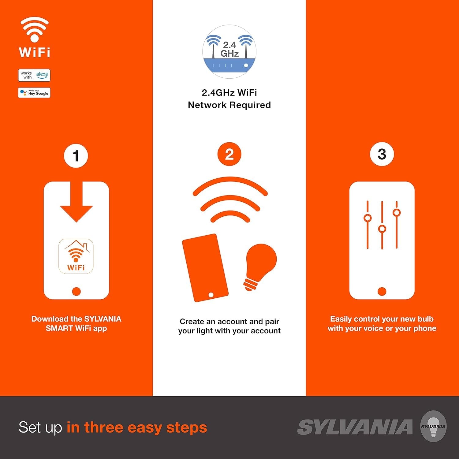Hassle-Free Voice Control: The SYLVANIA SMART+ light bulbs are compatible with Alexa, Siri Shortcuts, and Google Home. Use simple voice commands – no hub required. Not compatible with Apple HomeKit. Lighting for Better Living: Schedule routines, alarms, and bedtimes with your SYLVANIA Smart WiFi LED light bulbs. Control the lights when you are away and keep your home safe and secure – anytime, anywhere. Even when you’re on vacation. Home, Reimagined: With SYLVANIA SMART+ LEDs, you can redesign the look of your family rooms, home office, recreation, and family rooms. Dimmable functionality allows you to control the mood anywhere at home. Soft White 2700K color temperature creates relaxing ambiance. Please note that you must be connected to a 2.4 GHz Wifi network. The LED light bulbs are for indoor use only and not for use with fully enclosed fixtures. Dimmable via app or voice control with smart speaker. Not compatible with traditional wall dimmers. Do not install this device on a circuit with a dimmer switch.