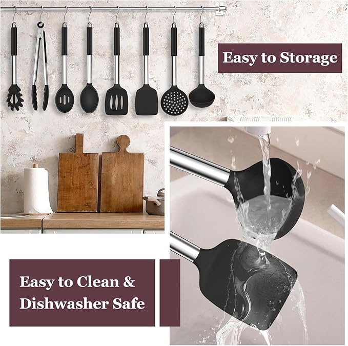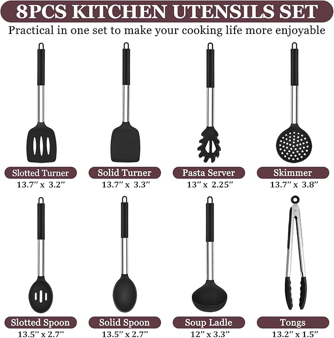 TeamFar Kitchen Utensils Set of 8, Silicone Utensils Kitchen Tools Set with Stainless Steel Handle, for Frying Serving Flipping Draining, Non-toxic & Heatproof, Nonstick & Dishwasher Safe - Black