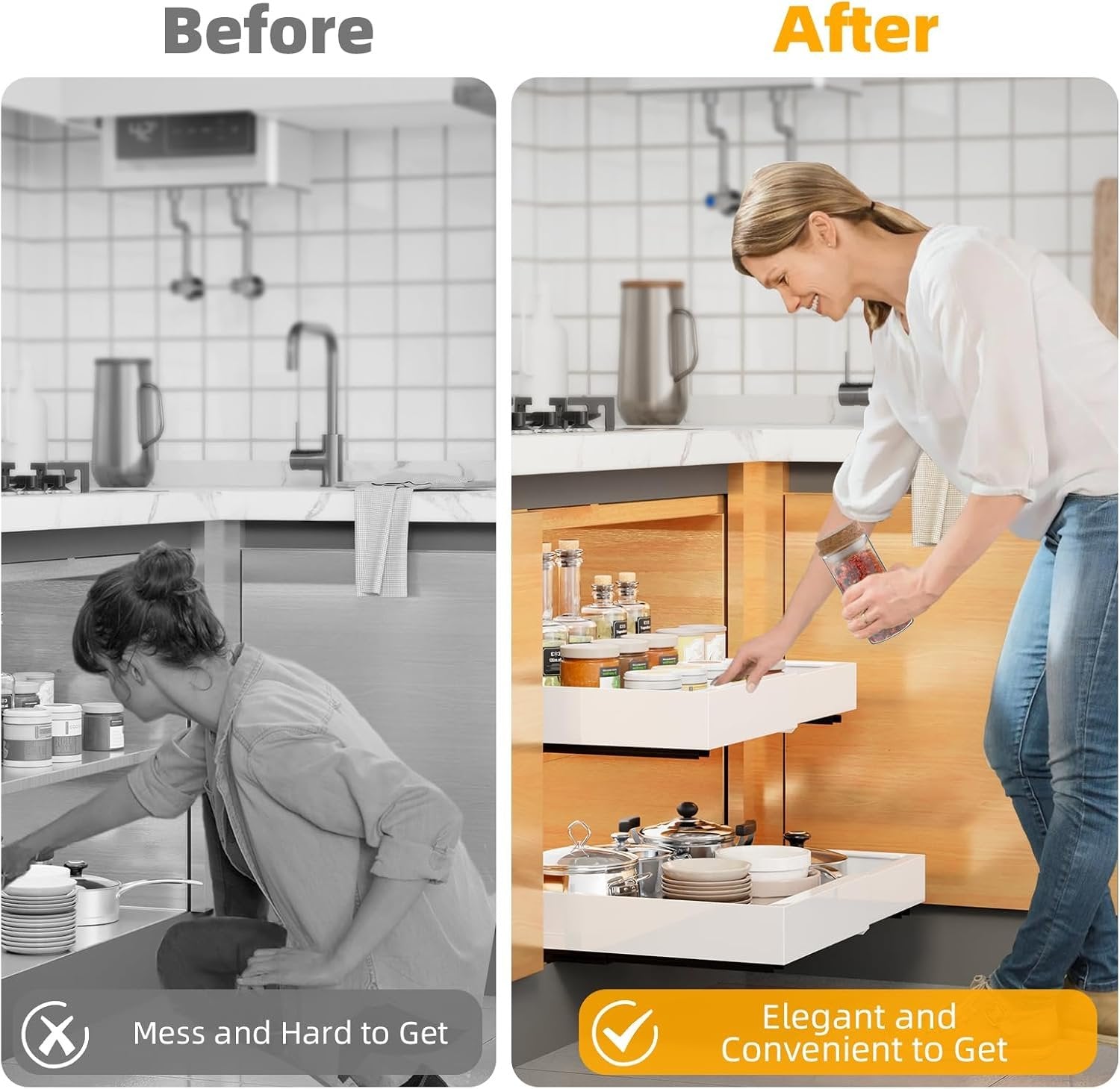 【Expandable Design for Different Width】Maximize your cabinet space with this pull out cabinet organizer which can be adjusted to fit different cabinets width from 32cm-52cm (12.7"-20.5") This slide out cabinet organizer suitable for most cabinets, kitchen,pantry,bathroom,living room,office,and more. 【Tidy and Convenient to Get】The pull out drawers with a size of 16.5" D x 2.8" H x12.7"-20.5" W for storing and organizing loose items and keeping them neat,like spice bottle, pots, pans, dishes, kitchen appliances and more. With our slide out drawers for cabinets, you no longer needed to be on your knees to access anything on the lower shelves,ad you no need to unload stuff stored in front to get to anything in the back. 【No drilling Required and Easy Installation】The slide out cabinet shelves is held in place by nano adhesive strips, all you need to do is peel off the strips and stick the drawer to the cabinet.No need to drill and destroy cabinets. 【Strong Load Bearing capacity】The sliding drawers for kitchen cabinets is made of heavy-duty metal with smoother, waterproof and rust-resistant surface,and the sturdy construction provides strong load bearing capacity. 【Upgrade 3 Smooth and Quiet Rails】Our pull out drawer organizer is designed with 3 damping guide rails,more stable than 2 rails which easy sink in the middle.Easily pull out the slides and remove the items in the cabinet without worrying about jamming or rattling at all.