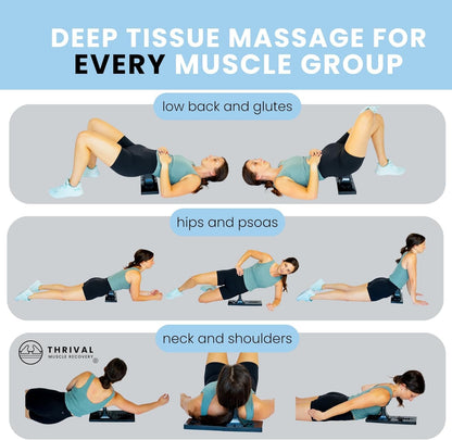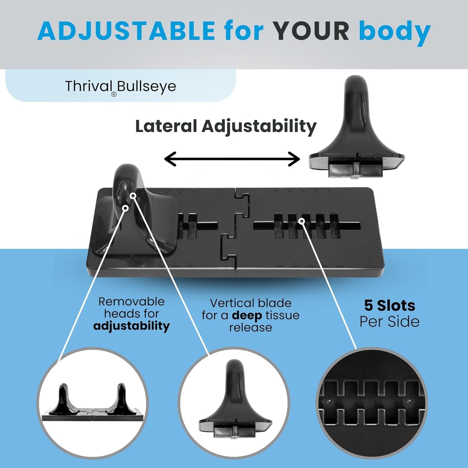 Ultimate Massage Experience: Our patented muscle pain relief tool features adjustable placement settings and various attachment heads that mimic a therapist's hand, elbow, or thumb. This design provides a deep tissue massage experience for your entire body, allowing targeted relief and muscle tension alleviation. Enjoy the benefits of massage tools right at home or on the go. Portable and Convenient: Experience unparalleled convenience with our psoas release tool that is compact and easy to carry. Whether you're heading to the gym, office, or traveling, this product fit seamlessly into your routine. The portable design ensures you can perform targeted muscle release exercises anytime and anywhere, making it easier to stay on top of your fitness goals. Patented Features: Our psoas muscle release tool incorporates numerous innovative features. We provide a range of professionally-tested attachment heads. Our attachment heads do not fall out of the board even when shaken upside down. We developed soft elastomer covers that reduce discomfort by increasing surface area to your body because sometimes releasing tight muscles can be uncomfortable or even painful. These soft covers can be purchased separately. Customizable Muscle Relief: Each attachment head on the psoas stretcher tool locks into the release board in one of five positions per side, offering a highly customizable experience. Tailor your recovery to specific muscle groups and anatomical needs with ease. This flexibility ensures that regardless of the muscle group you're targeting, the tool adapts to provide effective and personalized self-myofascial release. Comprehensive Guide: Each Thrival Muscle Recovery product comes with an extensive manual, providing detailed instructions and expert tips for optimal use. This comprehensive guide includes step-by-step techniques for targeted muscles, spine decompressor exercises, and hip pain relief. It also covers how to effectively use the product as a neck stretcher. With clear, easy-to-follow directions, you'll enhance your recovery routine and make the most of your investment.