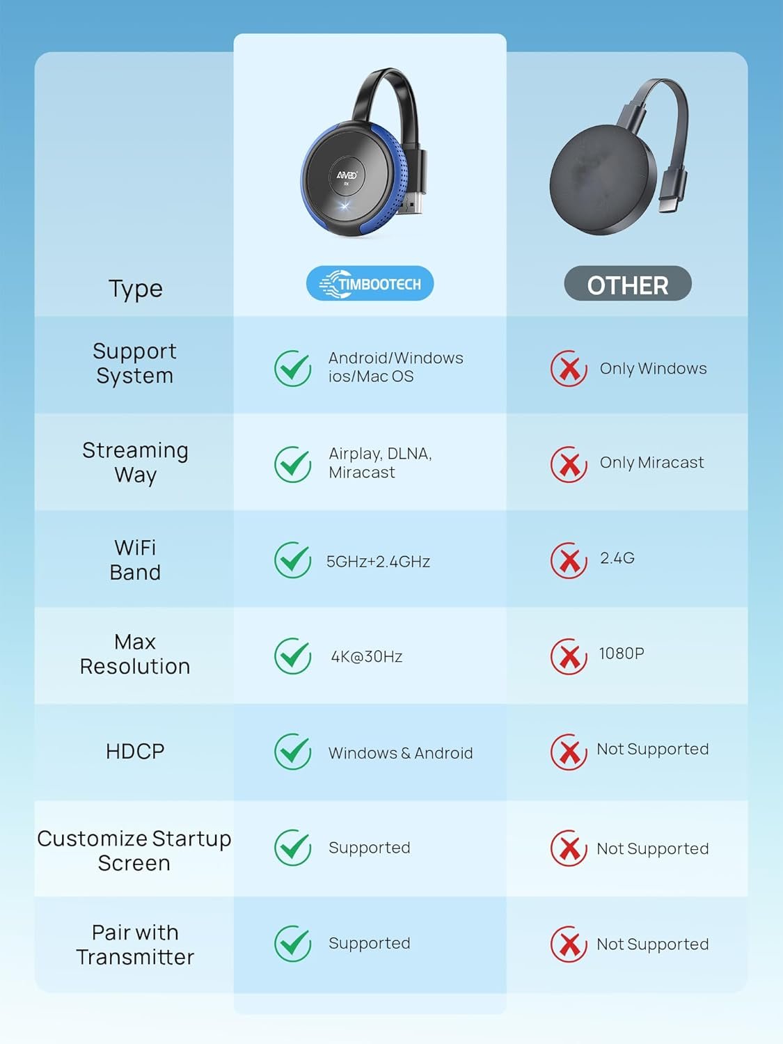【WIRELESS STREAM TO BIG SCREEN】TIMBOOTECH wireless display adapter allows you to wirelessly stream 4K video & audio from your smartphone, tablet, laptop or computer directly to your big screen. Enjoy your favorite content on a larger screen up to 65FT away. Perfect for monitors, projectors or older TVs without built-in wireless capabilities. 【PLUG AND PLAY, NO MORE CABLES】No apps, no Wi-Fi, no Bluetooth required. Simply plug this wireless HDMI dongle into your display's HDMI port and connect your i-Phone to the adapter’s Wi-Fi signal, then start mirroring or extending your screen. No need messy HDMI cables Now! Suitable for business, education, store showcase, home entertainment or gaming. 【IMMERSIVE 4K HD QUALITY】Our wireless HDMI adapter immerse yourself like you're there with support for cinematic 4K Ultra HD @ 30Hz. Share your favorite movies, videos, presentation, photos, games, and online content with exceptional clarity and detail, all from your i-Phone, i-Pad, laptop, or computer. Please note that for Windows and Mac OS devices, this wireless HDMI adapter supports up to 1080P @ 60Hz. 【NO INTERRUPTION NO DELAY】TIMBOOTECH wireless screen mirroring receiver equipped with both 2.4/5GHz Wi-Fi bands, ensuring a high-speed transmission. With WPA-2 security, it makes a safe streaming in offices and schools. It supports adjusting the wireless channel on the receiver's settings page to minimize interference in crowded Wi-Fi environments, giving you a smooth and stable streaming. 【WIDE COMPATIBILITY】TIMBOOTECH wireless display dongle supports Airplay, Cast, Miracast, and DLNA. Compatible with Windows 8.1+, Android 4.2+, MacOS 10.14+, iOS 9+. Works with most streaming apps or websites on Android and Windows devices, such as Hulu, Net flix, Prime Video, HBO Max, Showtime, Dis ney+, and more. IMPORTANT: iOS and Mac OS devices support streaming apps that do not require HDCP, such as Zoom, YouTube, TikTok, Vudu, IMDb, and other non-subscription video apps. 【COMPACT AND PORTABLE】Its compact size makes it highly portable, allowing you to mirror your screen anytime, anywhere with ease. Take it on extended vacations, business trips, family gatherings, parties, camping, teaching, or use it for everyday entertainment. Enjoy the convenience of high-quality wireless HDMI connections.