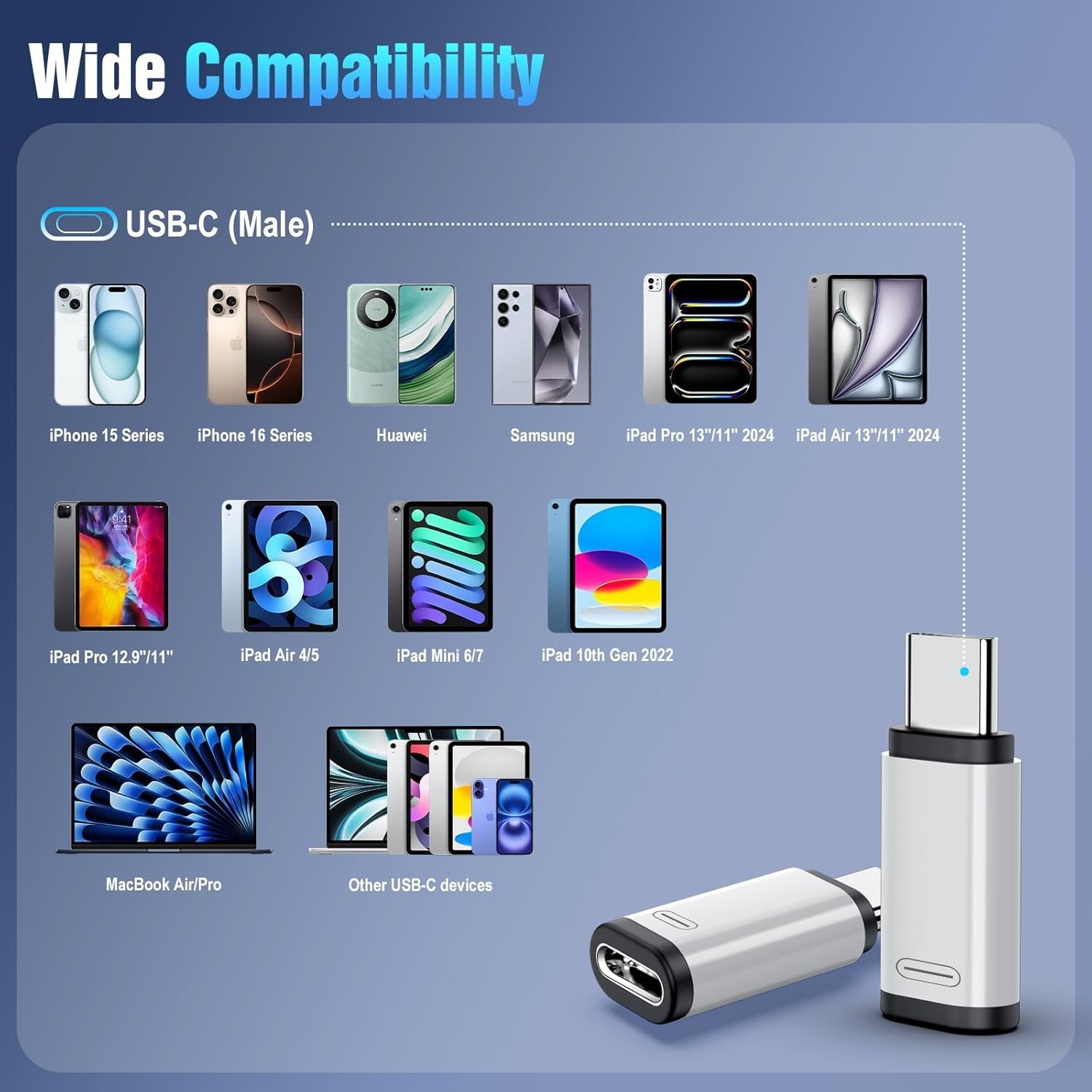 36W Fast Charging & Data Transfer: The lightning to usb c adapter can make your lightning charging cable useful again, providing PD 36W (DC 12V/3A) max fast charging for your iPhone 16/15. The data transfer speed is up to 480Mbps, convenient for you to transfer files/pictures between your phone and laptop. Important Notice: The iphone to usb c adapter only supports charging and data transfer between phone and computer and does not support OTG, video & audio functions, so it cannot work with earphone, Apple Pencil (1st generation), mouse, keyboard, flash drive, card reader, printer, microphone, camera, etc. Reliable Quality: This usb c to lightning adapter is crafted with high-quality PC material to withstand daily wear and tear, ensuring long service life and excellent performance. Plug and play, the lightning to usb c adaptor allows you to charge your usb-c devices conveniently. With Anti-lost Loops: 4 silicone loops are included to easily secure and attach the type c to lightning adapter to the most commonly used cables. Let you easily get the adapter for iphone 16 and preventing adapter lost. Package includes 4 *Lightning female to USB-C male adapters, 4*anti-lost loops, 1*OPP bag. Widely Compatible: The usb c male to lightning female adapter is compatible with all Type C devices: iPhone 16/16 Plus/16 Pro/16 Pro Max, iPhone 15/15 Plus/15 Pro/15 Pro Max, iPad Pro 13-inch 2024, iPad Pro 11-inch 2024, iPad Air 13-inch 2024, iPad Air 11-inch 2024, iPad Pro 12.9''/11'', iPad 10th Gen 2022, iPad Air 4/5, Macbook, Chromebook, Surface, Switch, Samsung, Google Pixel, etc.