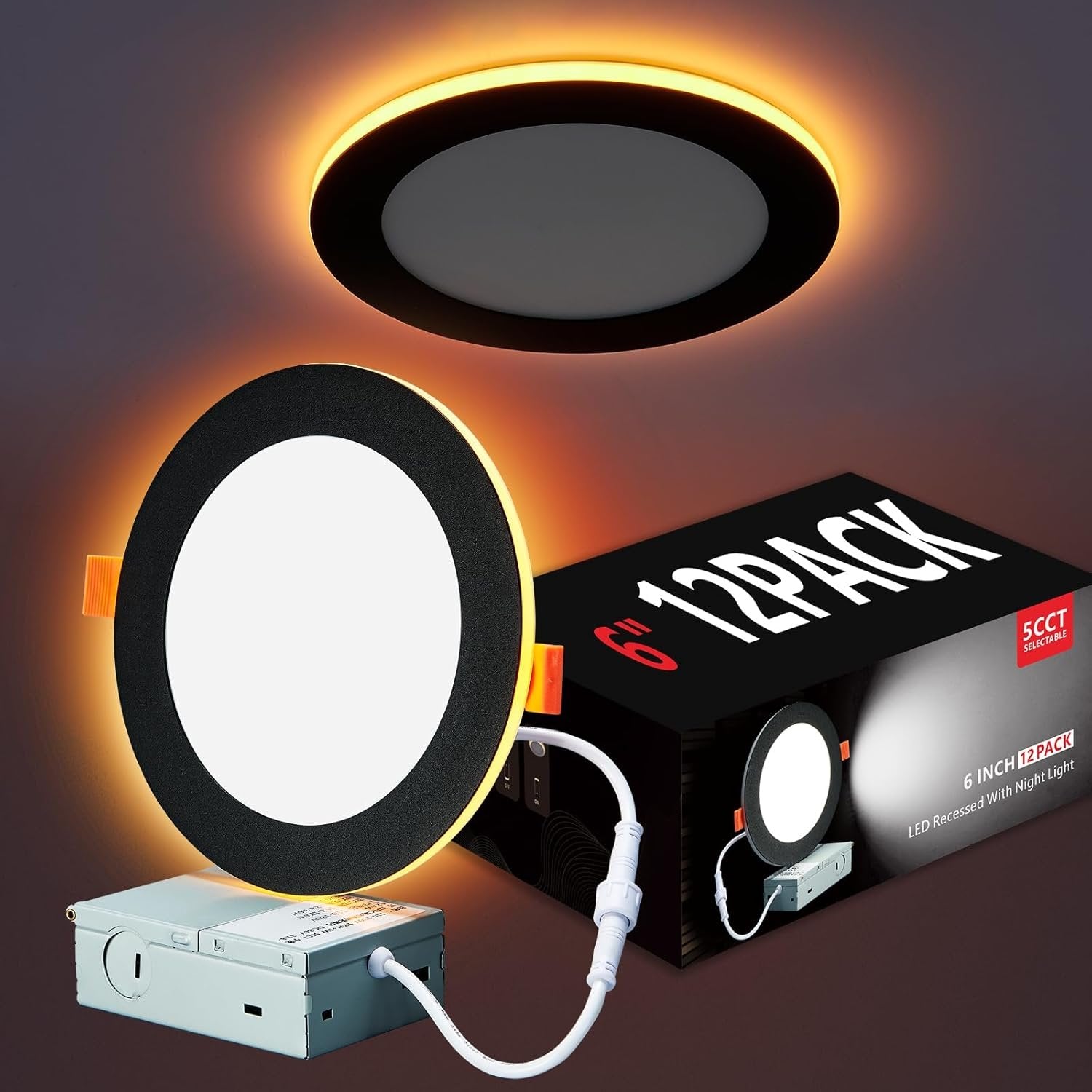 Togalonn 12 Pack Black Pot Lights 6 inch with Night Light - 5CCT Color Changing & Dimmable LED Recessed Lighting, Canless Wafer Soffit Downlight with Juction Box, 12W Eqv 100W
