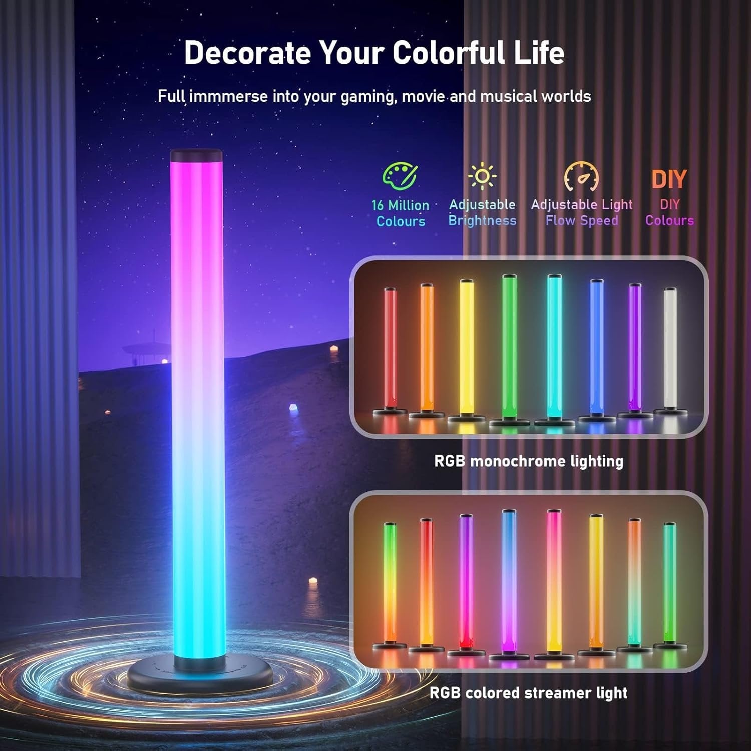 [Immersive Lighting Atmosphere] The upgraded smart light bar has length 42cm and 360° full-screen light, which greatly reduces dark corners and shadows, providing all-round lighting. With the built-in high-sensitivity sound sensor, the light will dance synchronously with the music, video and ambient sound to create an immersive sound and light space dimension, enhance your game/movie/party/dating experience. [16 Million Lighting Modes] Smart light bar uses innovative RGB technology to present a colorful light composed of 16 million colors. Each mode displays different colors and lighting effects, and easily creates the atmosphere you need through a variety of dynamic scenes, helping you to fully immerse in your art world. It is the best gift for Valentine's Day, Christmas, New Year, and birthdays. [8 Scene Modes] Smart light bars includes 8 preset scenes, each mode displays different colors and lighting effects. A total of 213 preset dynamic modes can meet your different lighting needs and enhance your entertainment experience. Every time you close and reopen the rgb smart light bar, the RGB tube will return to the mode you set last time, and there is no need to adjust it again. [3 Control Methods] You can directly control RGB ambient lighting through the remote control or the buttons on the USB cable; you can also connect the APP and the color changing light bars through Bluetooth, and use the APP to customize the lights you want. There is no need to use HDMI cables or be restricted by other media services to enjoy synchronized lighting effects. [Easy to Set Up] RGB smart LED lamp is easy to install and set up, could be powered by any power supply with a USB interface, not limited to any living space. The product is light and has a small footprint, and can be easily moved to different positions according to your needs. It can be placed in various places such as living room, room, game hall, RV, studio, etc. to enrich the visual experience and enhance the atmosphere.