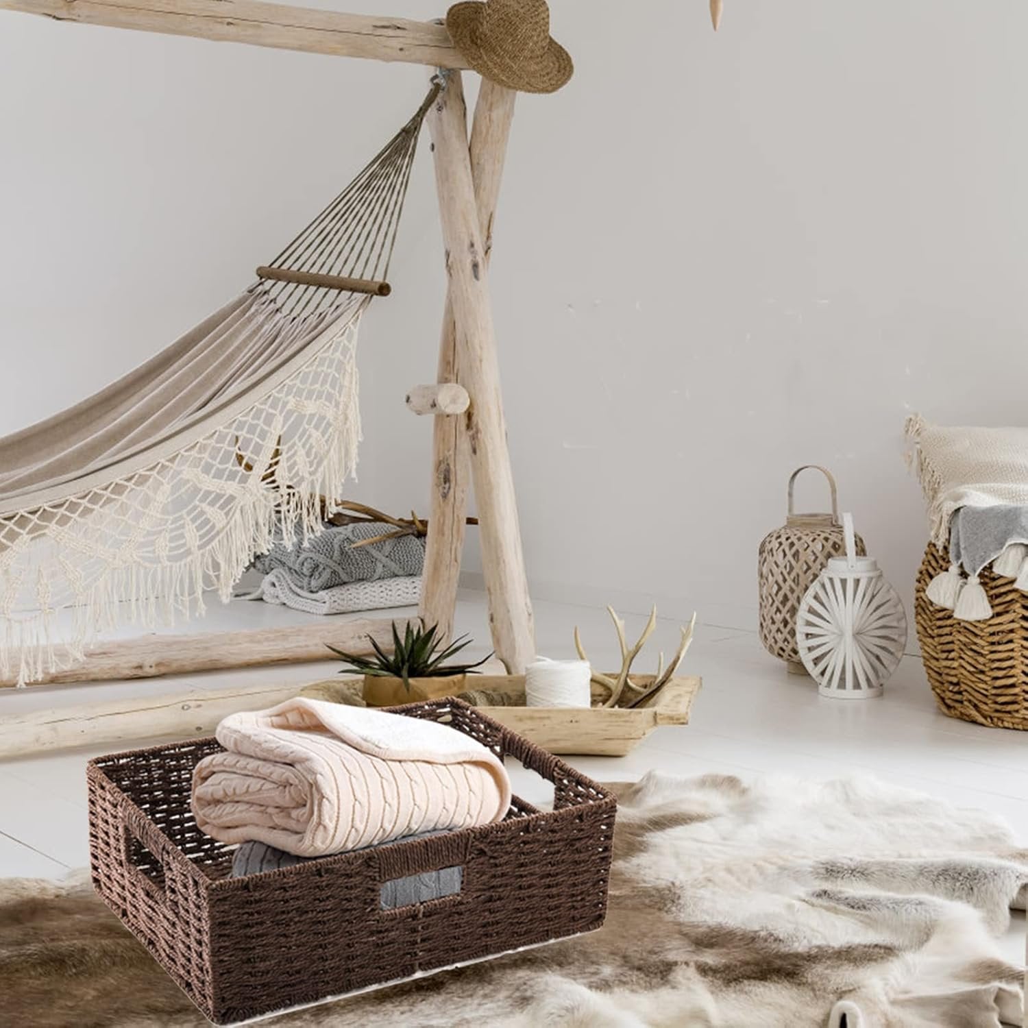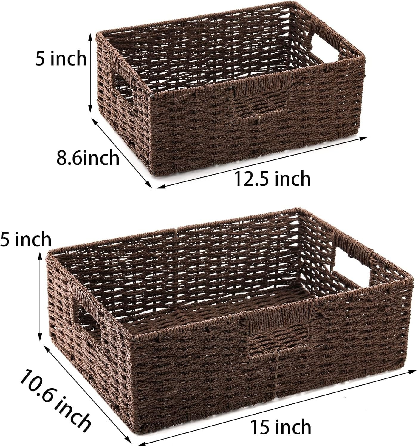 Package includes 2 pack TOPZEA dark brown wicker basket for pantry organization, come with 2 size, Large: 15"(L)x10.6"(W)x 5"(H)/38x27x13cm, M:12.5"(L)x8.6"(W)x5"(H)/ 32x22x13cm, can meet your different storage needs, everything will be organized well, keep your space neat and tidy. Our woven CD storage baskets are hand made of sturdy kraft paper rope and metal frame, which is durable, lightweight, if the wicker baskets are dirty, you just need to wipe them by wet cloth, no worry they will be mouldy, easy to clean. The hand-made imitation rattan weave basket with handles are very easy to carry and transport, suitable for organizing pantry, closet, cabinet, shelf, toilet, kitchen, bathroom, bedroom, laundry room, office and more, you can use them outdoors as picnic baskets, they are stackable when not in use, that save your space. These pantry organizer bin are very functional and big enough for store a lot of stuffs, they can be used in kitchen to hold seasoning, dinnerware, napkin cloth, knife, baking tools, cookbooks, potato, onions, ect.; in bathroom to store blanket, towels, clothes, shampoo, tissues, etc. The closet organizer baskets can organize and hide the messy side, save your space. The decorative storage baskets are very good looking, natural brown color is comfortable and textured, perfect home decor, hold some book, movies, magazines, flower vase, add cozy and comfortable accent to your room. The nursery storage basket are also ideal gift for housewarming, wedding, Christmas, New Year, Mother's Day, etc.