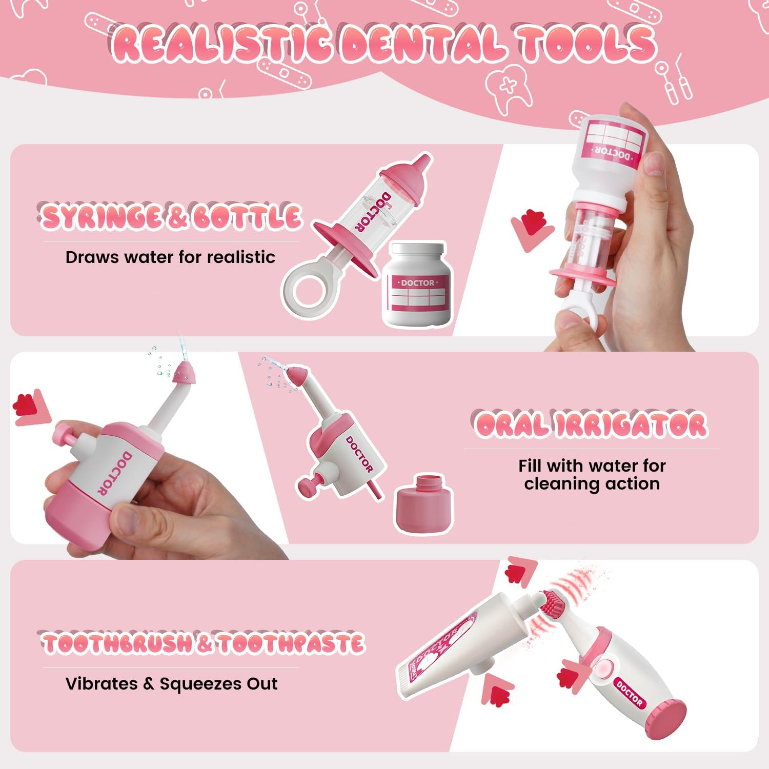 Toy Doctor Kit for Toddlers, Kids Dentist Play Set with Dentist Chair, Doll Toy, Stethoscope, Large Carrying Storage Bag, Dental Accessories, Pretend Doctor Play Medical Gift Kit for Girls Pink