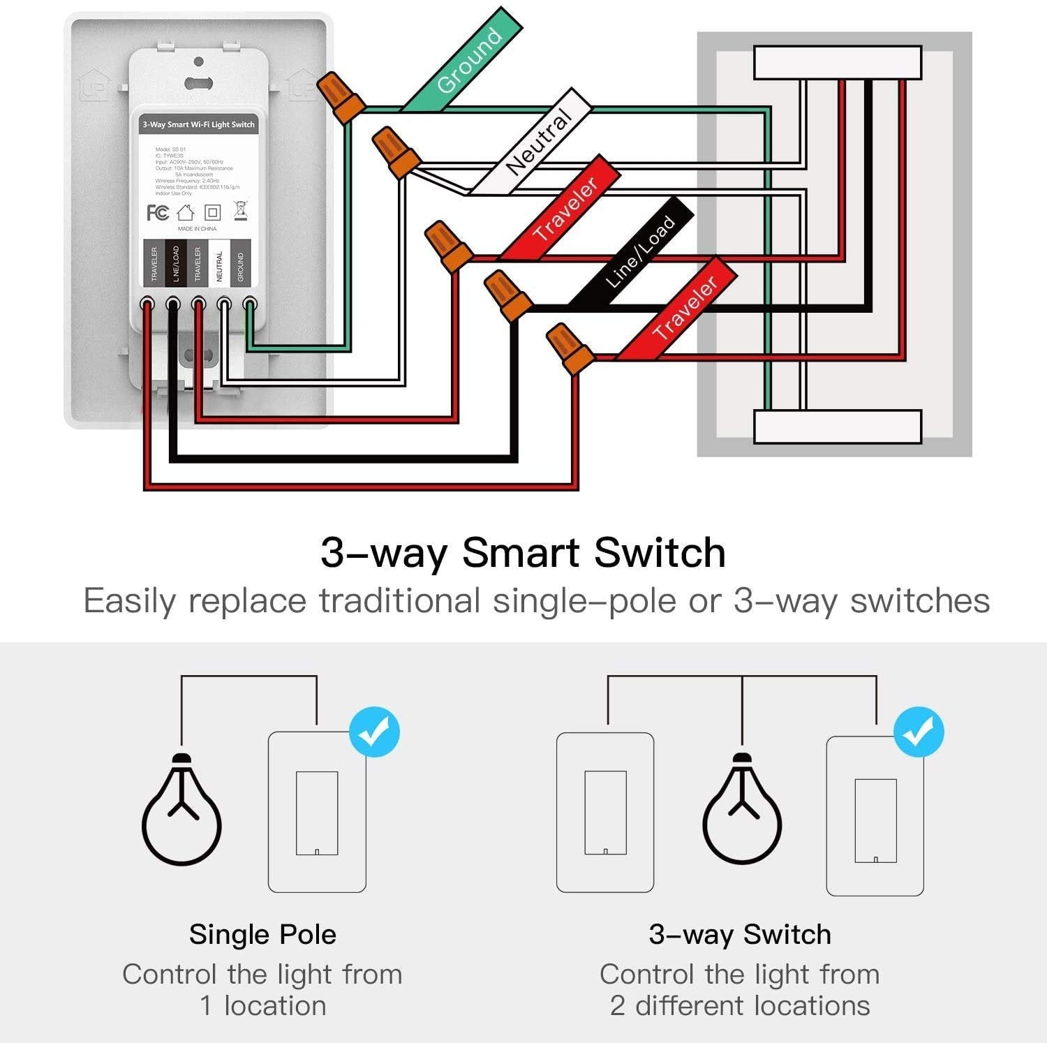 Easy to Install: Not dimmer switch. Step-by-step instructions will guide you through the wiring process. Neutral Wire is required; standard size; screwless snap-on wall plate; no hub required. For 2.4GHz Wi-Fi only (NOT 5GHz). Max Power: 1250W. Output Current: 10A. For non-dimmable bulbs.For non-dimmable bulbs Single-Pole & 3-Way Application: Using it as 3-way or single pole switch to control the light from 1 or 2 locations. Replace one of your traditional 3-way switch with our Treatlife 3-way smart switch or use 2 Treatlife 3-way switches to control the light from 2 locations, such as at the top and bottom of a staircase, at the ends of a long hallway, for large rooms with multiple entrances, from house to garage, etc Smart Lighting: Voice control replaces button pressing via Alexa or Google Assistant and enjoy superior lighting automation by creating personalized applets to trigger the light using phone's location, weather underground service, etc Remote Control: FCC certificate. Control the light from anywhere with your smartphone using the Smart Life App,Automate home lighting with schedules or countdown based on everyday routines or simulate occupancy while you are on vacation. You can also monitor real-time light status, share devices, and group many Treatlife switches to control all the lights in your home Support & Service: Friendly and professional support team are at your service 24/7;please contact us immediately if you have any problem