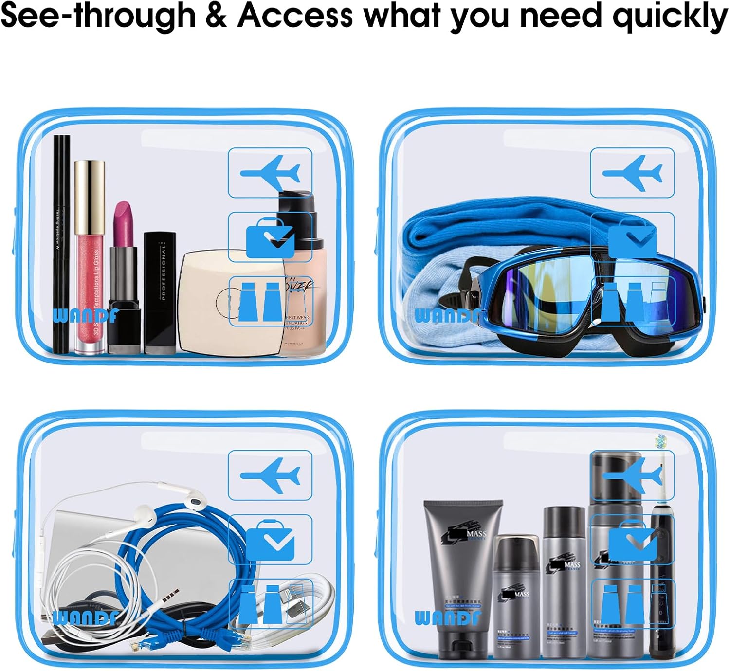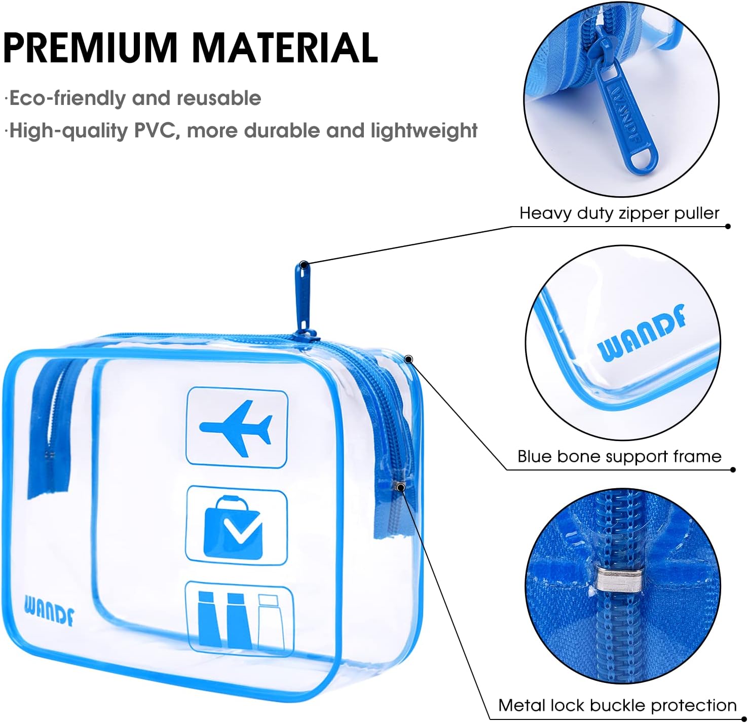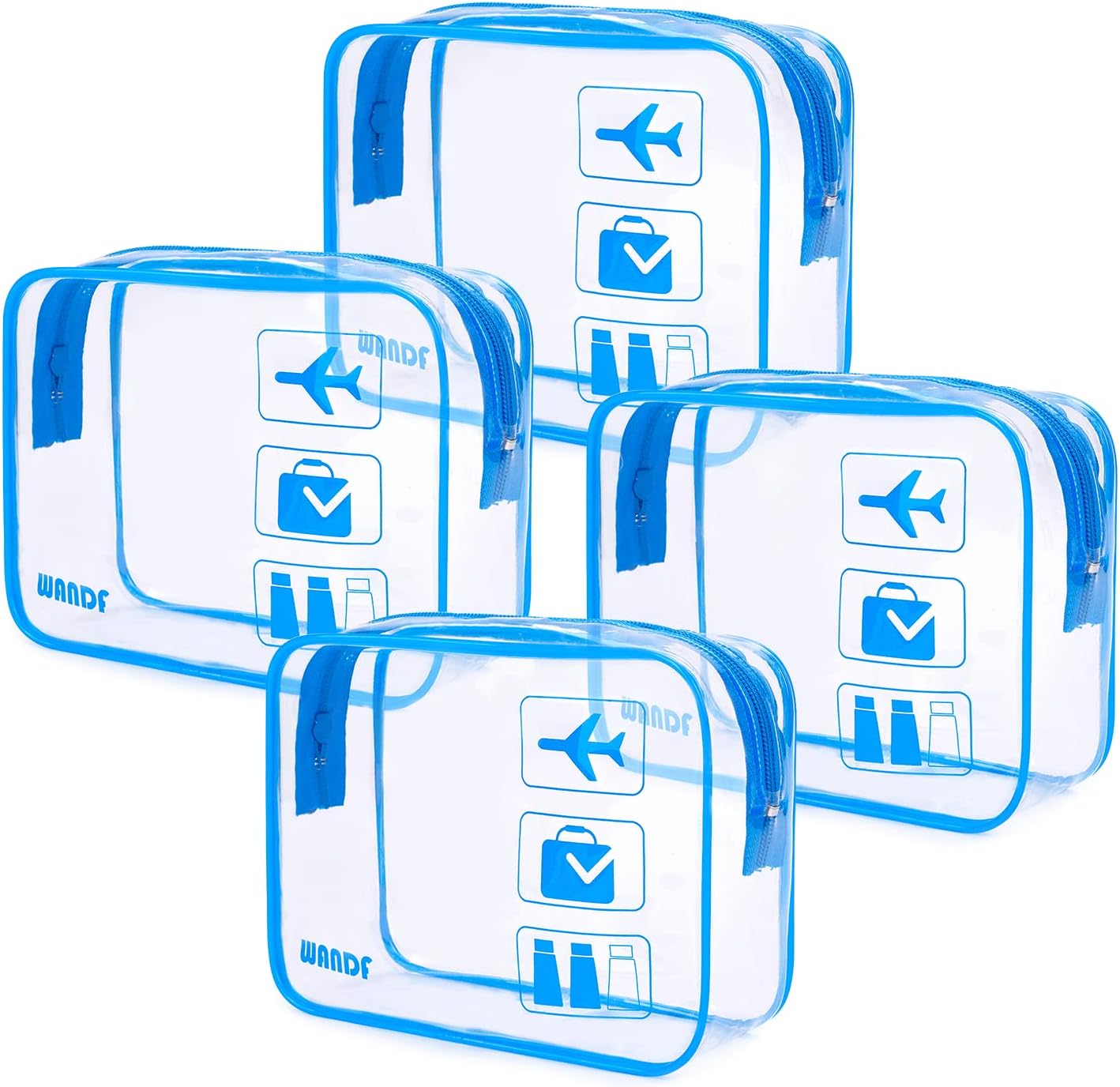 TSA APPROVED --- Made of clear PVC fabric, the WANDF toiletry bag strictly adheres to TSA 3-1-1 liquids rules for carry-on bags on all airlines. This makeup bag measures 7.7 x 5.9 x 2.8 inches, which is large enough to hold 100ml liquid bottles. It helps individuals spot items without rummaging through the bag. You cannot imagine how quickly and easily this clear shower bag can help you pass through security screening or find the items you need! HIGH-QUALITY FABRIC & REINFORCED SEAMS --- Made with 0.6mm thick transparent PVC, the WANDF transparent large toiletry bag is more durable and sturdy than most other products. Reinforced seams ensure that it never tears, keeping your travel make-ups or toiletries well-organized. No need to worry about the travel toiletry bag splitting easily and cosmetics spreading everywhere anymore! HEAVY-DUTY ZIPPERS --- Sturdy metal zippers work smoothly and can be closed firmly. Better than typical products, the WANDF clear cosmetic bag comes with a metal lock buckle, preventing zippers from falling off and providing an additional layer of protection for your items. PORTABLE & LIGHTWEIGHT --- Perfect for holding travel bottles, cosmetics, shaving kits, and great for storing makeup brushes, towels, toys, etc. This clear toiletry bag weighs ONLY 0.13lb, lighter than an eyelash brush. A fantastic travel companion that can hold as many toiletries as you need without weighing too much itself. NOTE --- Please wash the outside and inside of this toiletry bag with soap and water, and wipe it with a damp cloth. Then leave it in a well-ventilated place for a few days with the bag open before use.