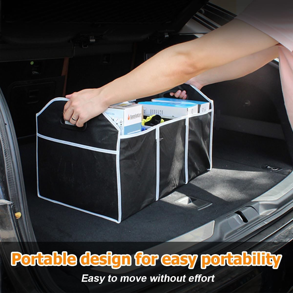 【Reliable Material】: Our foldable car trunk organizer is made of high quality waterproof oxford polyester material which has good abrasion resistance and durability. It is well made and the stitching is firm. Car trunk storage organizer can offer you a long service time. If you want to clean it, any spray cleaner and damp cloth will do the trick. 【Large Capacity】: The fully extended dimensions of the automotive trunk organizer is about 21.26''L x 13''W x 9.1''H. There are 3 big compartments, each with plenty of storage space and multiple small pockets on the exterior. And its handle design allows you to pick it up easily. So it brings you a large and more flexible storage space. 【Lightweight & Foldable】: Its lightweight design allows you to take the car trunk organizer directly to supermarkets, beaches, parks or large sports fields. You can also fold it when not needed. Fully foldable, very portable and easy to carry or store quickly. 【Wide Range of Applications】: This is the optimal solution for maintaining a clean car interior as car accessories. Suitable for all vehicle types, like trucks, SUVs, vans, jeeps, cars, etc.. And it's fantastic for transporting and arranging groceries, toys, athletic equipment, tools, and more in your trunk. Eliminate trunk clutter situation with this car organizer. 【Ideal Gift Choice】: Offering both quality and practicality for our customers, this storage box is an ideal choice as a thoughtful gift for your loved ones. Whether it's for families, friends or colleagues, this gift is sure to be cherished, especially on festivals or birthdays!