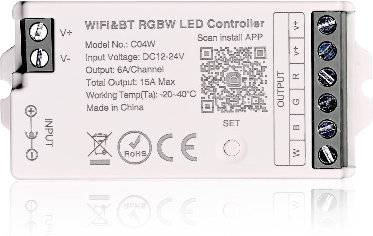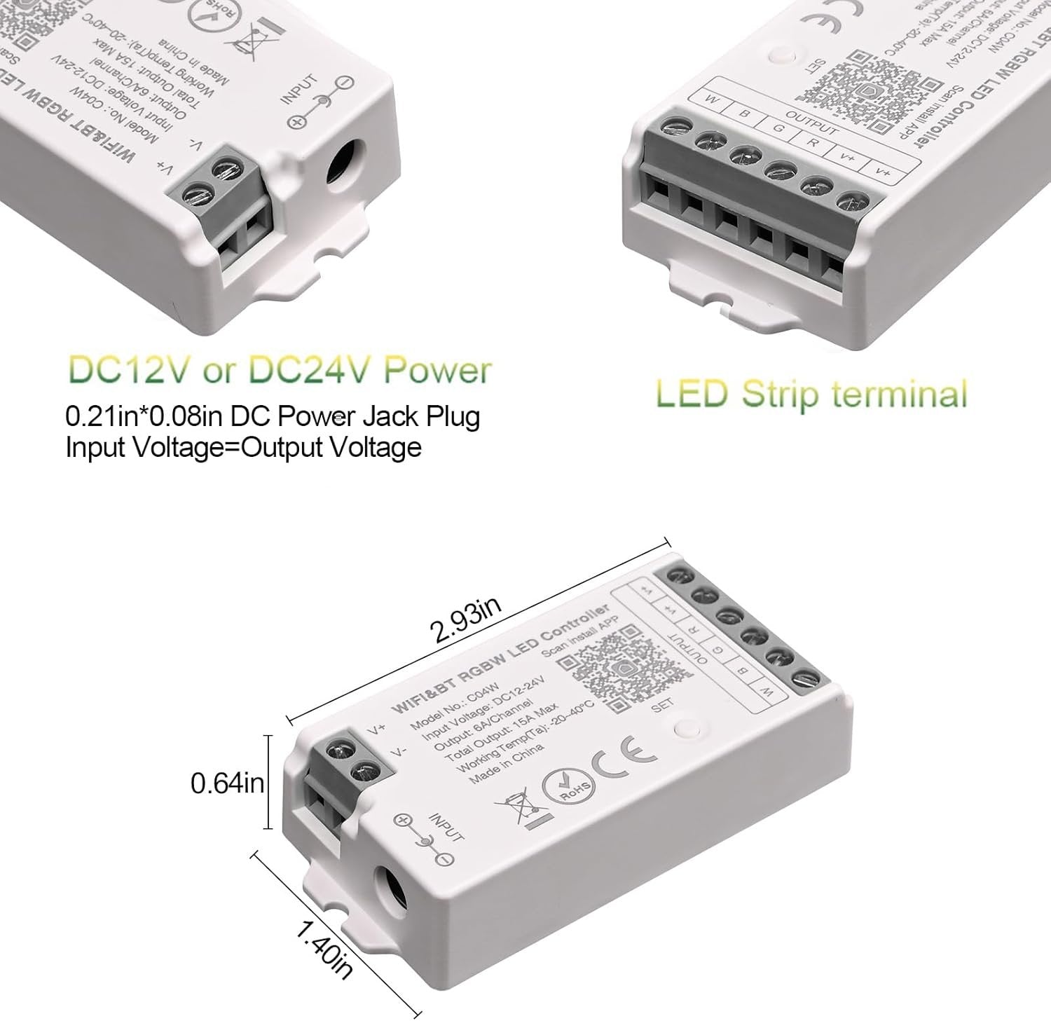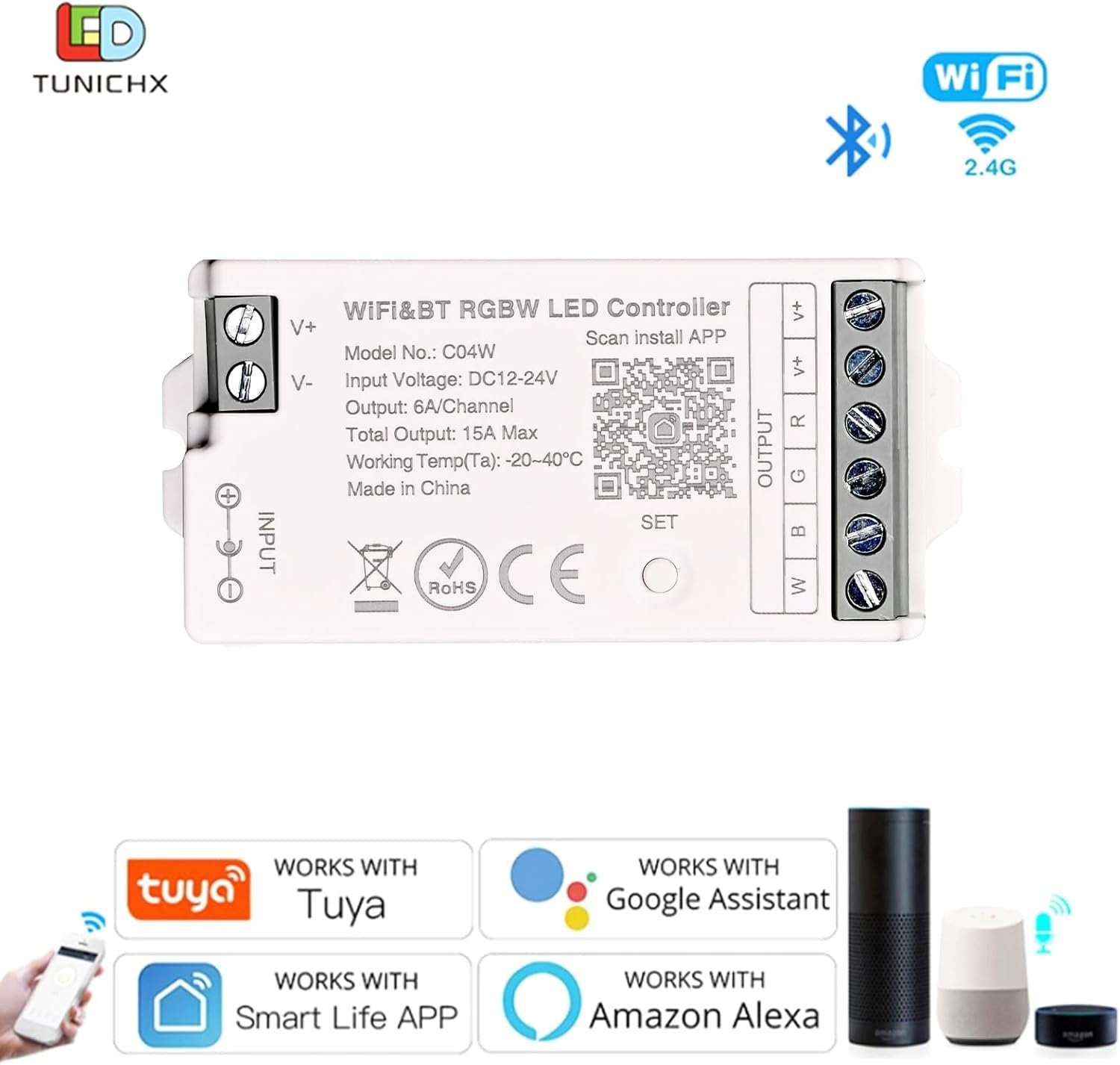 【Three control methods】1. Compatible 2.4GHz RF Remote : LM096,RC03RF,RC03RFB,RC04RF,RC04RFB,RC05RF,RC05RFB,WR01RF. 2. Tuya Smart ,Smart Life APP 2.4GHz Wi-Fi control. 3. Alexa, Google Home Assistant control .Three methods can be used at the same time. 【Functional Verification】Dim Brightness/saturation.Group control.Multi zone control. Voice command.Timmer setting.Countdown turn on/off.Biorhythm. Tap-to-Run and Automation. Secene customization. Sleep/wakeup plan . Do not disturb mode.Device sharing. Selection of different usage scenarios. 【About Signal Transmission】 Only for remote control dimming. One controller can transmit the signal from the remote control to the another controller within 30 meters. As long as there is a LED strip controller within 30 meters, the remote control distance can be limitless. All the controllers should be the same group. 【Auto-Synchronization Function】Different controllers can work synchronously when they are started at different times, controlled by the same remote control at the same dynamic mode and with the same speed. Tips: When WiFi router disconnect ,bluetooth connection control is a backup control methods. 【PWM LED Type】Control RGBW LED strip LED String LED bulb like FCOB 5630 2835 3528 5630 5730 5050 3014 etc Without IC chip V+ Red Green Blue White 5 wires LED strip Power: 6A/Channel Total output max 15A .DC12V 180W max. DC24V 360W max.