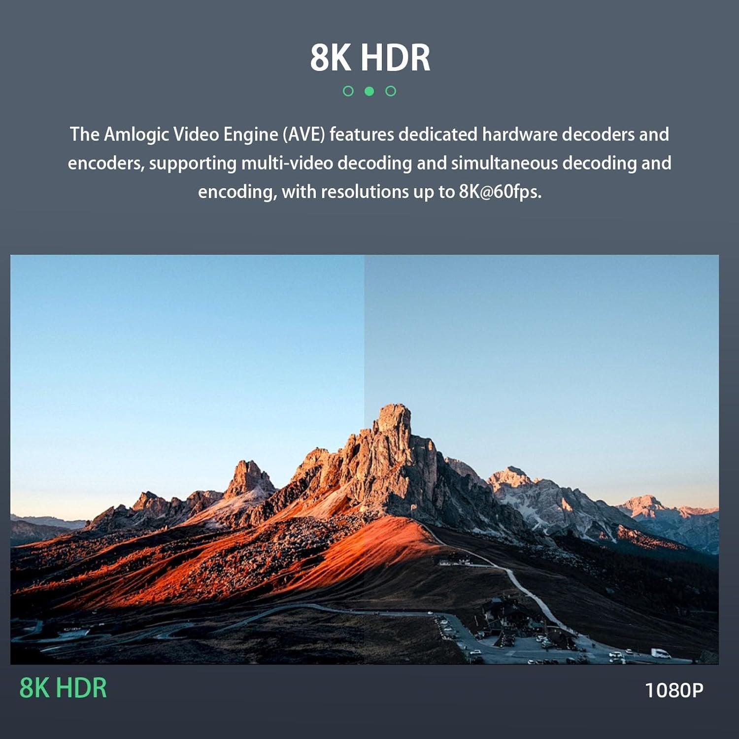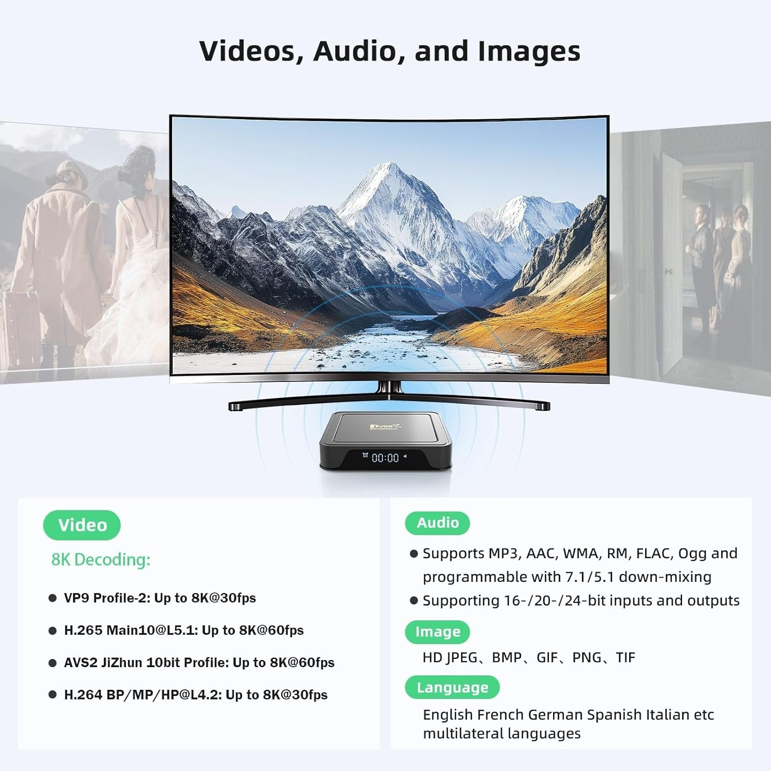 【8K@60FPS SMOOTH PLAYBACK】This portable media player supports 8K@60fps Ultra HD video decoding, delivering a seamless and immersive viewing experience. With its powerful video processing capabilities, it ensures smooth playback, making it perfect for video streaming devices, home theater, and multimedia entertainment. 【HI-FI AUDIO OUTPUT】The android tv box features SPDIF/IEC958 digital audio I/O, delivering high-fidelity sound. It supports up to 8 PDM microphones for clear audio capture and offers multi-channel audio conversion, providing flexible output options for home theaters and professional setups. 【LARGE STORAGE AND USB EXPANSION】The android box 14.0 comes with 2GB RAM + 16GB eMMC storage, ensuring faster performance and smooth loading of high-definition videos, images, and music. Additionally, it supports a USB media player for TV, providing more storage options and enhancing your entertainment experience. 【WIDE FORMAT COMPATIBILITY】The tv streaming box is compatible with VP9, H.265, H.264, MPEG-4, MPEG-2, MPEG-1, Xvid, WMV9/VC1, and more, supporting various video formats with ease. It also offers multi-language subtitle support, making it an excellent choice for home entertainment and business presentations. 【VERSATILE MEDIA FORMAT SUPPORT】The tv98 pro supports ASF, AVI, MPEG, DAT, WMV, FLV, MP4, TP, MPG, MKV, TS, MOV, H.265 video formats, TXT subtitle format, and MP3, AAC, WMA, RM, FLAC, Ogg audio formats. Featuring dual-band WiFi (2.4G/5G) and Bluetooth 5.2, it ensures stable and high-speed wireless connectivity for an enhanced user experience.