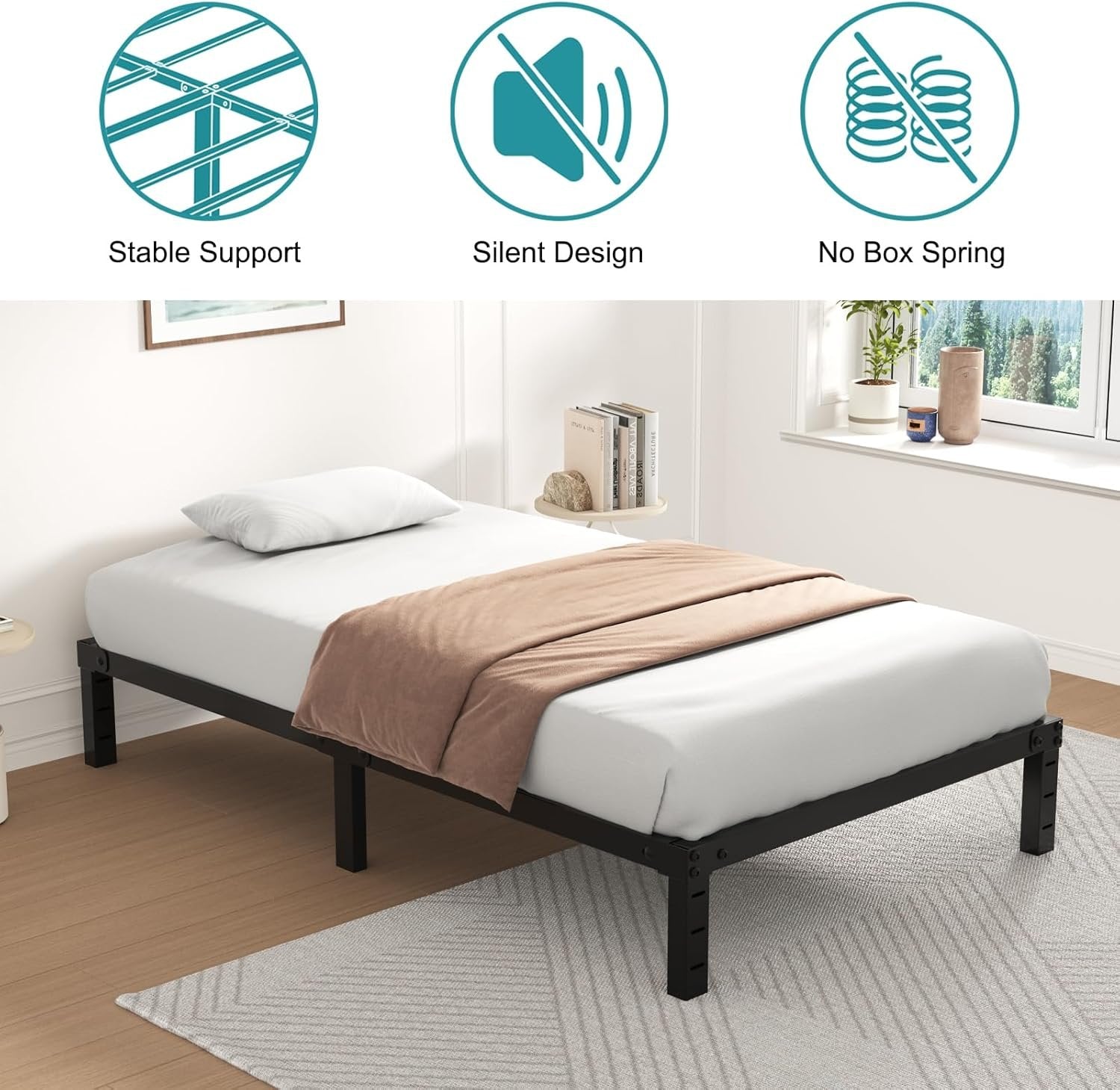Premium Quality:The twin bed is easy to install, you can follow the instructions to install it easily.The twin bed has gone through multiple tests and uses high quality Metals to creates a product that meets the market is needs, with a weight capacity of 700LBS, so you can use it with confidence Storage under the bed:The Metals frames bed can reasonably utilize the space, you can store things under the bed, fully use the room space well Noise Free Design:Twin bed frames have anti-noise design on the middle support legs and Metals slats, which can make you sleep more peacefully and is a quality partner for your room No Box Spring Required:Single bed is easy to install, you can put the mattress on it directly without a box spring. The double reinforcement design can give the mattress sufficient support, prevent the mattress from sagging, and increase the service life of the mattress Professional Team:We have a professional after sales team that can solve your problems in time. In the process of using the mattress, you can contacts us in time to help you solve the problem smoothly. You deserve a better life