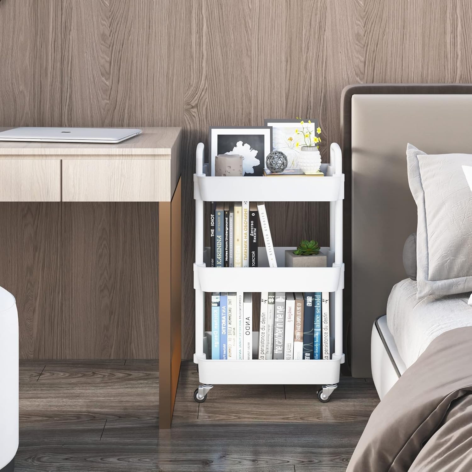 UDEAR 3-Tier Kitchen Rolling Utility Cart,Multifunction Storage Organizer with Handle and 2 Lockable Wheels for Kitchen,Bathroom,Living Room,Office,White