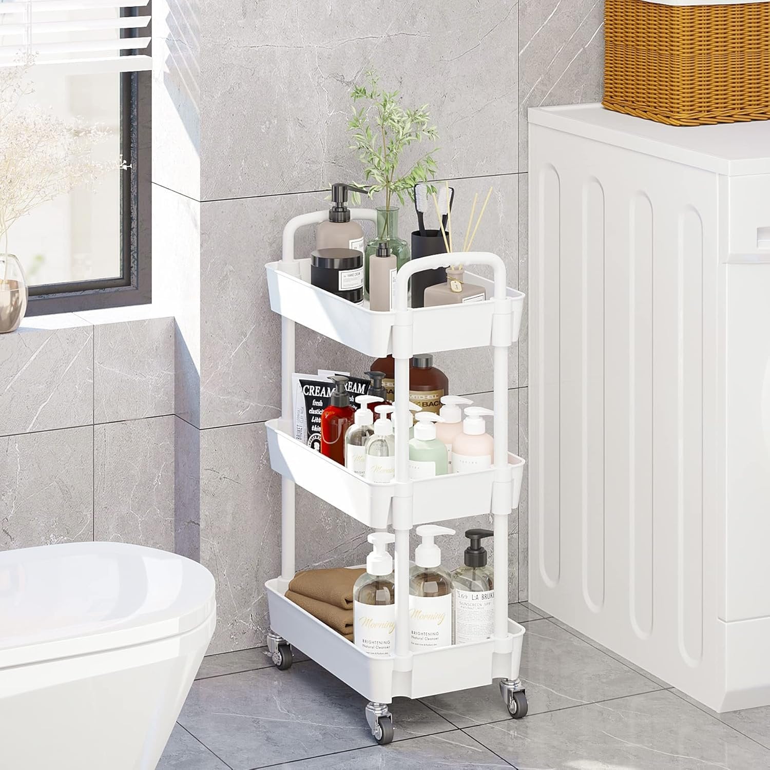 【Large storage】This rolling cart has 3 large-capacity storage baskets with a size of 39*29*7cm (15.35*11.42*2.76in), which can provide you with sufficient space to store your daily necessities. It can improve space utilization. 【High-quality materials】High quality plastic storage baskets and handles, metal support tubes make the cart lightweight and durable. 【Fashionable hollow design】Simple and elegant design, fashionable style, suitable for multiple scenes; Good ventilation and water drainage, can keep your storage dry and tidy. 【Removable storage】Equipped with 4 casters (2 can be fixed) and a flexible rolling rack with 2 handles, you can easily push and use it at any time, so that your necessities are at your fingertips. 【Easy to assemble】With a simple manual and assembly tools, you can easily have it anywhere within 10 minutes.