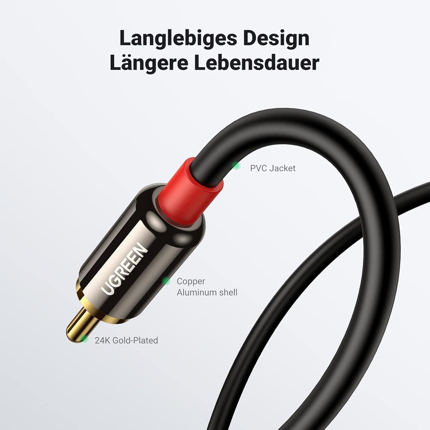 3.5mm to 2RCA Audio Cable: UGREEN 3.5mm to 2RCA stereo cable is suitable for plugging the 3.5mm connector into the headphone jack of your mobile device and the 2 RCA connector to the port on your sound system. This RCA to Aux cable from UGREEN is a perfect choice for audio connections both in professional or domestic settings Fantastic Audio Quality: Gold Plated connectors and copper of UGREEN RCA audio cable provide maximum's conductivity and durability, ensuring optimal stereo audio transmission. This RCA Y cable features minimal sound loss, minimal interference, and overall crisp and high-quality audio. With the help of this 1/8 to RCA audio cable, no longer suffer the radio frequency interference (RFI) and electromagnetic interference (EMI) Incredibly Durable: 10000+ bend lifespan & high flexible PVC jacket make 3.5mm to RCA cable improve the durability. It’s a durable option that would not break for any reason. On a side note, RCA to 1/8 stereo cable also features a tangle-free design, just to help make life a bit easier for you User Friendly Design: With super slim connector design, this UGREEN 2 Male RCA to 3.5mm cable could make a snug and secure connection with mobile devices in a case. This rca to headphone jack is super easy to use thanks to the red and white color markups. You have four length options including 3, 6, 10 and 15 feet which should be enough for most households or studios Broad Compatibility: This red and white to Aux stereo Y splitter cable is compatible with iPhone, iPod, iPad, MP3 players, CD players, laptops, tablets and any other digital device with a 3.5mm audio jack; and home audio systems, like amplifier or receiver with RCA jacks