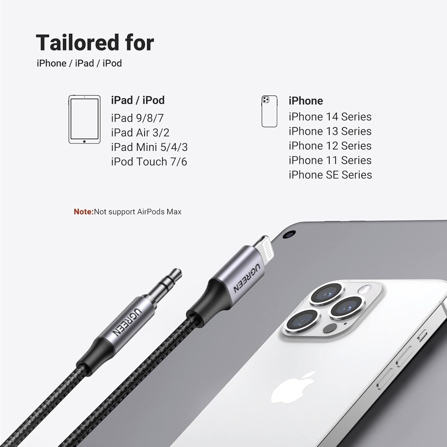 Apple MFi Certified: UGREEN Lightning to 3.5mm car audio cables are certified by Apple to meet rigid iPhone requirements and ensures completely and securely connect with your Apple devices. Compatible device: The lightning car audio cables are compatible with Apple iPhone 13/13 Mini/13 Pro/13 Pro Max/12/12 Mini/12 Pro/12 Pro Max/11 Pro Max/11 Pro/11/XS/XS Max/XR/X/8/8 Plus/7/7 Plus, iPad 9/iPad Pro /Air /mini, iPod touches 6th generation and so on. Supports iOS 12/11/10 and earlier Operation System High performance: The aux stereo audio cable builts with dual-shielding, corrosion-resistant nickel-plated 3.5mm connectors. ensuring reliability and reducing signal loss and noise. The braided cable with good touch feeling makes it beautiful and durable. Multi application: Easy to connect your Apple Devices to car stereos, home stereos, portable speaker, headphone, Hi-Fi, computer or anything else with a 3.5mm input jack. Flexible braided jacket: Nylon braided aux cable has excellent wear resistance and protects the inner conductor from the risk of cable breakage. Scratch-resistant aluminum housing not only gives the aux cable a nice look but also does a good job of dissipating heat.