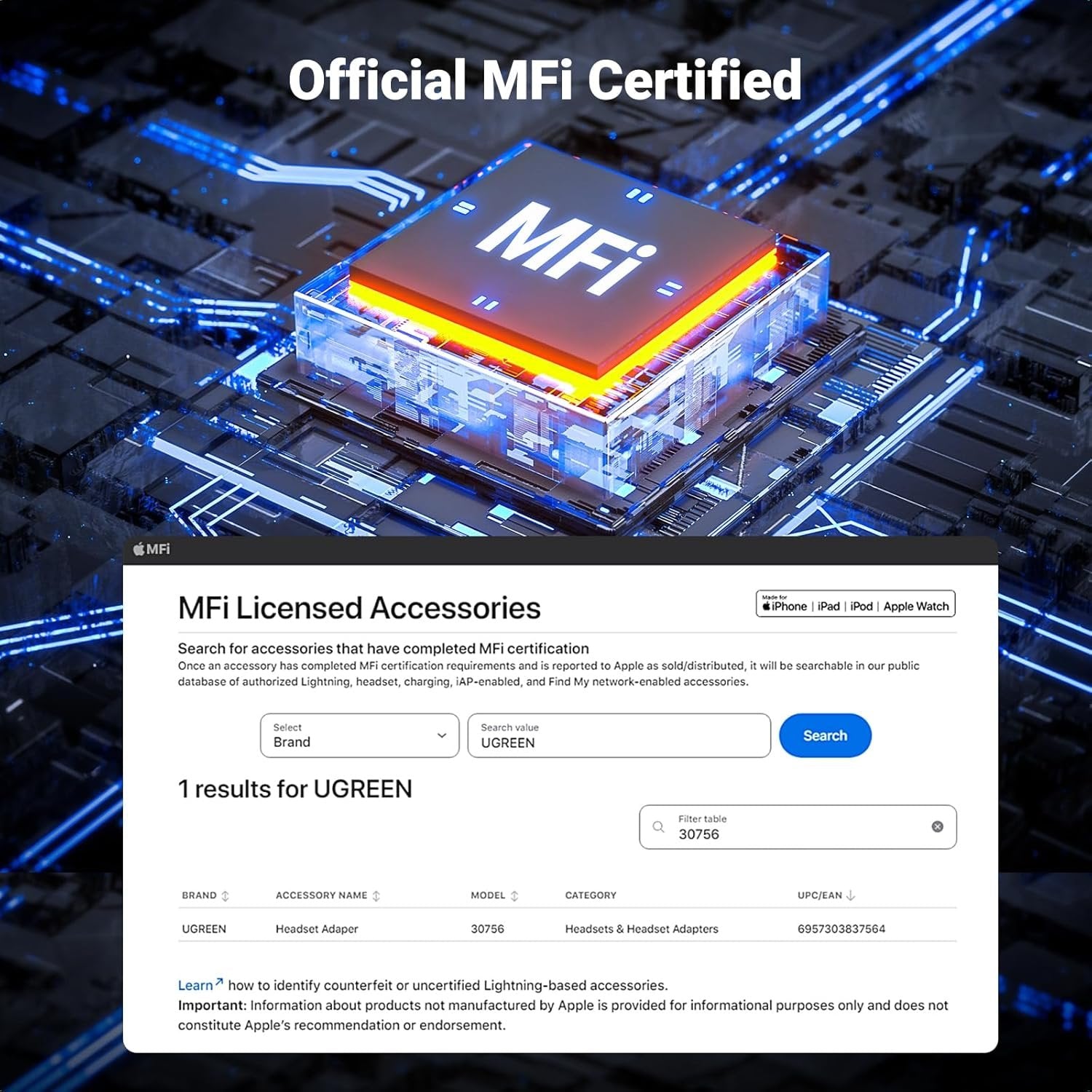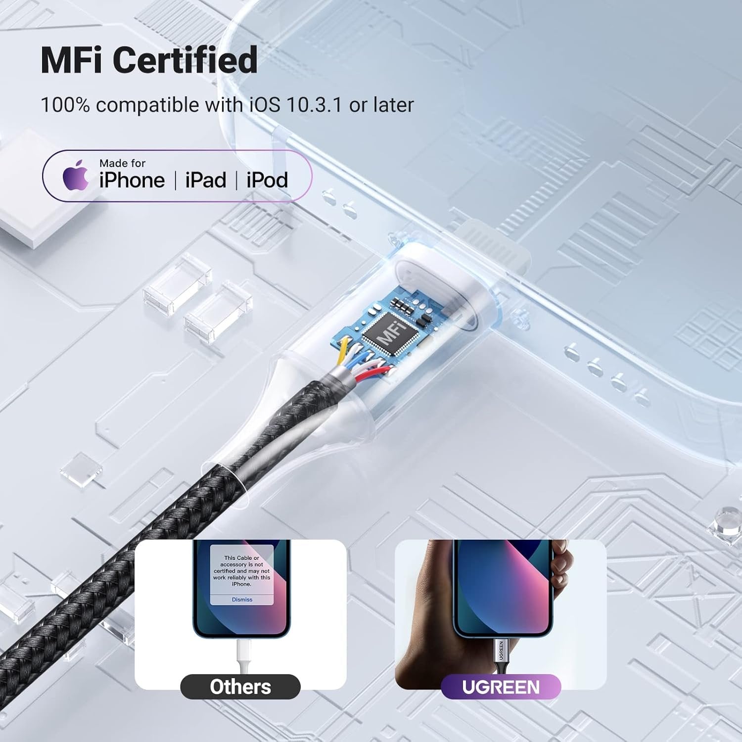 MFI Certified: UGREEN Lightning to 3.5mm headphone jack adapter can easily connect existing 3.5mm headset to iPhone 14 14 Pro 14 Pro Max 14 Plus 13 13 Mini 13 Pro 13 Pro Max 12 12 Pro 11 11 Pro 11 Pro Max X XR XS XS Max 8 7 for audio and mic without Lightning connector headphone. MFi Certified (PPID: 219693-1009): verified MFI chipset to ensure 100% compatibility with Lightning devices Universal Compatibility: Works with all devices that have a Lightning connector and support iOS 10.3.1 or later, including iPhone, iPad and iPod touch, such as iPhone 14 13 12 Series SE 2020 11 Pro 11 Pro Max 11 XS Max XS XR X 8 8 Plus 7 7 Plus, iPad Pro iPad Air Air 2 Air 3 mini 5 mini mini 2 mini 3 mini 4 iPad 4th gen iPod Touch 7 iPod touch 6 Multi-Functions: This Lightning to 3.5mm adapter is compatible with all headphone, support audio&mic function, in line control including volume control, calling. It allows you to control your music and take calls on the go. Kindly note: it can support audio&mic, calling for CTIA Android headphones, but it doesn't support volume control for CTIA Android headphones Everlasting Durability and Hi-Fi Sound Quality: The Nylon braided outer of the Lightning to 3.5mm cable is quite robust and flexible, making cables tangle-free and everlasting. This cable is made of Oxygen-free copper, ensuring high fidelity sound quality and providing maximum conductivity and durability Slim and portable design, easy to carry around. Premium aluminum alloy shell prevents scratches and rust, more durable