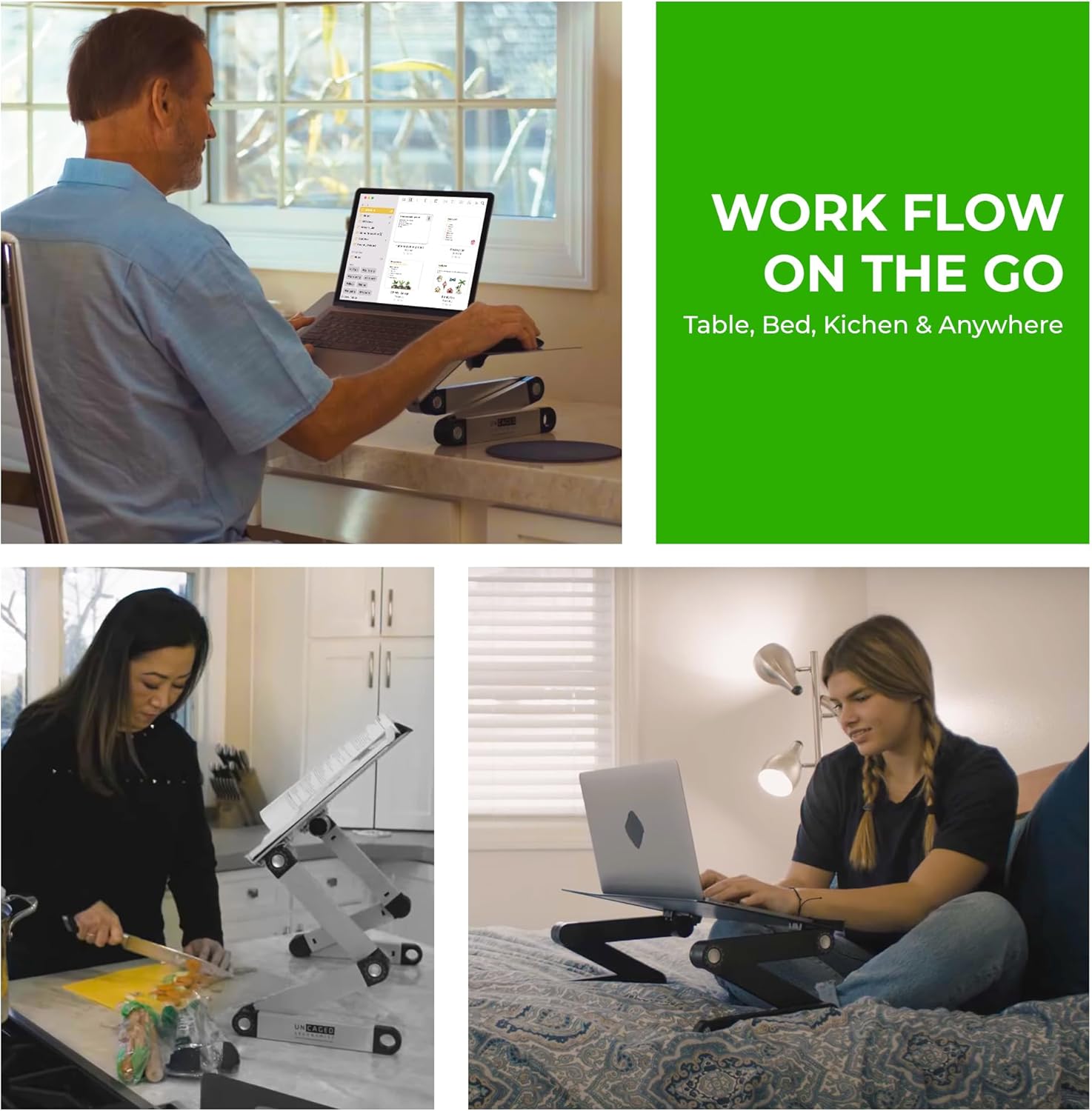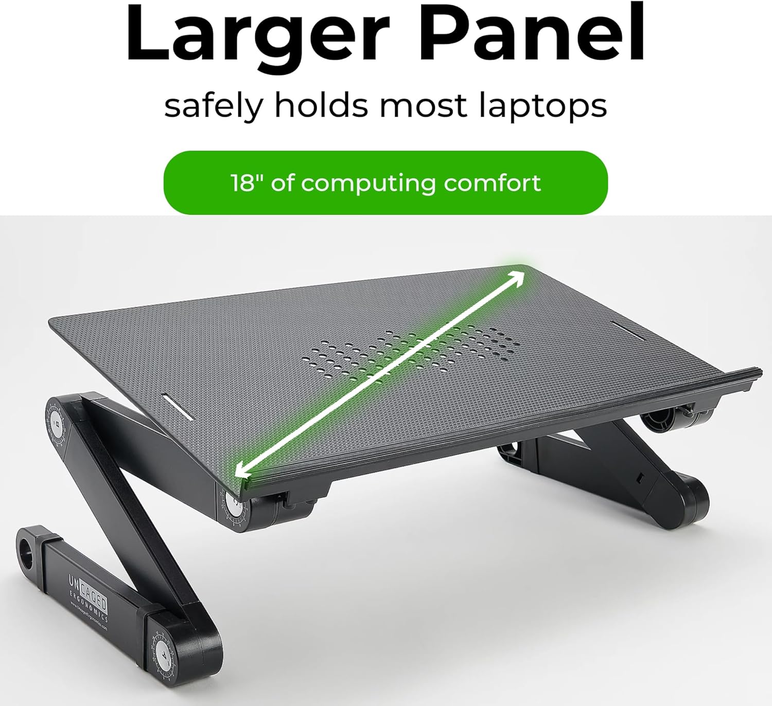 ERGONOMIC LAPTOP STAND RISER: This laptop stand for desk with adjustable height Improves posture by holding laptops in an ergonomically-correct position, helps reducing screen glare and promotes better sitting or standing positions at your desk. VERSATILE LAPTOP DESK STAND: Provides unparalleled comfort, allowing you to stretch out and move freely while using your laptop in bed or couch. Our computer and laptop riser for desk is perfect for watching movies, working, or browsing the internet. MULTI-PURPOSE FUNCTIONALITY: The WorkEZ BEST isn’t just a laptop stand. It’s a multi-functional workstation that can be used as a lap desk, reading table, or even a standing desk converter. Its versatility makes it an essential tool for anyone looking to improve their workspace ergonomics and efficiency. It is compatible with laptops and tablets up to 15.6 inches, making it suitable for a wide range of devices. AMBIDEXTROUS MOUSE PAD: The detachable mouse pad of this computer stand for laptop can be easily connected to either the right or left side of the panel which is useful for both right-handed and left-handed users. Can fit a laptop stand for 17 inch laptops and various laptop sizes. NATURAL COOLING WITH ENHANCED STABILITY: The 16.5x11" aluminum panel on this laptop cooling pad effectively dissipates heat, keeping your laptop cool without the need for noisy fans. The built-in cooling holes enhance airflow, while the non-slip silicone rubber wrist guard and traction bands ensure your devices stay securely in place, even on smooth surfaces.