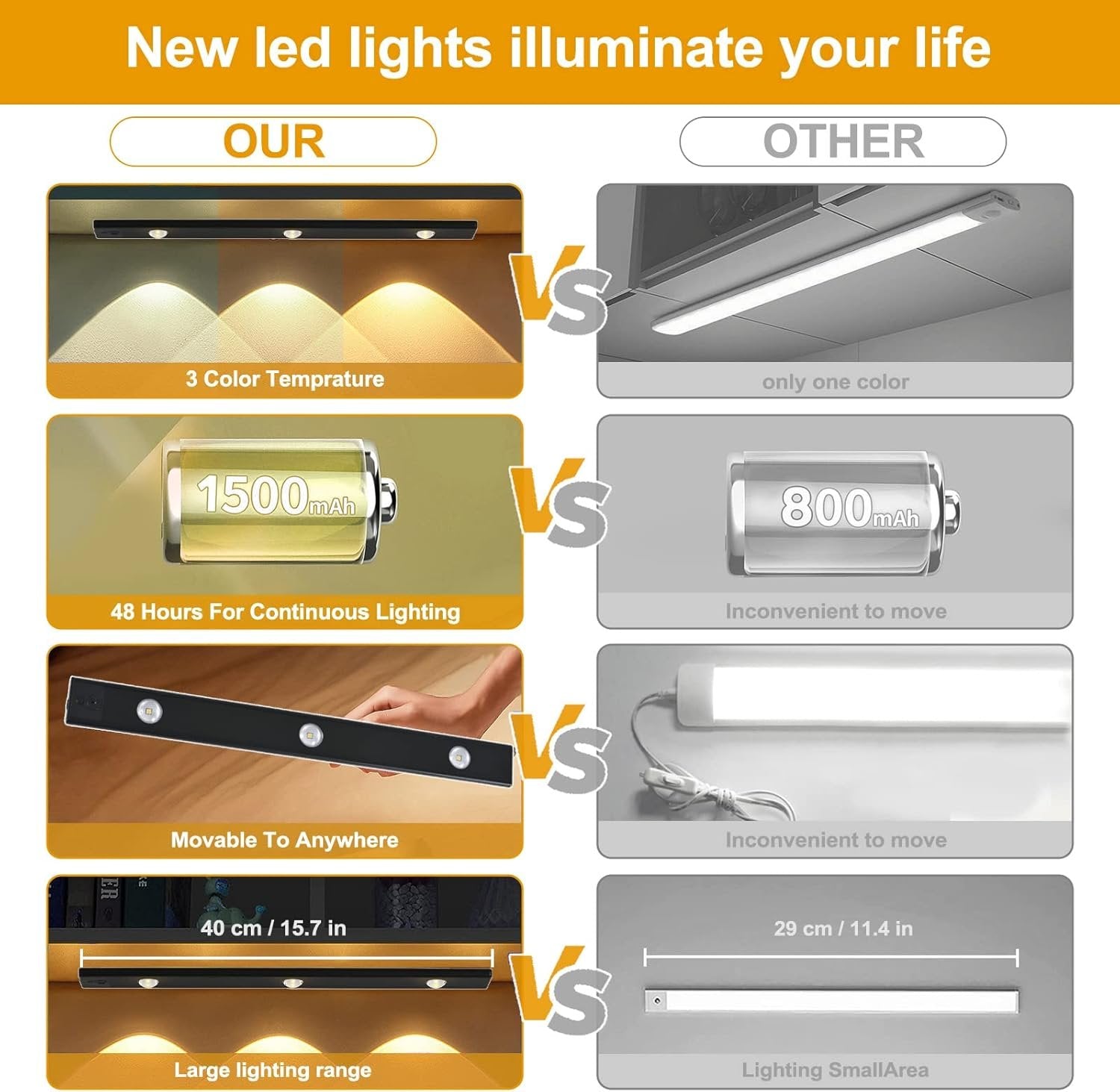 ✅Wireless motion sensing cabinet light: LED cabinet lights use PIR infrared motion technology, which has higher sensitivity to the human body. Wireless cabinet lights make use and installation easy. Perfect for bedrooms, closets, cabinets, workshops, garages, stairwells, hallways, storage rooms, etc. ✅Motion sensor light indoors: The under-cabinet lights turn on automatically when the human motion of 10 feet/120° is detected and turn off 25 seconds after the person leaves. Night mode is smarter and turns on LED lights based on ambient light. ✅Closet lights easy to install: The kitchen cabinet light can be directly installed on the iron frame; you can also use the provided 2 pieces of adhesive with metal sheets to fix it in any other place. ✅Adjustable light color: The under-counter lights for the kitchen have three color temperatures, warm color(3000K), natural color(4500K), and cool white(6000K), single press to change the light color, you can choose the color temperature according to the usage scene. Long press the control button to dim or brighten the kitchen cabinet lighting according to your needs. ✅Rechargeable cabinet lights: Equipped with a 1800mAh large capacity battery, our under-cabinet light can work up to 60 hours (about 6 months) on a single charge and can be easily fully charged within 4 hours via a USB cable.
