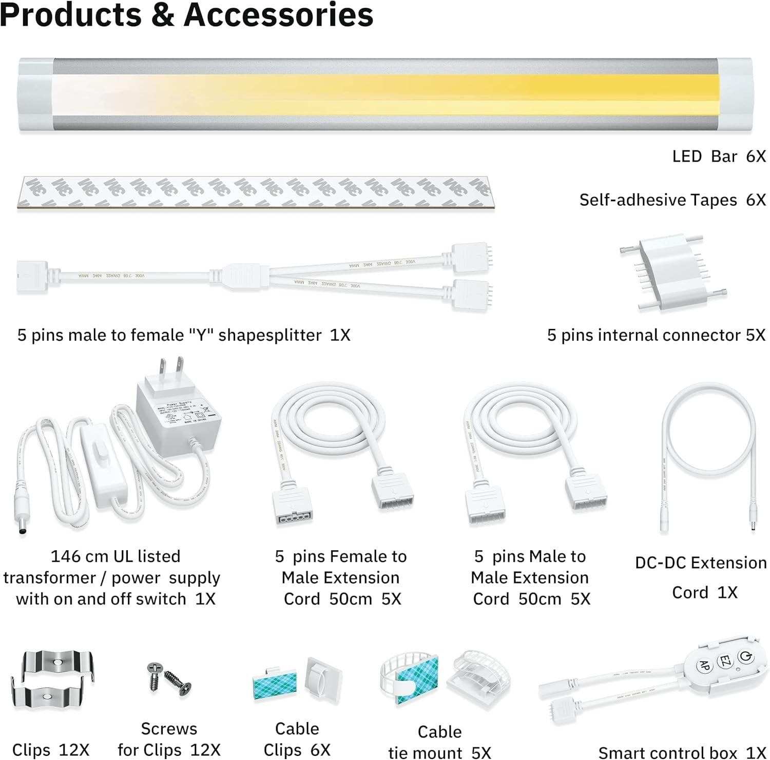 【Voice Control】: Work with Amazon Alexa, Echo ,Echo dot ,Google Home Assistant ,Smart things.Control the smart under cabibet lighting system by voice , give a voice command to turn on/off , select the color temperature or dim/brighten your light (e.g. ‘Alexa, set the kicthen to Cool white’) 【APP Control】: Easily adjust the light’s color temperature, brightness, or turn the system on/off through the smartphone app. Control your lights anytime, anywhere, even when you're away from home. Rename devices and schedule timers directly within the app for added convenience. 【CCT 2700K-5000K】: Offers dimmable white light ranging from warm white to cool white (2700K-5000K) with adjustable brightness from 10% to 100%. No need to worry about matching the LED lights to your interior design — you can easily adjust both color temperature and brightness to perfectly suit your space and meet all your decorative needs. 【Wide Application and scene system】: each light bar is 12 inches long, linkable and expandable,offering enhanced flexibility for light positioning. Set different light modes on smart life to match various occasions including kitchen, living room, bedroom, program your favorite color temperature and brightness as scene. 【Accessories】This is a cabinet light kit , please check all accessories listed in the user manual . Need extra Accessories, please order it via the ASIN below. Lights bar B08SH5KDBY , Control Box B08PYXPSRP , Transformer B07PJG7BVC , Extension cord: 5pins B08PV7CK9Z .