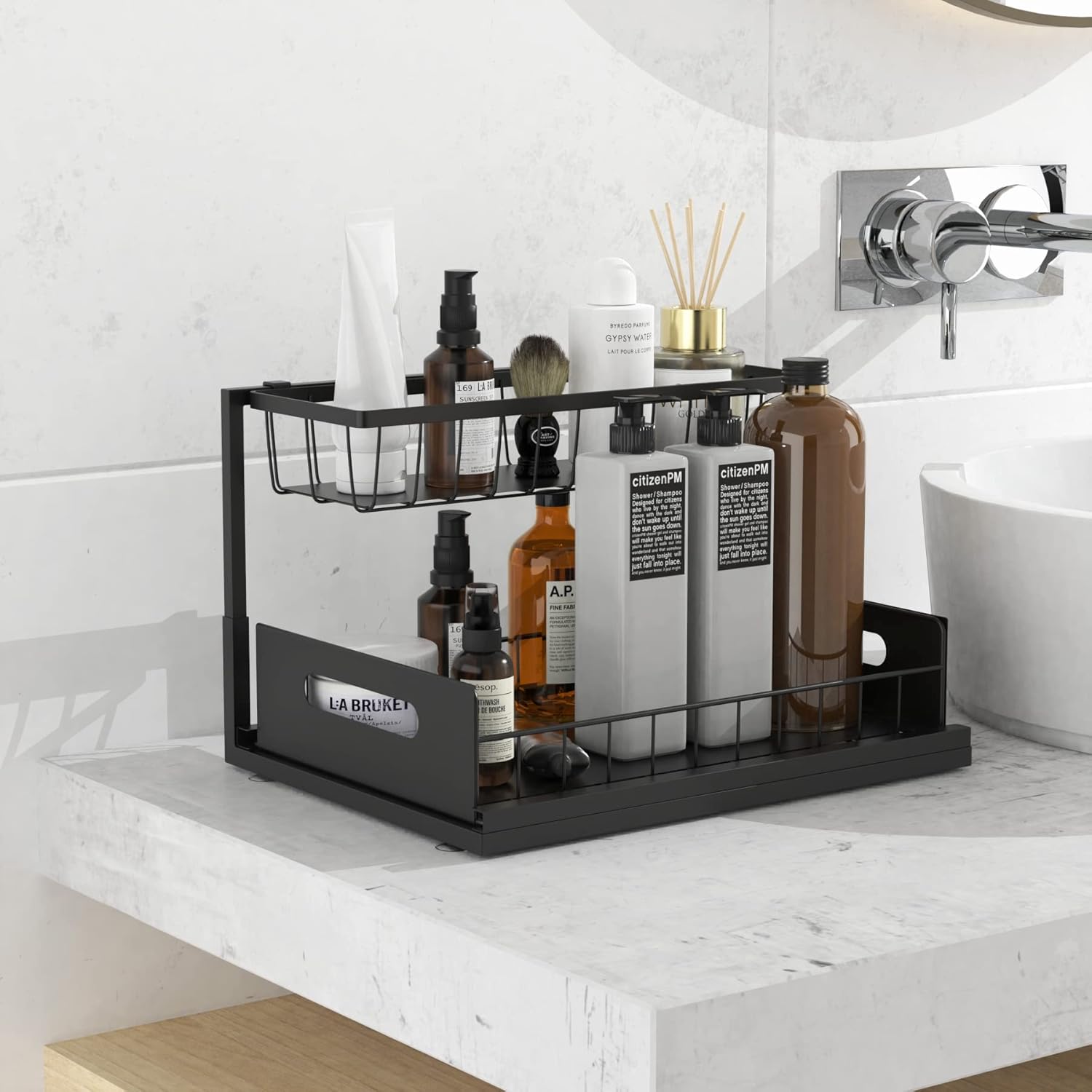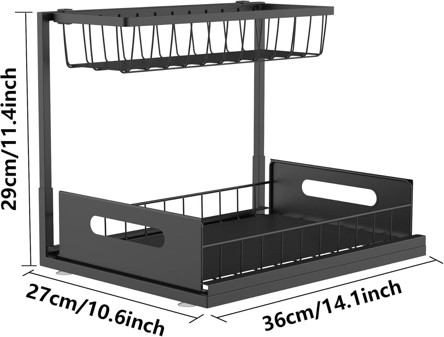 2 Tier Organizer: narrow at the top and wide at the bottom, the top is not affected by the sink piping; the bottom leaves a proper space for taller bottles, maximizing the use of storage space under the sink Pull Out Drawer: The lower level is a sliding drawer with handles. Suction cups on the bottom keep it securely in place, allowing you to access items stored on the bottom from either side without fear of it falling over Made to Last: Made of high quality steel, baking lacquer process can keep the luster in humid air. Sink shelf is grid designed to prevent water accumulation; with 2 pads to prevent small objects from falling Easy to use: Easy to disassemble and install without any tools, easy to clean; can be used as a cleaning supplies organizer, bathroom countertop organizer, kitchen spice rack or office supply rack storage, etc Multi-purpose organizer: Vanity cabinet shelf organizer measures 14.1 "Lx10.6 "Wx11.4 "H; ideal for sinks, bathrooms and kitchens, and can be a holiday or housewarming gift for your friends or family