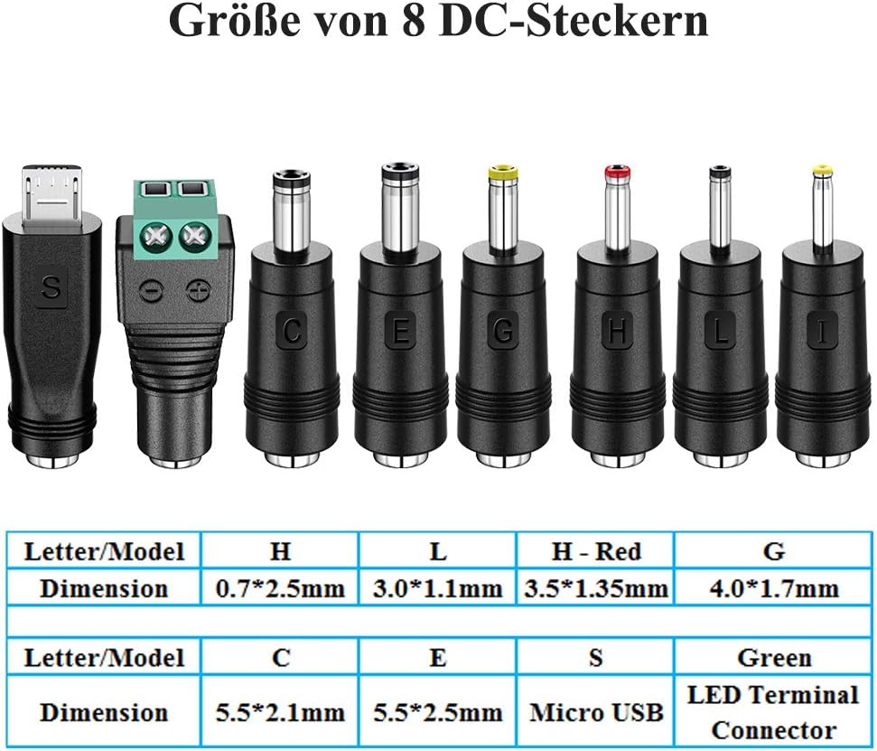 Adapter Input: AC 100v~240V 0.25A 50/60Hz, Adapter Output: 3V/4.5V/5V/6V/7.5V/9V/12V - MAX 2000mA This replacement power adapter provides a range of voltages, interchangeable tips, FULL PROTECTION of overvoltage / overload / short short / above temperature. [Multifunctional Universal Charger] Variable voltage is easy to select, you can convert to different voltage with ease by using the provided button. The power adapter is equipped with 7 selectable adapter tips, which can be useful for various appliances. [Upgraded Version] Newly designed plugs to make the charger easily inserted, a new 1.5m long cable, made of compact material and add a magnetic ring. BONUS: There is also a Micro USB plug so this item can also work as an adapter to turn any USB cable into a charger, such as phone and camera. [Exactly what you are looking for] Reasonably priced and versatile adjustable charger, different output sizes and different voltage levels. Safe to operate, convenient to set the correct voltage and easy to connect the adapter connectors. Support 12V 1A 2A devices. [All-in-One Adapter] This 8 adapters in 1, which largely can save your space and this can replace a lot of chargers. Attention: DC plug polarity: internal positive (+), external negative (-), polarity is not reversible.