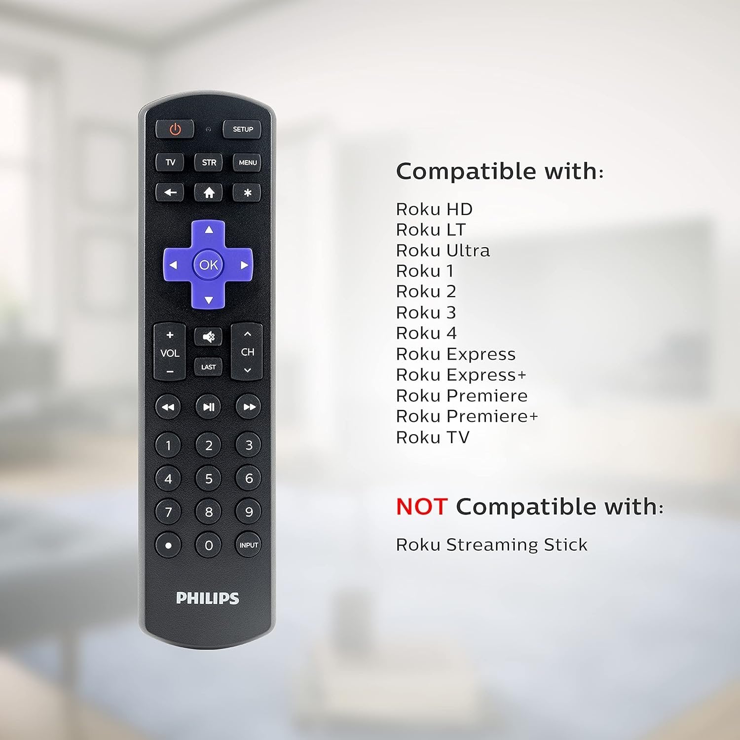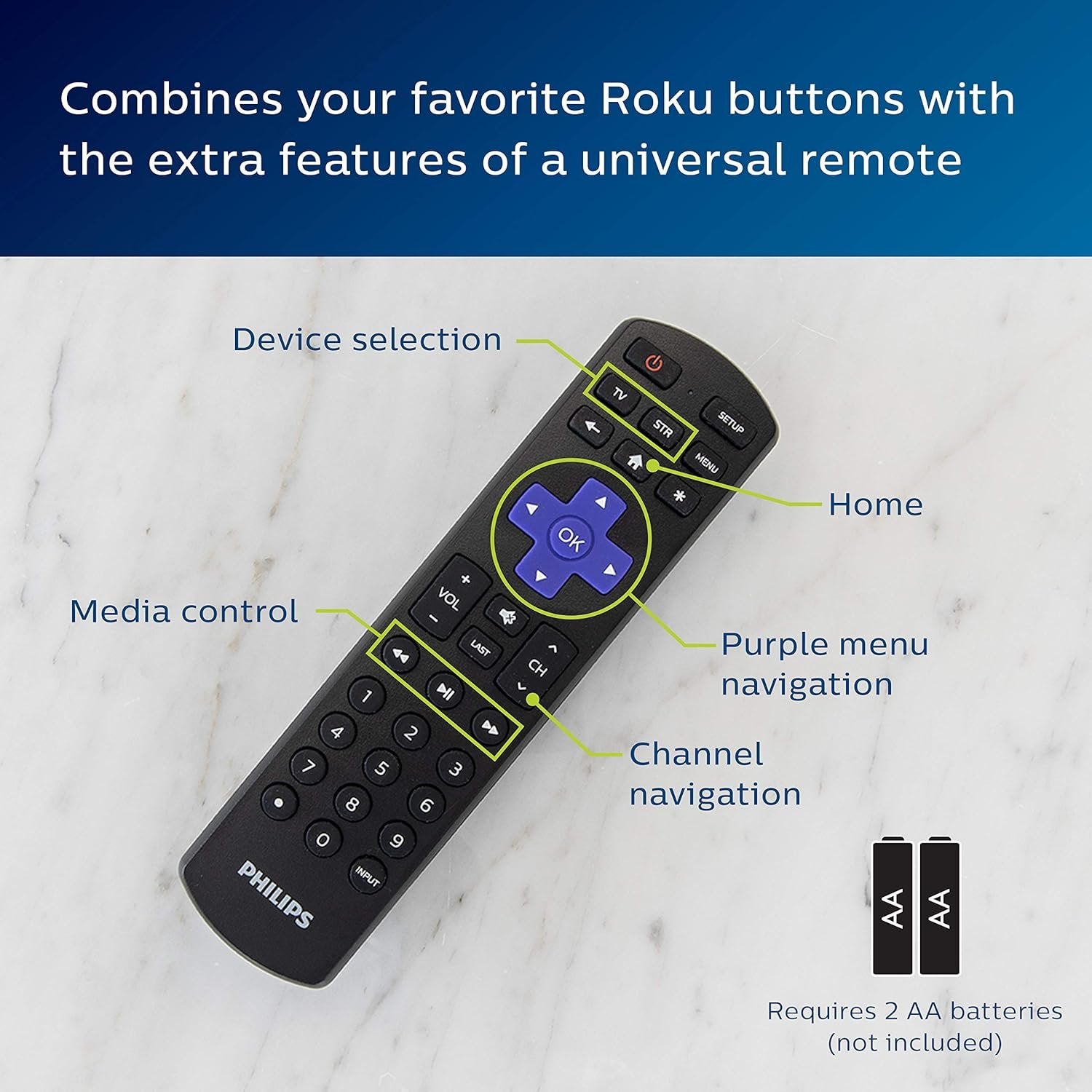 FAVORITE ROKU BUTTONS – Includes the same navigation buttons you’ve grown to love such as Roku’s signature purple menu button, home, OK, a streaming app hotkey, and more with the extra features of a universal remote LIMITLESS ENTERTAINMENT – Leave your lost or broken Roku TV remote behind and get back to binge watching your favorite shows on Netflix, Hulu, Disney Plus, Amazon Prime, and more SIMPLE SETUP – Preprogrammed for immediate use with Samsung TVs and Roku streaming boxes this universal remote provides simple, user-friendly setup with automatic code search and direct code entry, as well as primary audio control to let you adjust the volume level no matter which device is being used. Requires 2 AA batteries (not included) BEST REMOTE CODE LIBRARY – This universal remote works with all major brands such as LG, Samsung, Sony, Sharp, and Panasonic and supports thousands of the latest audio and video devices. Does NOT work with Roku streaming sticks TRUSTED BRAND – This replacement remote is back by a 90-day limited warranty and free U.S.-based technical support. Call the experts at 1-844-816-0320 between 7AM and 8PM Central Time with any questions or issues with your purchase