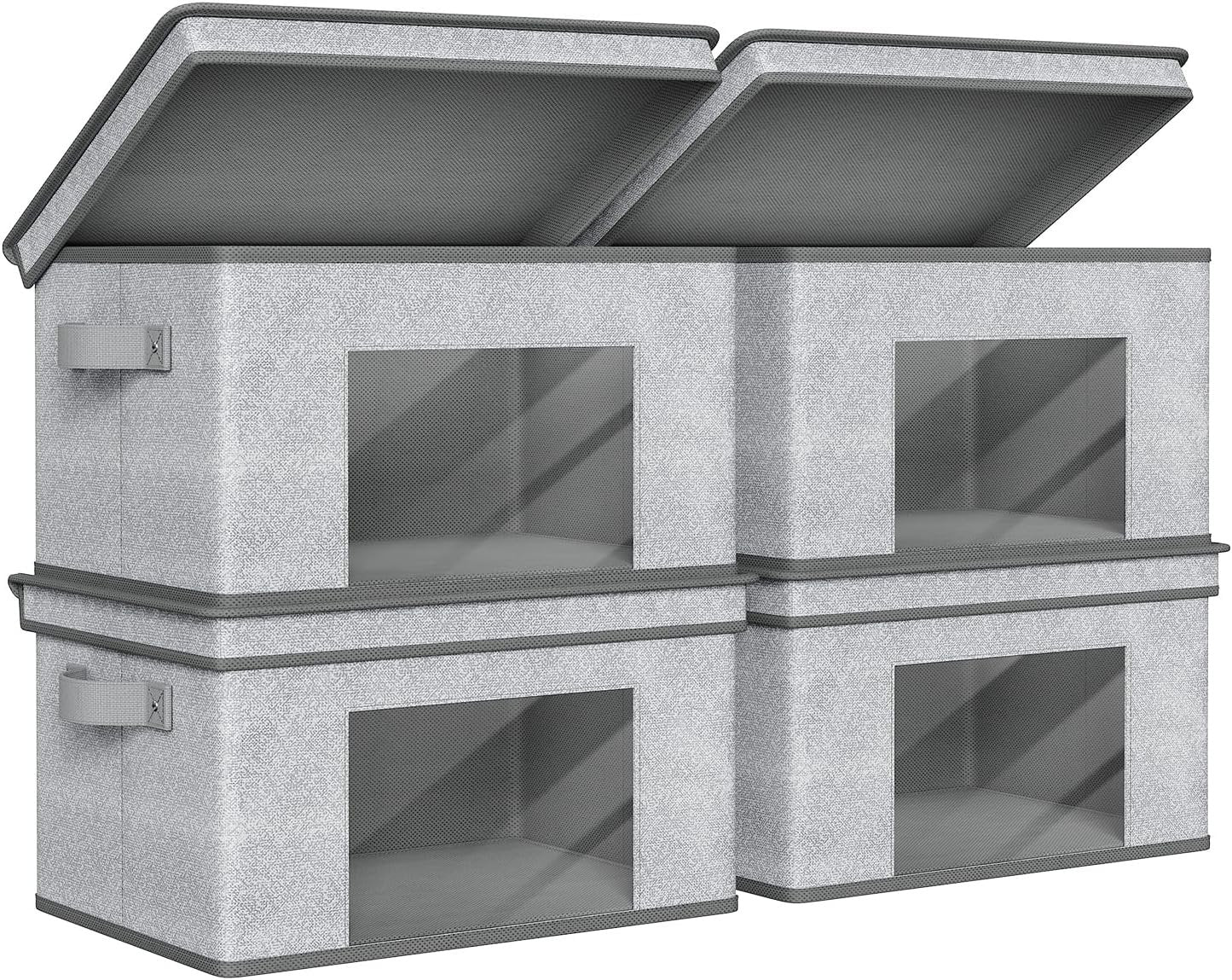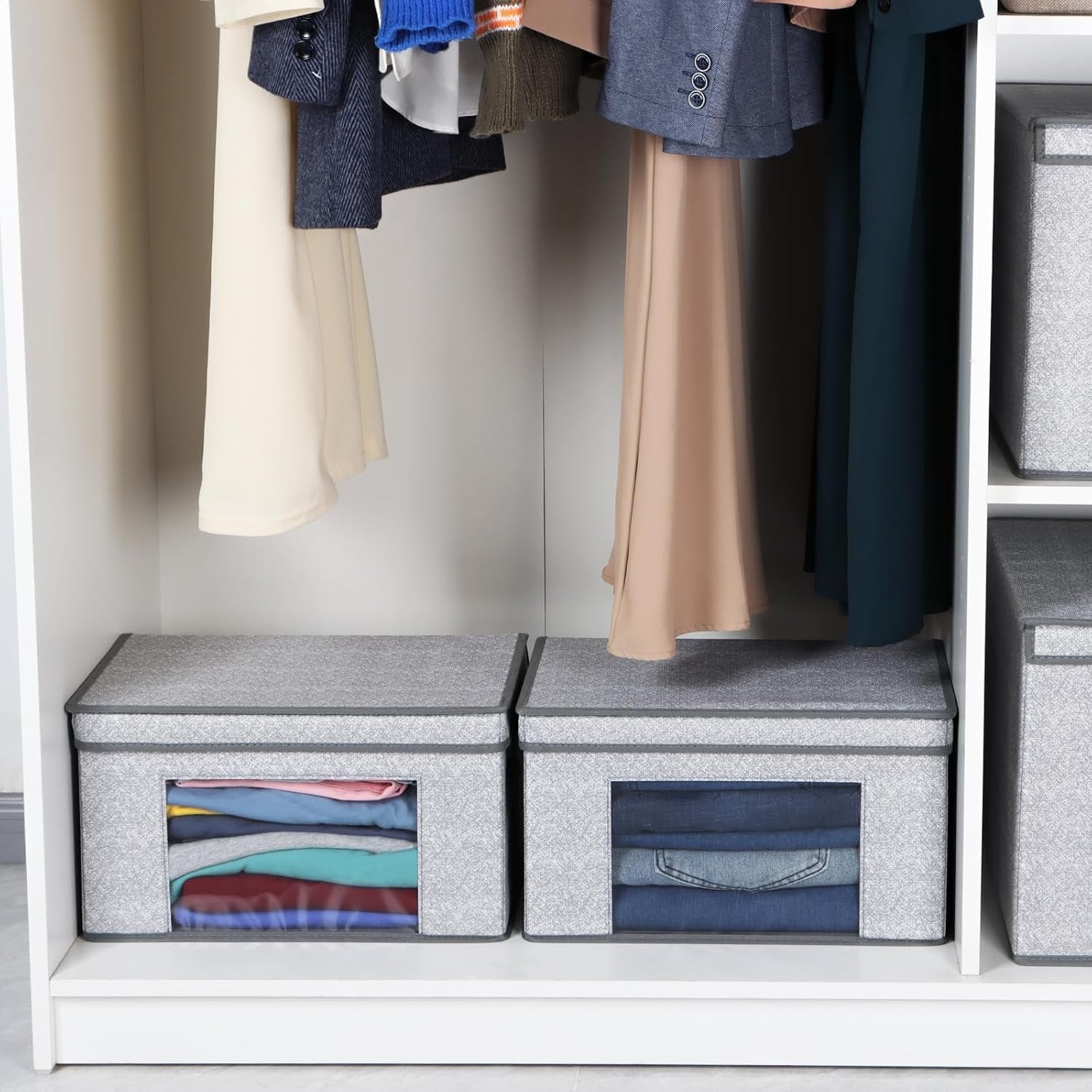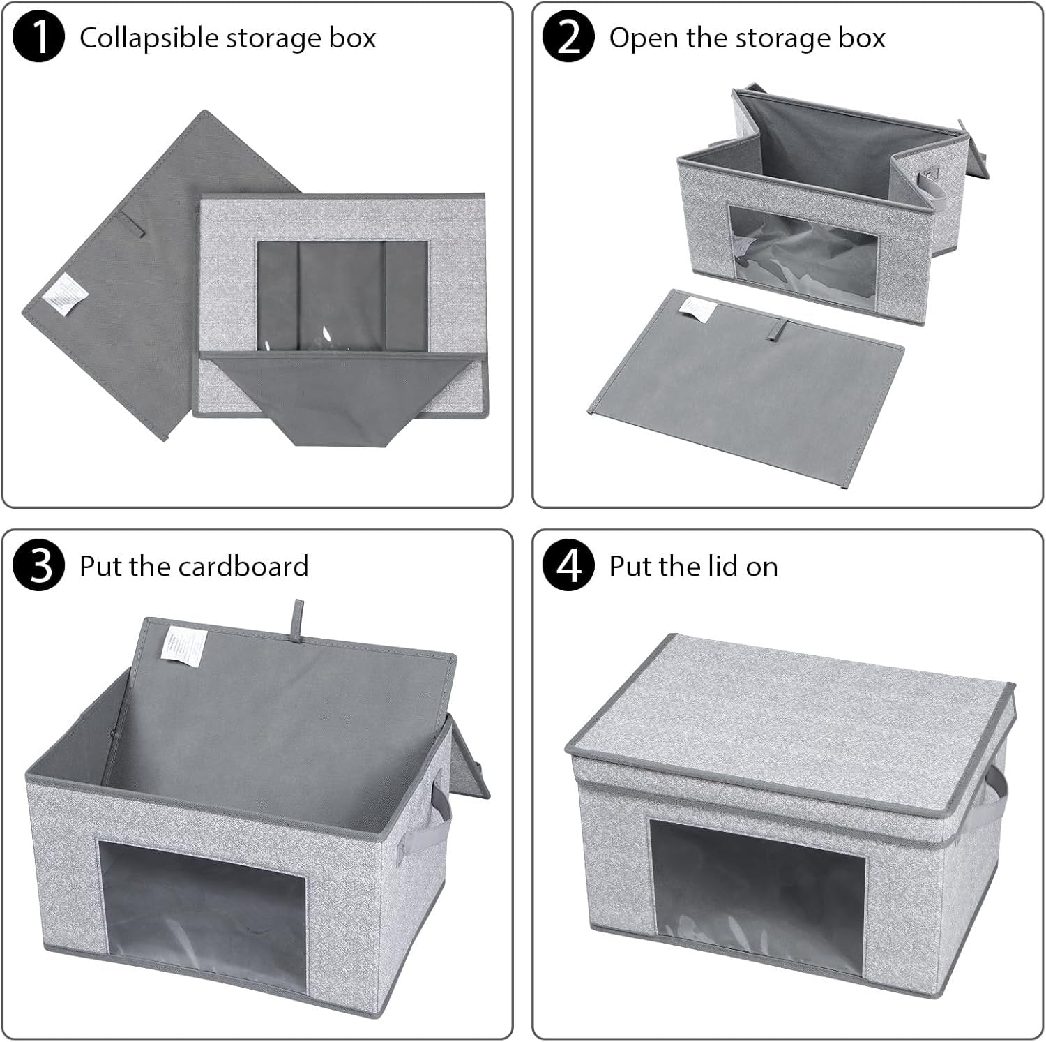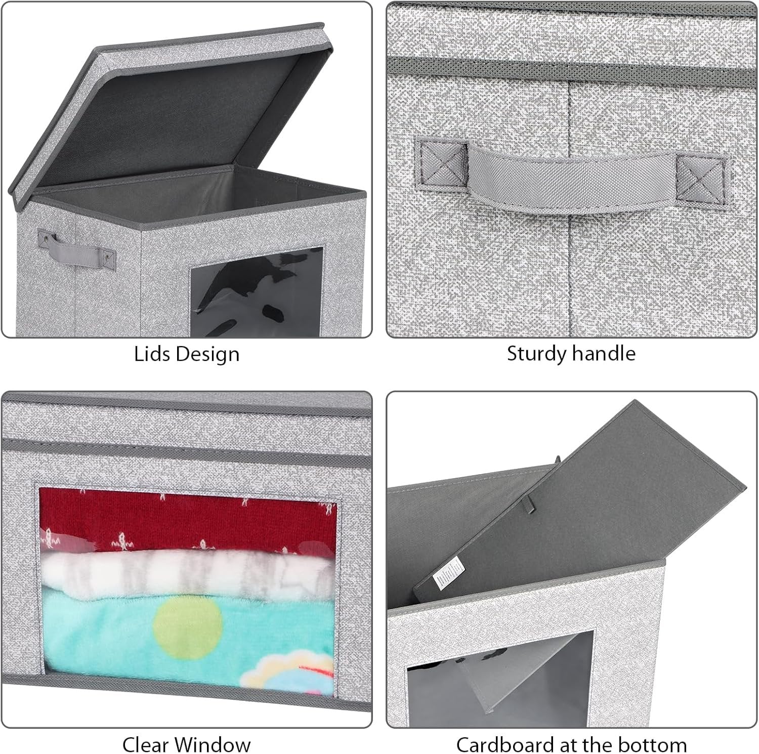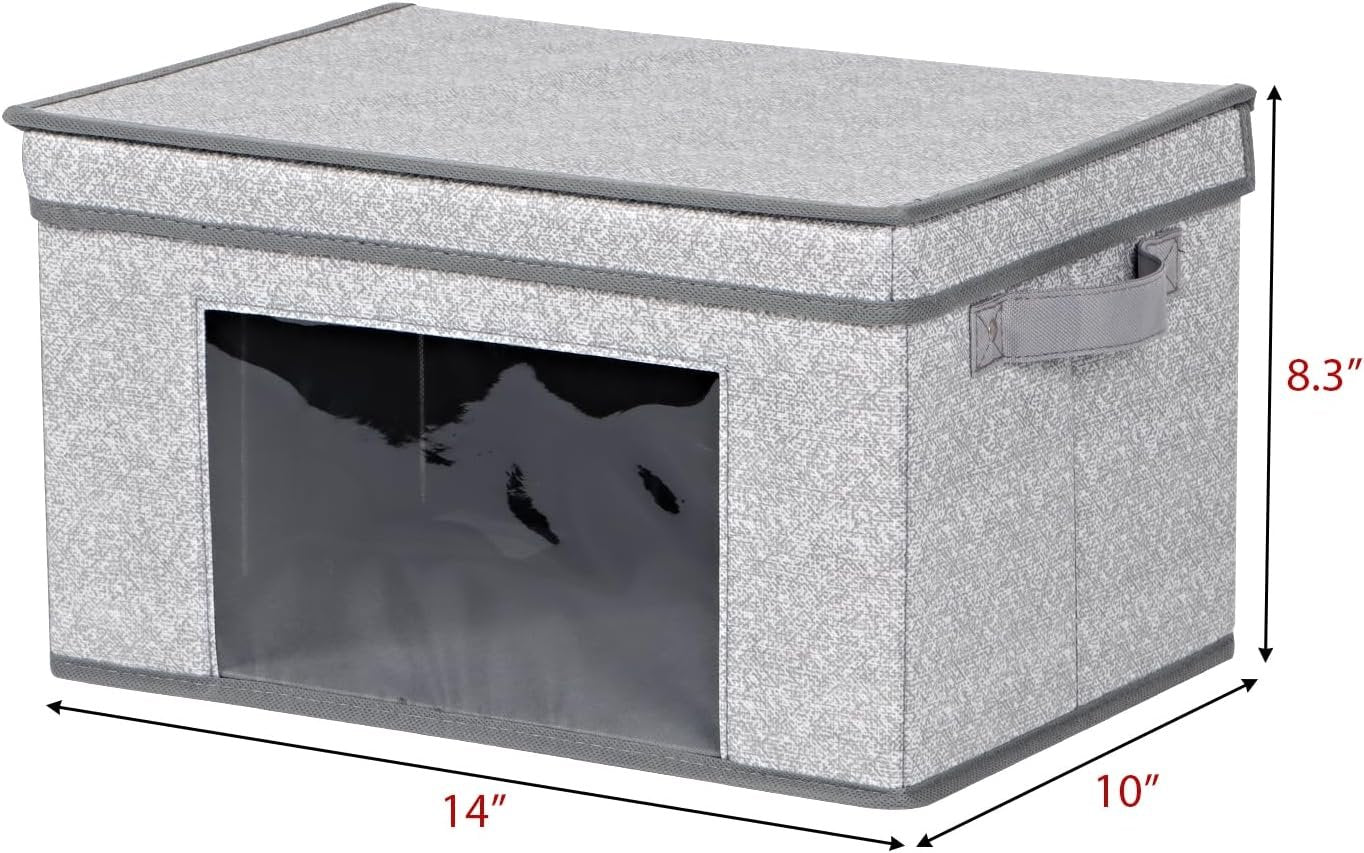 【Large Storage Bins with Clear Window】 -The size of this storage boxes is 14.4 " (L) x 10" (W) x 8.3" (H). It can organize your seasonal clothes. The transparent window design makes stored stuff clear and see-through in the Storage Bins. 【Stackable High Load Capacity】-This storage bins are made of durable non-woven fabric with the high quality cardboard on the sides and bottom. Dust-proof storage bins reinforced with cardboard can support a weight of up to 30 lbs.Suit for stackable to put on shelves, inside closets,efficient use of vertical space to save your room space 【Sturdy & Durable】- This storage bins are made of durable non-woven fabric with the high quality cardboard on the sides and bottom. The storage boxes with lids won't be deformed even it's full. Design of handles in the storage bins on both sides easy access keeps it stable when moving. 【Foldable with Lids Design 】-Storage baskets with flip-top lid, can prevent dust, make your clothes or towels always clean. Collapsible boxes for compact storage when not in use. 【Satisfaction Guaranteed 】- If you have any concerns on box set or this storage boxes have quality problems within two years, please feel free to contact us at any time. We will reply to you and solve it within 24 hours.