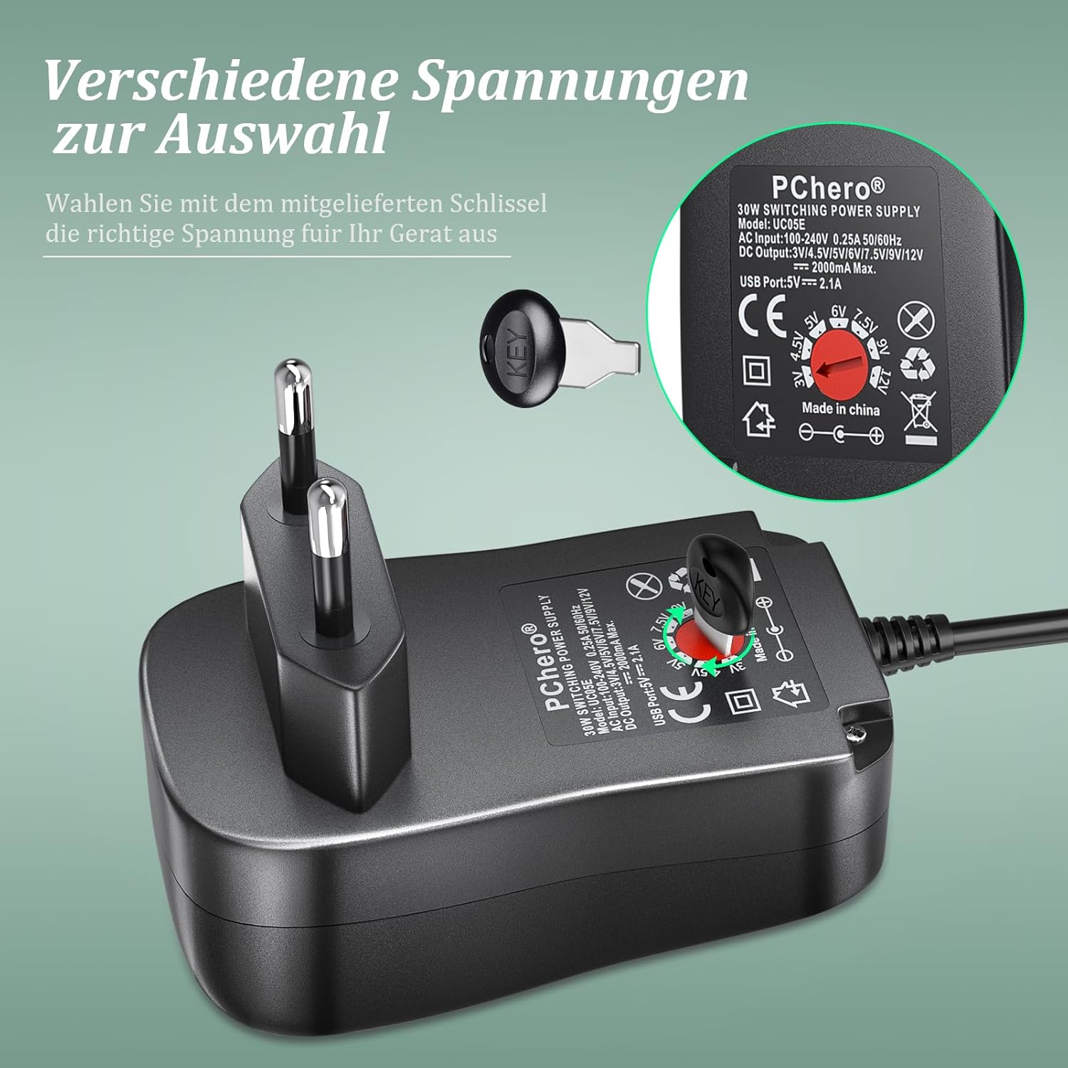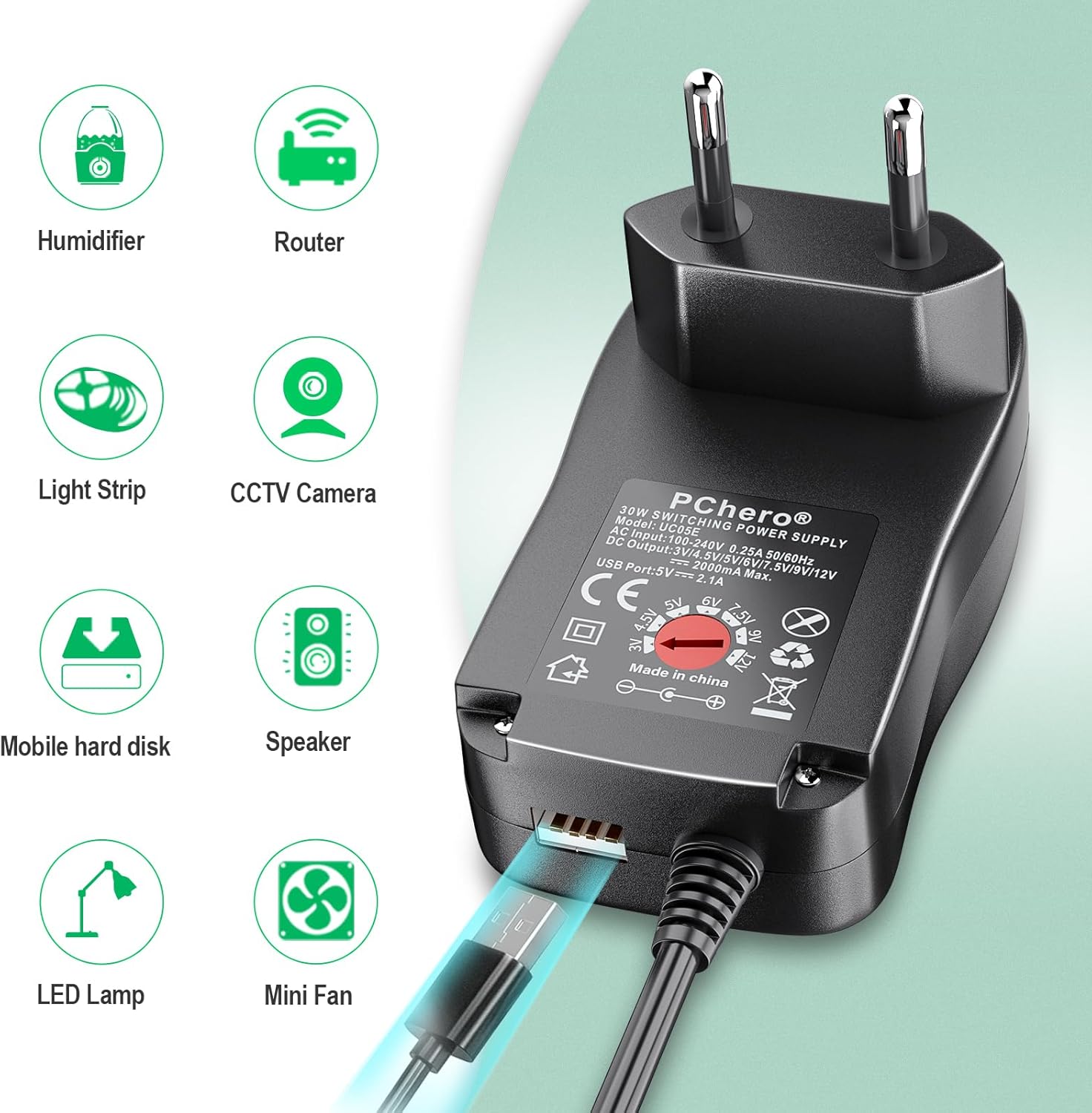[Upgraded Version] PChero 30W AC/DC Universal Switching Electric Power Adapter with 9 DC Plugs, Including USB Socket for 3 V to 12 V Household Electronic Devices – 2000 mA Max.