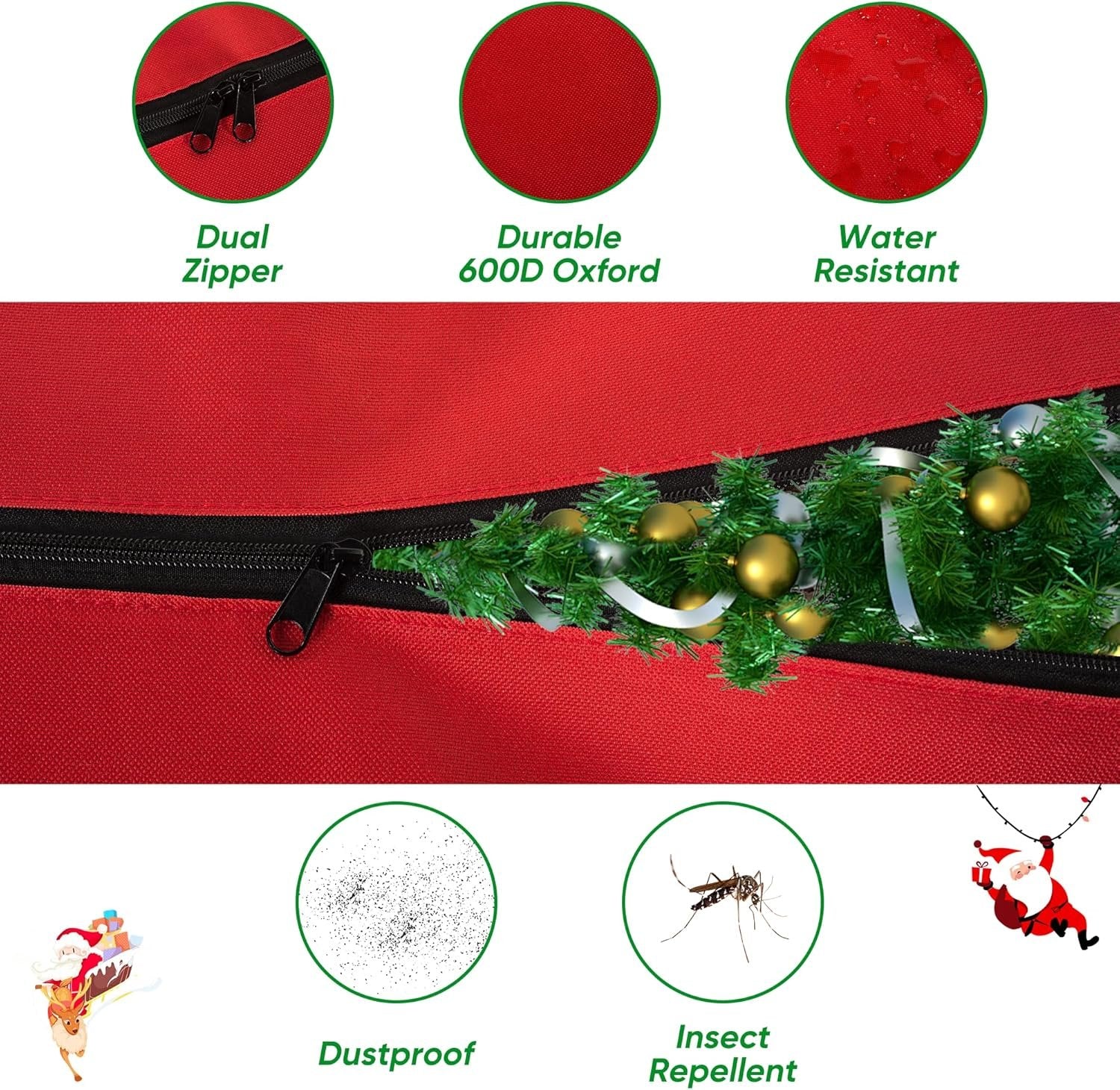 Holds 7.5ft Tress - At 48'' long, this durable tote can store up to a 7.5-foot artificial tree once it is broken down into sections. This handy storage option replaces old and damaged boxes your holiday decorations came in and folds flat when not in use. Easy storage - A must-have after the holiday season, this Christmas tree bag will store your tree away neatly, effortlessly and make for quick set-up next year. Simply place your unassembled artificial tree in the bag, zip it up and safely store it away. Durable construction - The storage bag is made of a woven polypropylene tarp-like material designed to be strong, durable and tear-resistant. Your Christmas tree will be protected against dust, insects and moisture so it can last for years to come! Product Details - Material: 600D waterproof Oxford fabric. Dimensions: (L) 48''x (W) 15''x (H) 20''. Fits up to a 7.5-Foot Unassembled Artificial Christmas Trees. Zipper Closure. Shape: Rectangular Duffel. Color: Red with Black Handles.