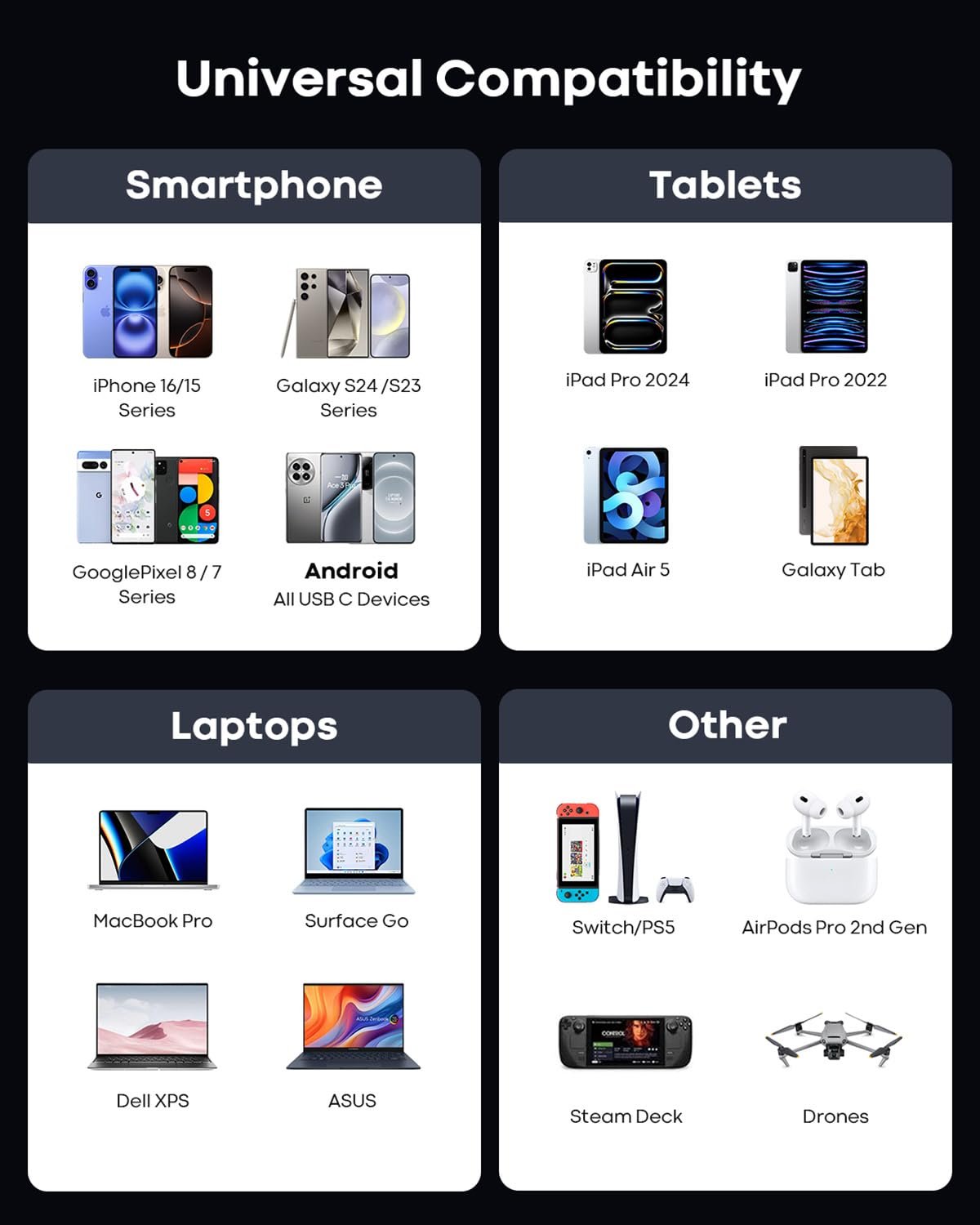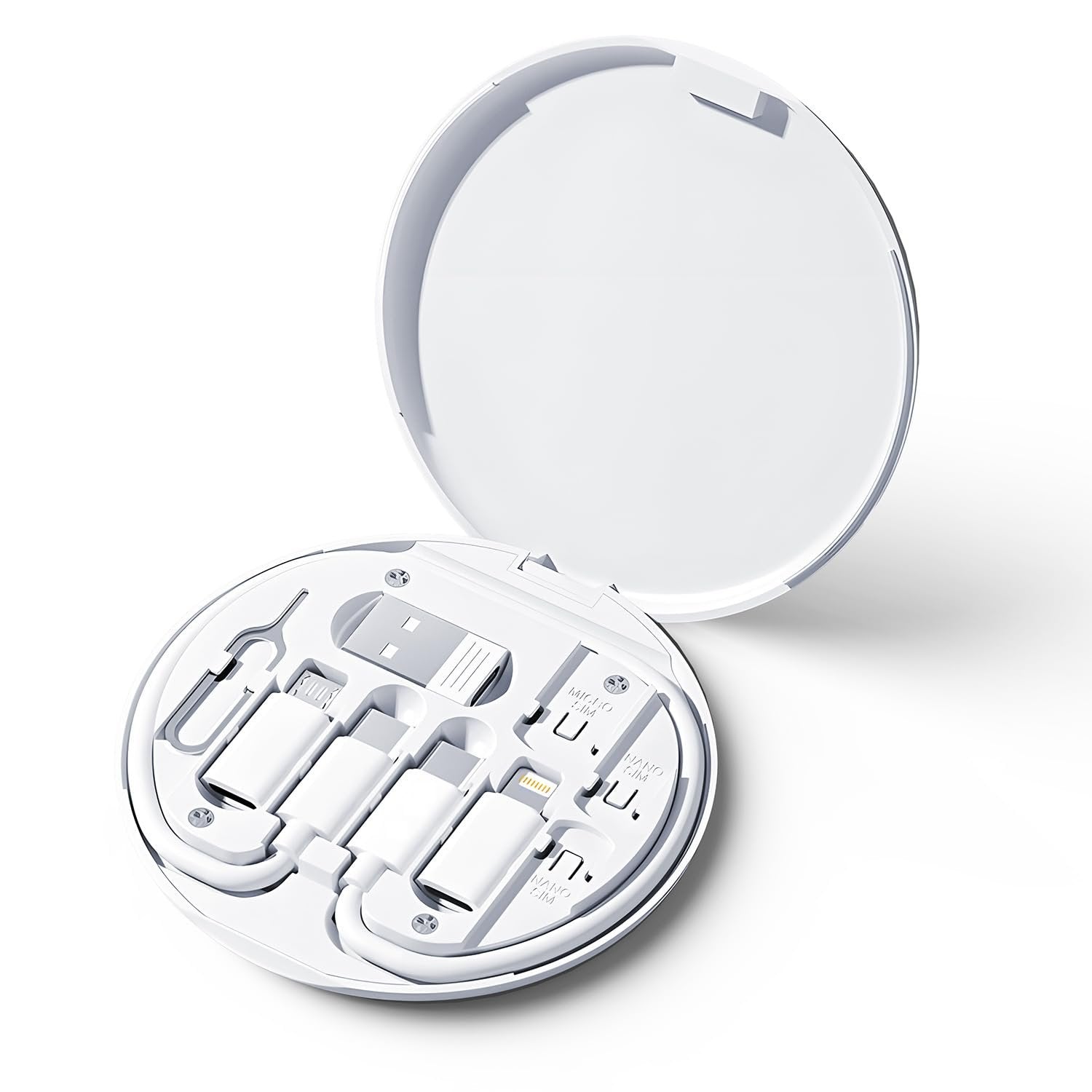 [DIY Interchangeable Plugs]: The kit includes four different ports (USB-A, USB-C, Micro, IP) suitable for charging, transferring data, and converting for both Android & IOS or other devices. It also features three mobile phone card storage slots (2 * NANO SIM card, 1 * MICRO card) and one SIM eject tool. Additionally, it serves as a convenient cell phone stand. [Fast Charging & Data Transfer]: This device supports a maximum of 60W PD fast charging and offers USB 2.0 480Mbps data transfer capabilities. It is compatible with various types of power charger adapters ranging from 5V20V 5W60W. For more detailed information, refer to the "Detailed description. [Multifunctional USB Cable Storage Case]: This case offers wide compatibility with various devices including phones, Android smartphones, tablets, laptops, power banks, USB-A charger adapters, PD charger adapters, Bluetooth headphones & speakers, portable external hard drives, wireless Bluetooth mouse & keyboards, cameras, and more. [Light Small]: With dimensions of only 3.3*0.4 inches, this storage case is incredibly compact and portable. Whether you're traveling, camping, in your car, office, or at home, it easily fits into your pocket or bag for convenient storage. [Easy To Use]: A single "portable cable storage box" resolves a variety of electronic product charging and data transmission issues, offering simplicity and ease of use.