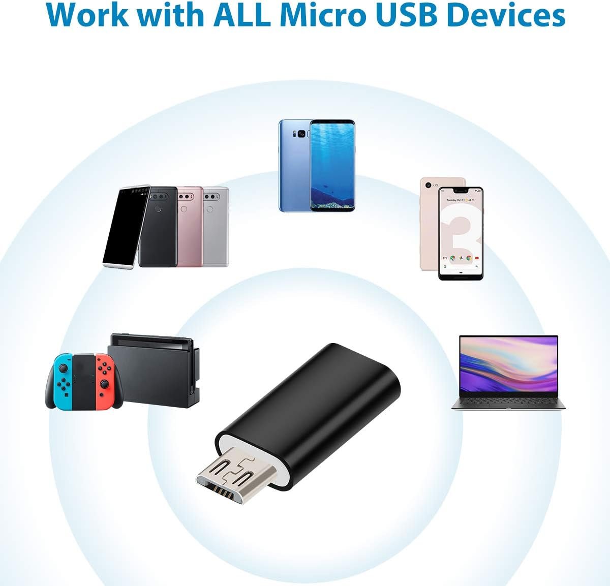 !!Please Note!! - ①The speed of data transfer and charging depends on the wall charger and Micro USB cable used. ② Our adapter does NOT support OTG, please don't connect to a (thermal) camera or mic/speaker Data Transfer & Charging - Micro USB to USB-C adapter with data transfer speeds of up to 480 Mbps and an internal 56k resistor to protect your device from high current while charging, our Micro USB to USB-C adapter is perfect for transferring data and charging your devices Plug & Play -USB C to Micro USB adapter features a reversible USB-C port, making it easy to insert in either direction, and a minimalist Hot-Swap design that requires no additional drivers or installation Universal Compatibility - Compatible with a wide range of devices including S7/S7 Edge/S6/S6 Edge, Note 5/4, Tab 4 3, LG G3/G4, Nexus 4/5 and other Micro USB 2.0 devices, our Micro USB to USB C adapter is versatile and convenient Durable & Reliable - Type C female to Micro USB male adapter is made of premium aluminum alloy and plastic shell for long-lasting use