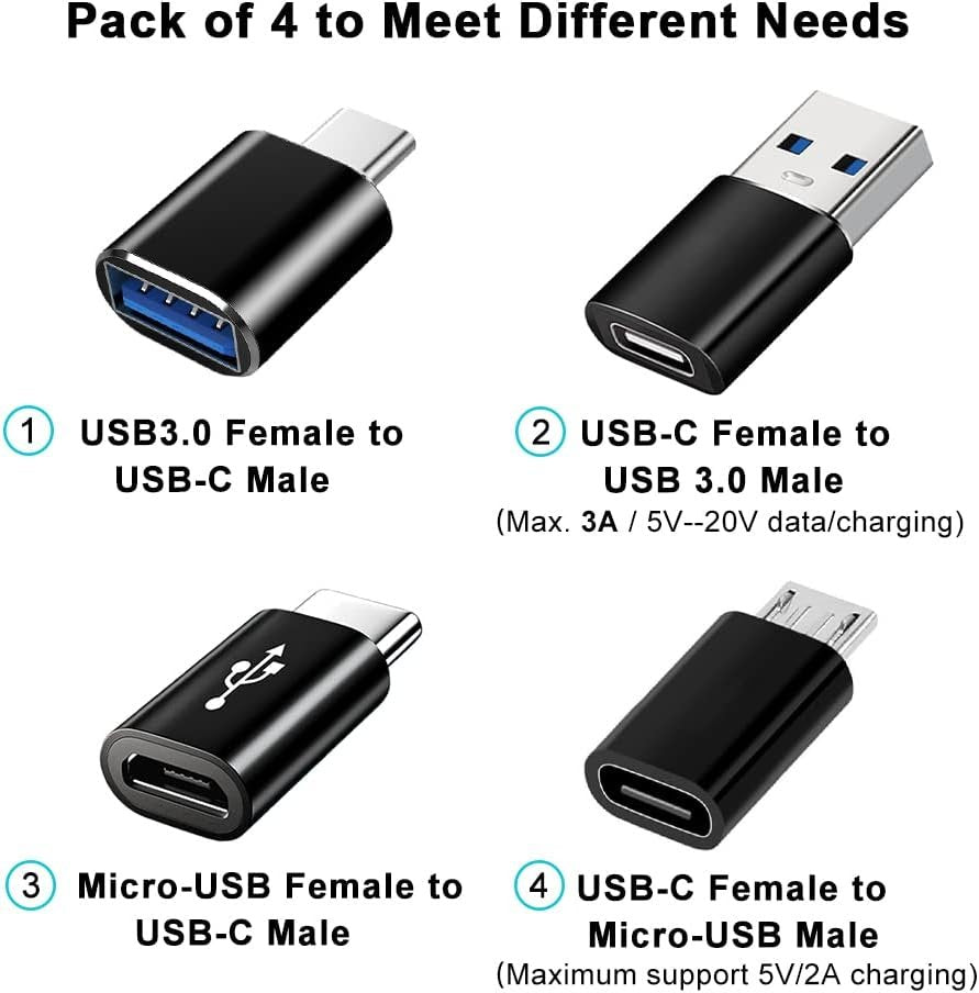 USB C Adapters Combo: USB 3.0 Female to USB-C Male Adapter x1, USB C Female to USB 3.0 Male Adapter x1, Micro-USB Female to USB-C Male Adapter x1, USB-C Female to Micro-USB Male Adapter x1. Compatible with USB cable, USB flash drive, USB card reader, USB keyboard, mouse, etc. Mepsies USB C to USB 3.0 OTG adapter works with phones, tablets, laptops and more. Plug and play, support USB OTG (On-The-Go) function, data transfer becomes so easy. Pack of 4, black. You can keep some USB-C adapters at home, at the office, or in the car to meet the needs of different occasions. These USB-C adapters convert normal standard USB port, USB-C port and Micro-USB port freely, and you will find it so handy. The USB to USB C adapter features aluminum body and plastic body, refined and durable, compact and portable. USB-C OTG Adapters: Compatible with MacBook, Samsung Galaxy S8/S9/S10/S20/S21/S22 etc, Note 8/9/10/20 etc, Google Pixel 2/3/4 XL/5/6 etc , Huawei, OnePlus, etc. It can be used as a mobile phone USB stick adapter. If you have any questions about this product, please feel free to contact us and we will solve them for you.