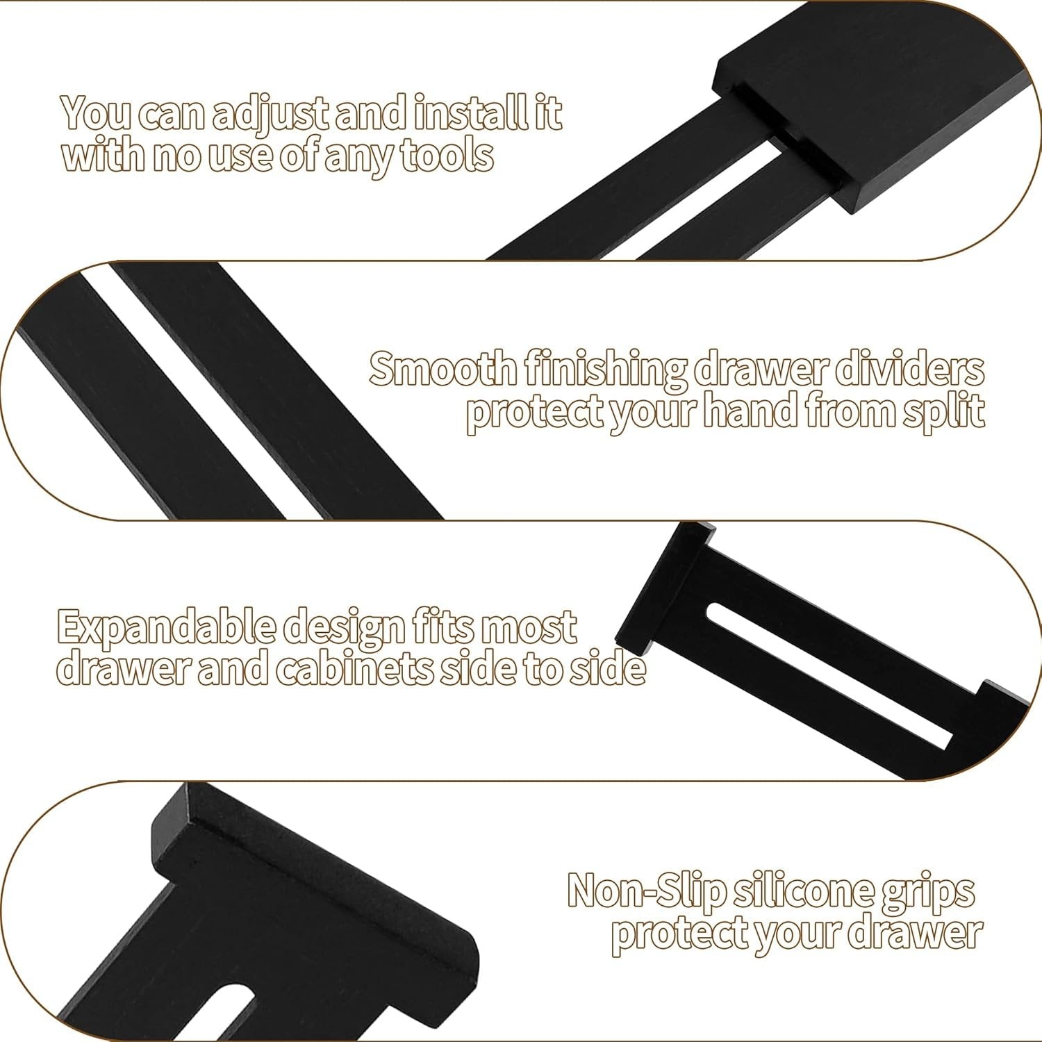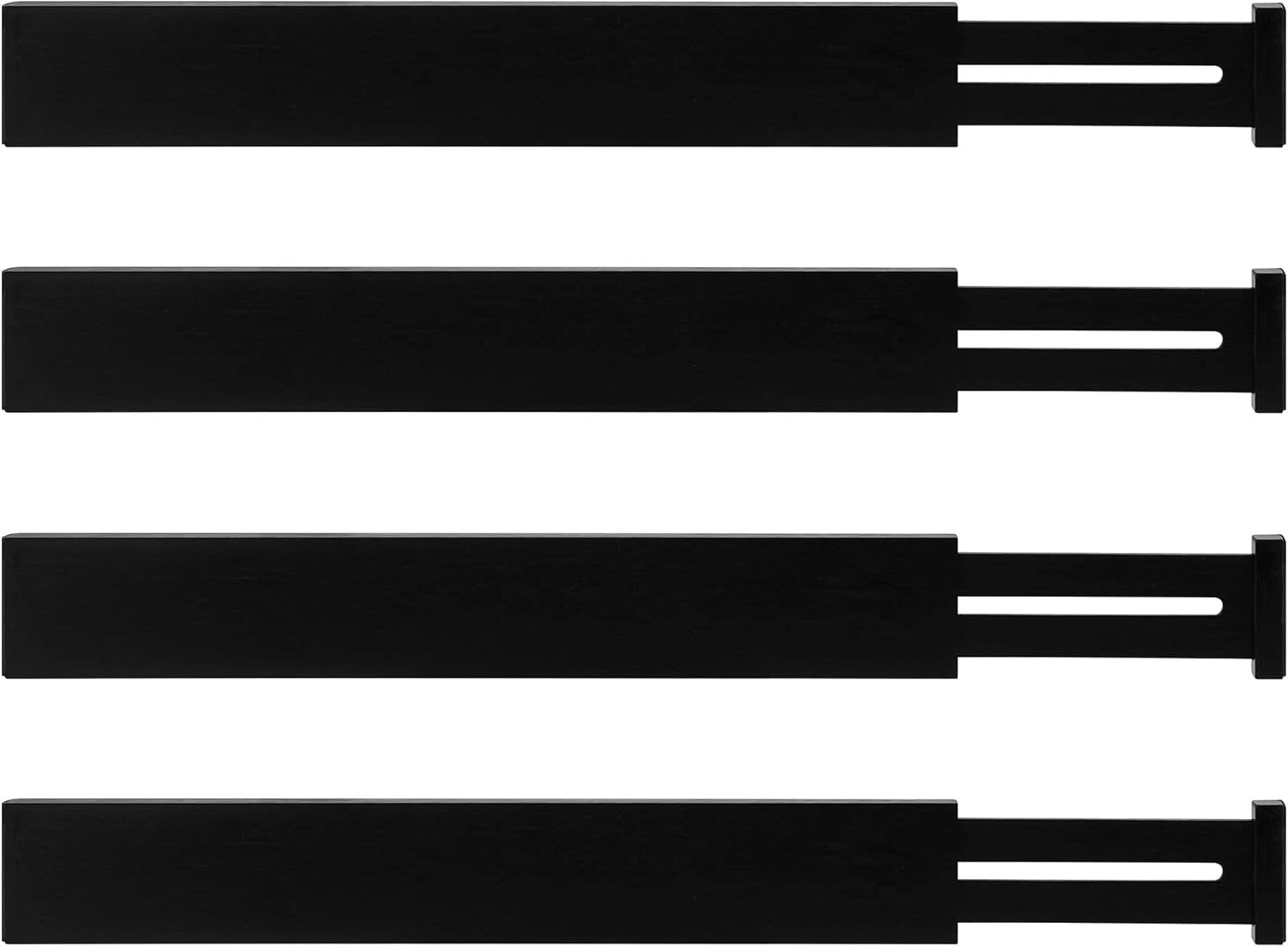 **Measure Your Drawers Before Buying!** This product is designed for drawers with an inner size of 45.2cm-52.3cm (17.8" to 20.6"). If your drawer's inner size exceeds 52.3cm (20.6"), it will not function properly. Drawers Dividers Size: The dividers are adjustable from 42.2cm-55.2cm (16.6'' to 21.7'') length, 6cm (2.36'') height Multipurpose Drawer Organizer: You can use Utoplike dividers to organize drawers in your kitchen, bathroom, bedroom, dresser, and even in your office. Perfect solution to keep everything in order and make your home look tidy Easy Installation & Removal: Each drawer divider has a built in spring to keep them in place and easy adjustment to meet your changing needs Well Design And Premium Material: Both ends of the divider are applied with rubber pads to protect your drawer and also the organizer itself. Organic moso bamboo features in durable and beautiful, all dividers are only made of premium A grade bamboo material