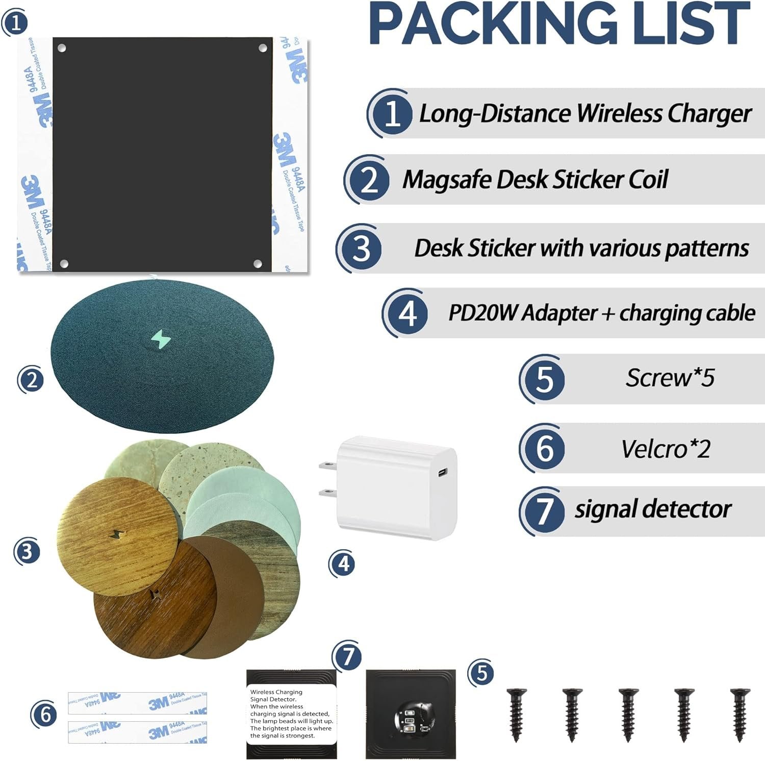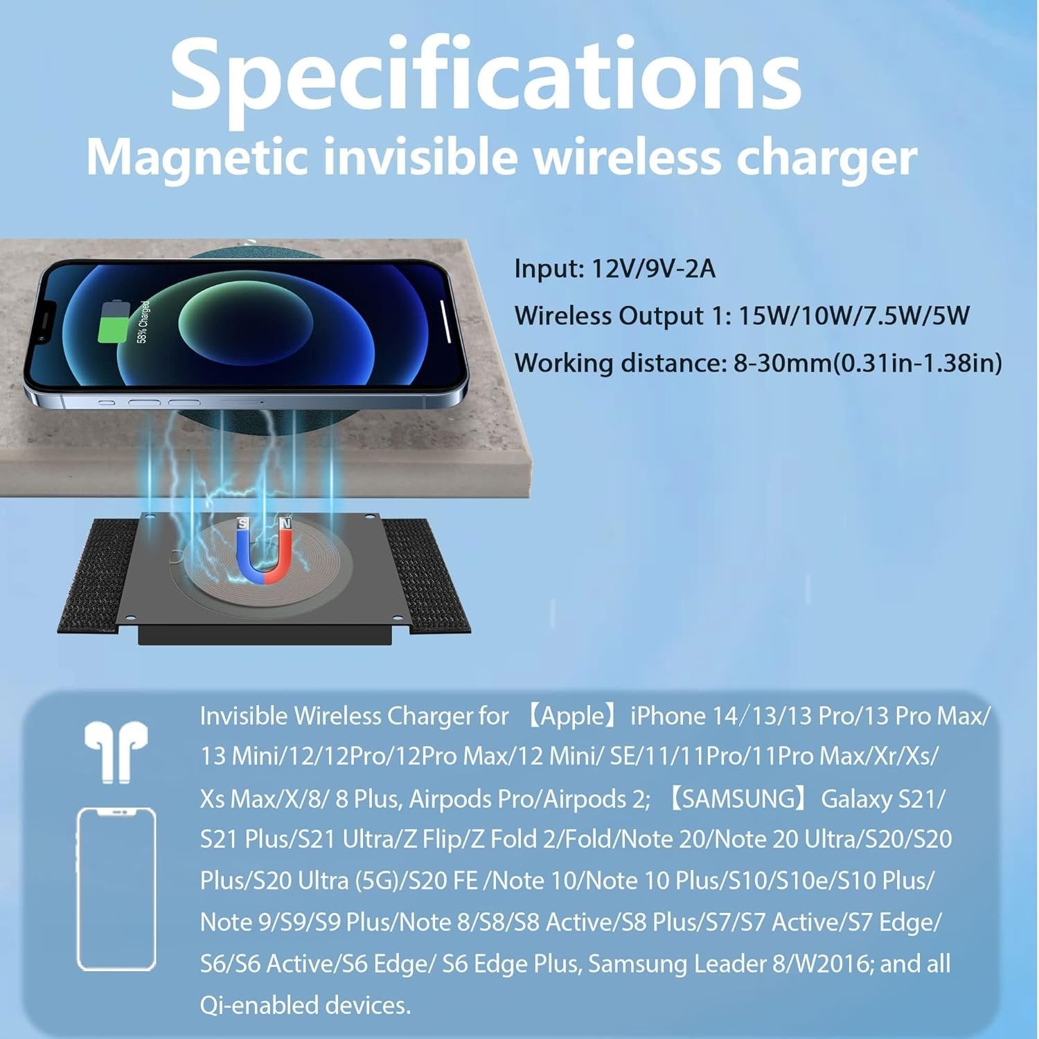 [Max 1.18-in charging distance] This invisible wireless charger under the table has a charging distance of 8-30MM (0.31-1.181inch) for desktop charging. If your charging distance is not within this range. Be aware that if it is too thin, you may damage your device. Suitable for installation under thick table tops. Suitable for non-metals such as marble, wood, glass, etc.with functions such as overcharge, overcurrent, overvoltage and FOD. For Magsafe Magnetic Desktop Sticker Coil Break through the industry difficulties. We were the first to add magnets to the desk sticker coils. magnetic version is suitable for iPhone 14/13/13 Pro/13 Pro Max/13 Mini/12/12Pro/12Pro Max/12 Mini, airpods3 , It also works with wireless charging for all other Qi charging enabled devices. [Velcro installation method] Design and then upgrade. There is no separate mounting bracket. There are also no large sheets of double-sided tape. No power tools/drills required. No specialized labor required. Peel off the release liner from the double-sided Velcro tape on the product. Stick it under your desk. The Velcro design is more flexible and can be installed elsewhere for product replacement. [A variety of table sticker patterns to choose from]: We have prepared a variety of patterns for you to choose from. You can mix and match yourself. The lightning bolt icon in the center of the coil on the table sticker. With luminous effect. even in the dark. You can also find it right away. [What you will get]: Long-distance wireless charger unite, PD adapter, desktop stickers with various patterns. UUMAO offers you the best wireless charger solution.