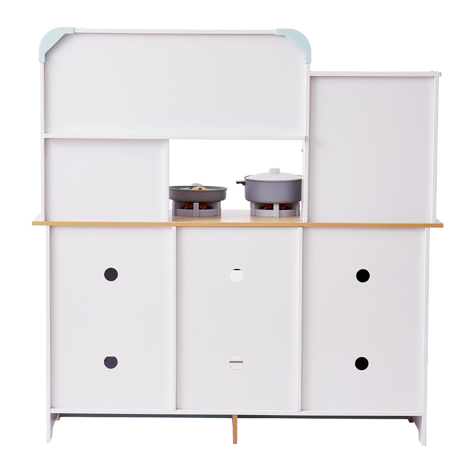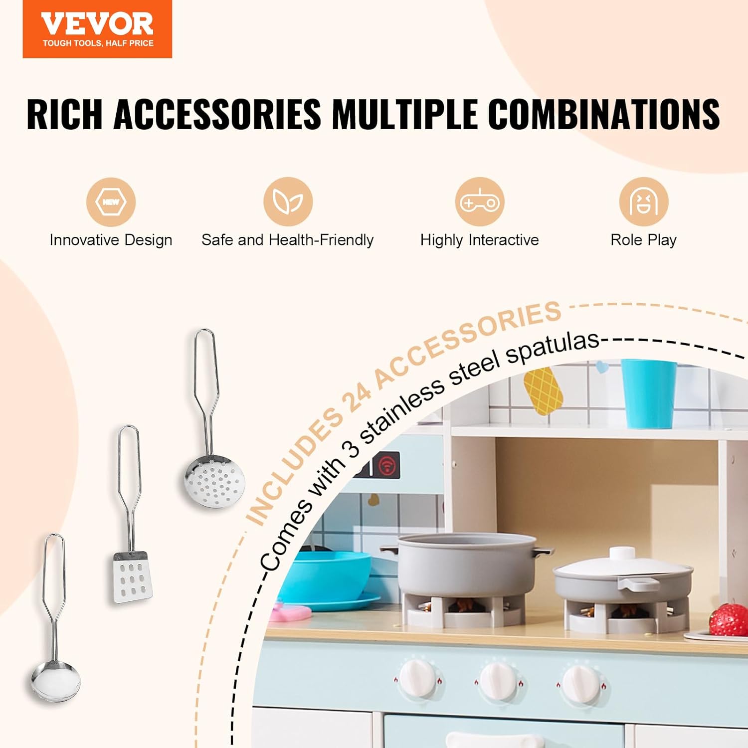 24 QUALITY ACCESSORIES - Our toy kitchen includes everything your little chef needs: 3 stainless steel spatulas, a pot, a pan, a cutting board, a fruit knife, a vegetable basket, a bowl, a basin, a water cup, an ice cube cup, a spoon, a fork, a knife and 9 realistic fruits and vegetables. IDEAL GIFT FOR KIDS - This kids kitchen set is perfect for little ones who like to imitate the preparation of the foods they see at home. Delivers immersive play moments while stimulating imagination and creativity. No Harmful Smell for Safe Play - Our kids kitchen set is made of healthy wood and harmless paint, ensuring a safe environment for your baby. With no harmful odours and playful design, it is perfect for hours of fun. EASY TO ASSEMBLE AND BUILT TO LAST - This toy kitchen set is built to last and comes with clear and simple instructions for quick assembly. Enjoy a durable toy that provides lasting gaming fun!