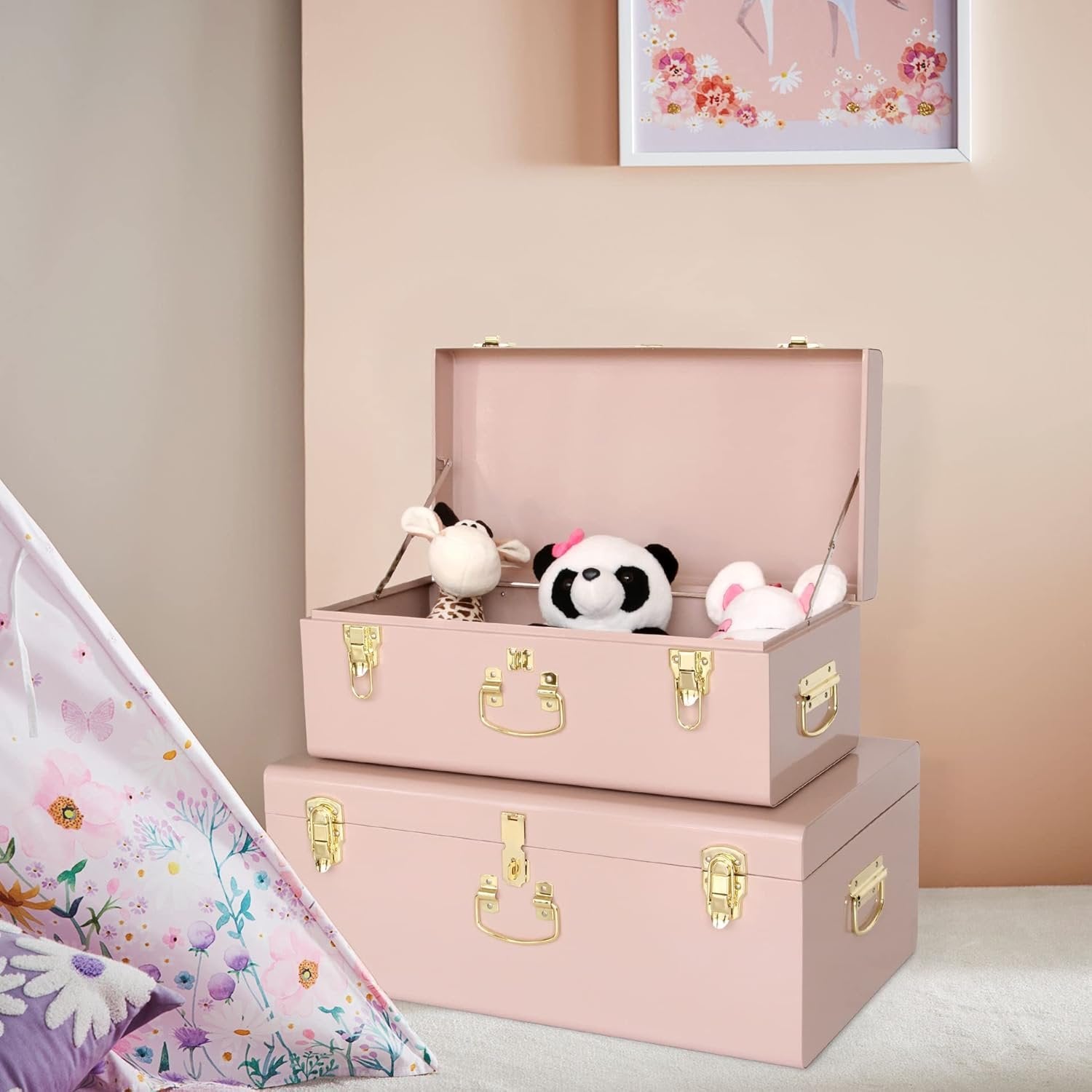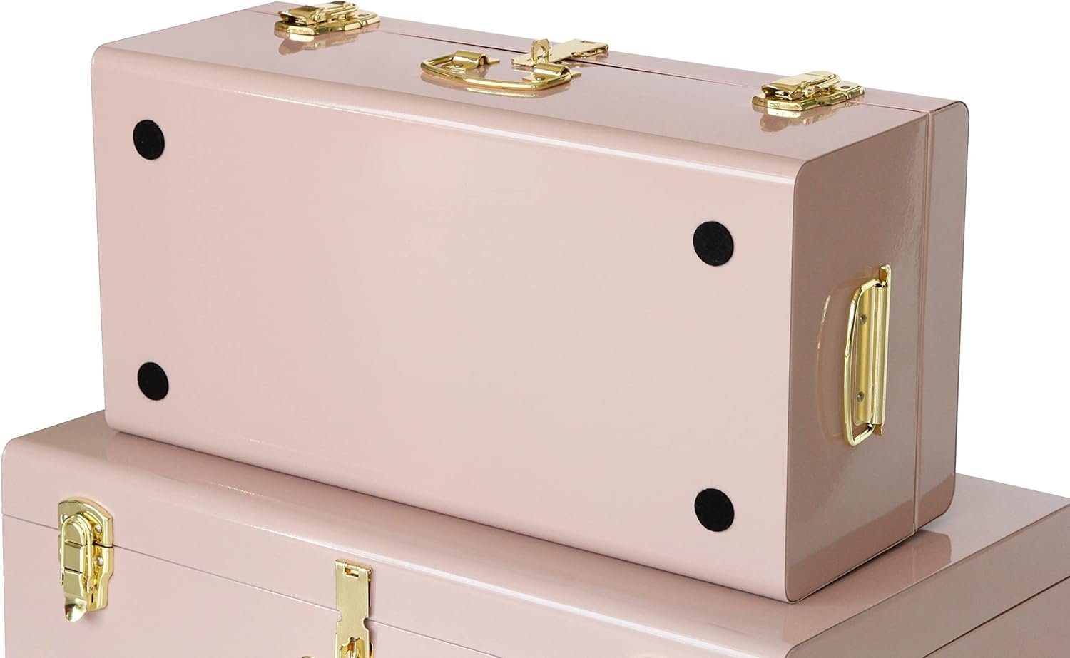 Brand-Vixdonos Colour-​Pale Pink​ Material-Iron Special feature-Lockable Vixdonos is a company specializing in home decoration products. Most of our products are handmade, paying attention to every detail, following the fashion trend, creating a more convenient and comfortable living environment for customers, which is our constant pursuit. MODERN EXTERIOR DESIGN:The metal storage box set consists of two different macaron color storage boxes, which are beautiful and elegant in appearance.Thanks to a specialized streamlined design,this lightweight storage footlocker is the perfect size to save even more space in your home by storing it under your bed, in the closet, or in the garage. DURABLE METAL ACCENTS:Sturdy nailhead rivet hinges are durable enough to withstand the wear and tear of daily use. These back hinges are designed with real metal for high quality construction that won't bend, break, or snap under pressure. SECURE LOCKING CLASPS:The clasps on this sturdy trunk keep your belongings safe! Secure latch clasps on the front of this locking trunk offer added security, making this storage trunk a functional and safe place to keep your personal belongings. SUNKEN MOVING HANDLE:Handles are set into the sides of this useful trunk for extra space saving capabilities. They also allow for easy transportation so this armored trunk can be moved and stored without any hassle. SIZE:Small - 20.5" X 10.3" X 7.9" , Large - 23.7" X 14.2" X 9.5" specification, One of the best parts about this durable trunk is its use as a functional storage piece! This armored trunk is perfect to keep extra bedding, clothes, or even a secret snack stash, out of the way but easy to access.