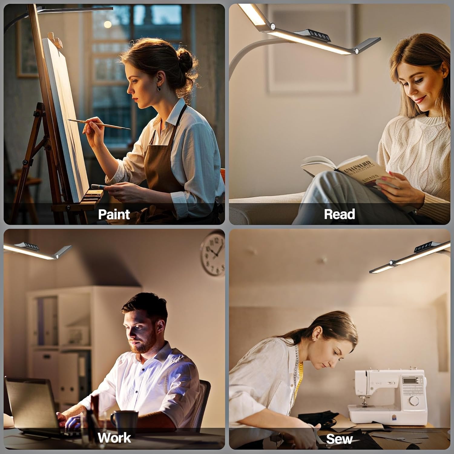 ▲Extension & Folding Design: LED desk lamp features an extended super-bright light strip. Measuring 69cm in length and boasting 1500 lumens, it effectively illuminates large desks or multitasking workspaces. The light strip can be folded upwards 180° and downwards 45° on both sides, offering a broader illumination range. ▲Five-speed Colour Temperature & Brightness Adjustment: Desk light offers five colour temperature settings (3200K - 6500K) and five brightness levels (20% - 100%). With the included remote control, you can effortlessly select the ideal lighting effect from a distance. ▲360° Rotation & 180° Height Adjustment: Equipped with a rotatable base, the desk lamp home office enables 360° rotation of the light direction. Its gooseneck tube allows for 180° height adjustment (reaching a maximum height of 70cm), meeting your lighting needs in various environments. ▲Multi-eye Care Design: The clamp lamp incorporates advanced 45° tilt lighting and a high colour-rendering index (CRI>90). This design ensures that the light only illuminates your desktop and keyboard, avoiding direct exposure to the screen and reducing blue-light emissions. As a result, it effectively relieves eye fatigue, providing long - term, comfortable illumination for work and study. ▲Ambient Lighting and Sensor Lighting: When directed upwards, the office lamp functions as ambient lighting, facilitating office work and alleviating eye strain. Thanks to its built - in sensor, in sensor mode, the lamp automatically lights up when someone sits down or raises their hand near the light strip, eliminating the need for manual operation. ▲Durable & Easy & Stable: The study lamp has a lifespan of over 20,000 hours, ensuring long - term lighting service. The included remote control makes remote adjustment convenient. The clip - on design keeps the lamp secure even when bumped. The wire outlet is protected by a rubber sleeve, preventing scratches and providing enhanced safety.