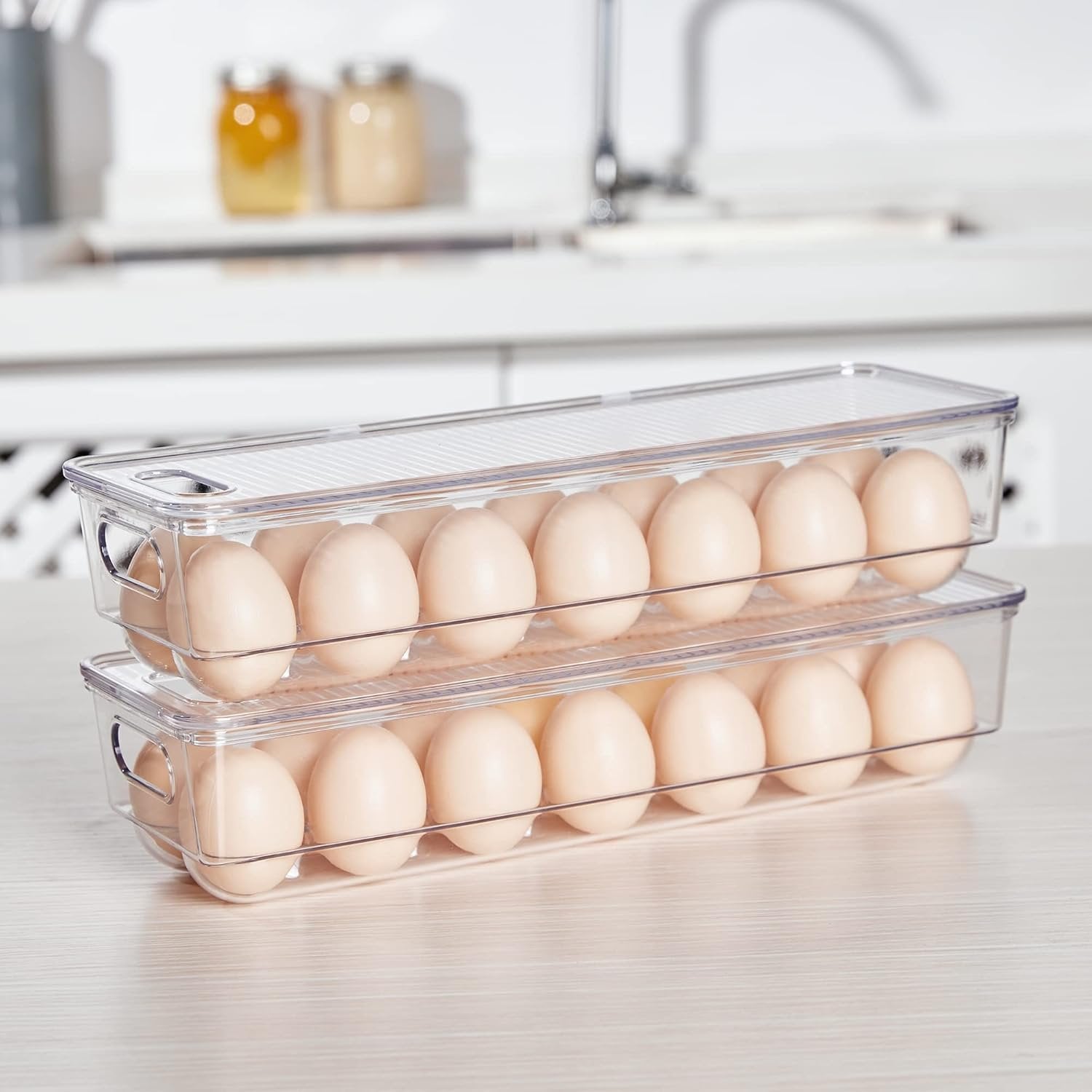 [Premium Egg Holder for Fridge] The egg containers are sized 13.5x4.3x3 inches, made of durable high quality shatter proof BPA free polyethylene material. Not easy to bent. The slots fit the egg storage well to avoid unstable and cracking while moving. [Convenient to Take and Clean] Remaining eggs can be figured out at a glance through this clear egg tray. The opening design in the body and lids of it makes you take eggs more conveniently. The design of the round edge makes the egg holder easy to clean and the dust will not remain in the crevices. Please wash it by hand. NO DISHWASHER SAFE. NO MICROWAVE SAFE. [Stackable & Space Saving] The egg container can organize the cluttered eggs of your fridge, saving more space. The rigid lids let you stack somethings available on top of the container, maximizing the space of your refrigerator. [Wide Application] The egg holder is perfect for pantry, fridge, cupboard, etc. Be portable, so it can be applied for your picnic or camping. It’s also a great Xmas gift for your mom, grandmother, and friends.